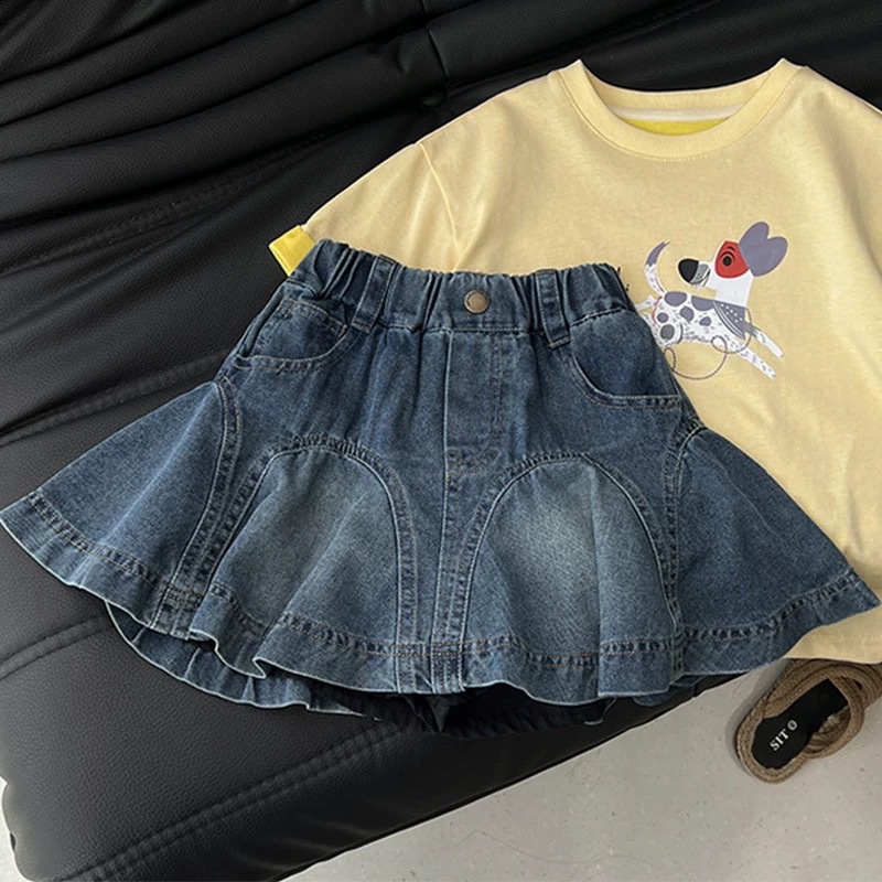 한국 아동복 소녀 짧은 치마 2025 여름 새로운 스타일 세련된 러플 스커트 어린 소녀의 데님 스커트