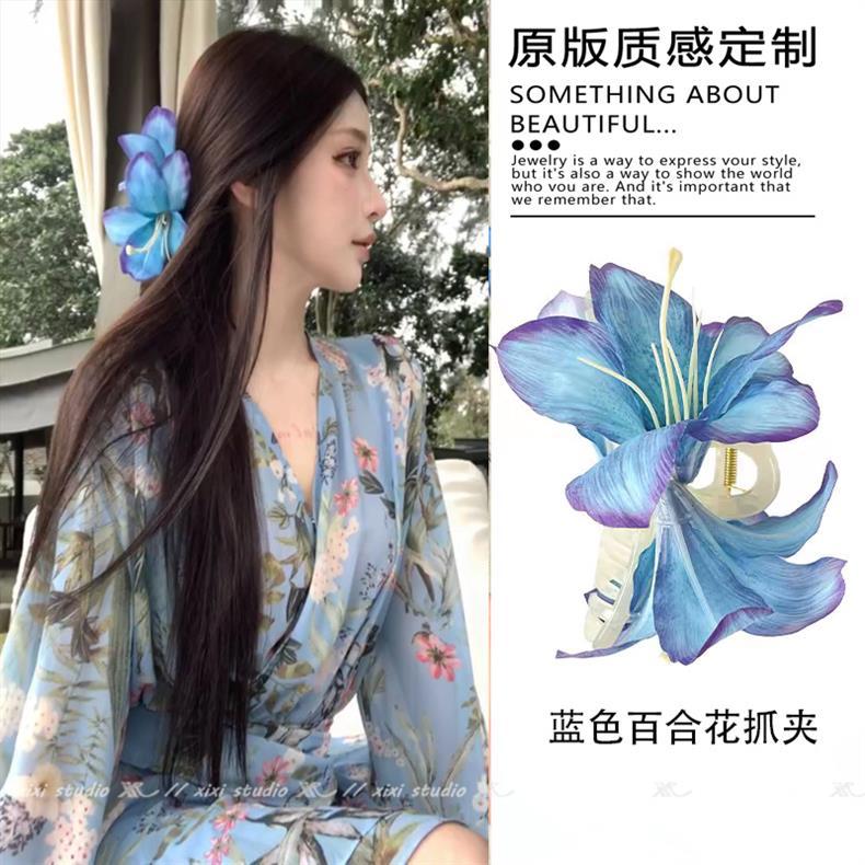 고급스러운 블루 릴리 꽃 집게, 슈퍼 요정의 아름다운 머리핀, 대형 상어 집게, 분위기 있는 머리 집게, 사진 촬영용 헤어 액세서리스토어 가기