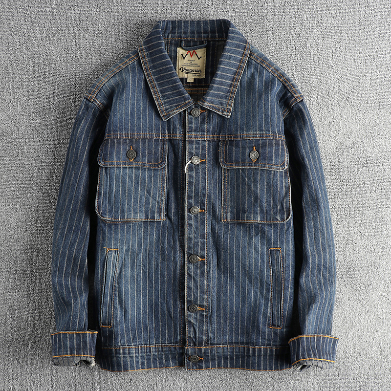 Ame 카키 레트로 워시 올드 스트라이프 데님 재킷 남성용 편안한 루즈 캐주얼 청소년 아메리칸 재킷스토어 가기