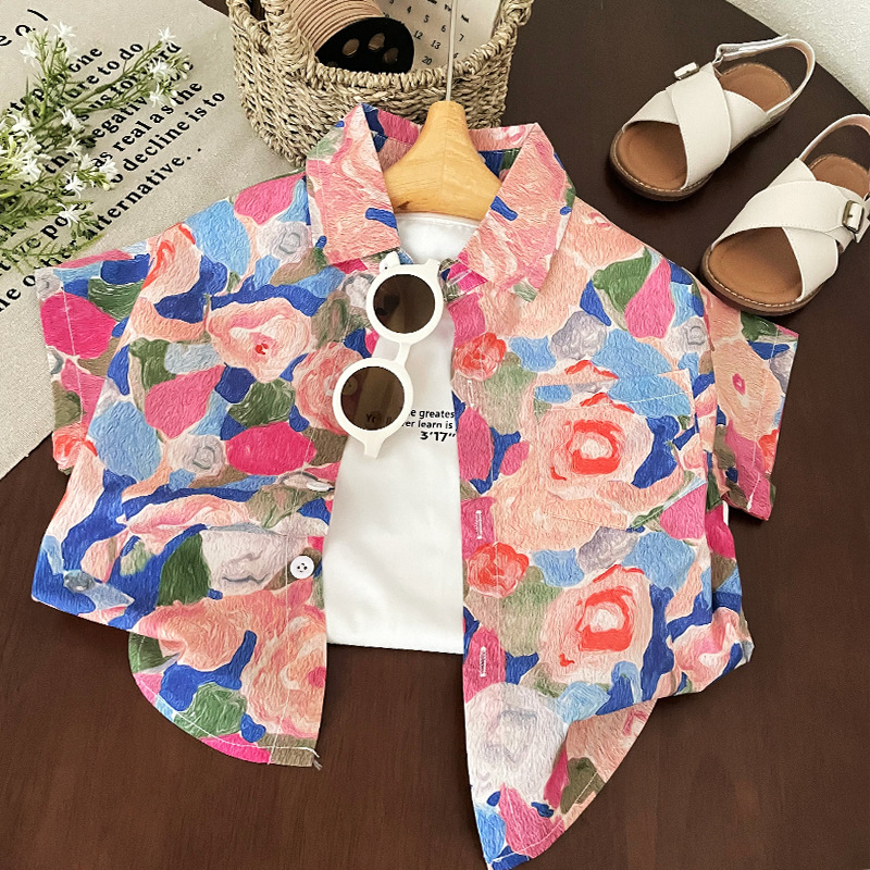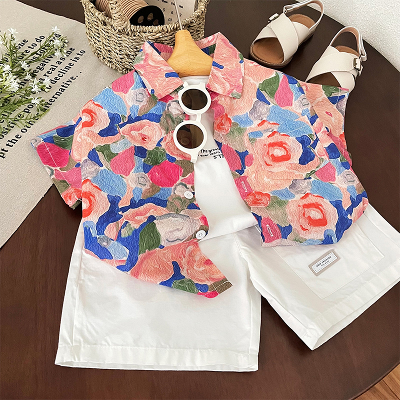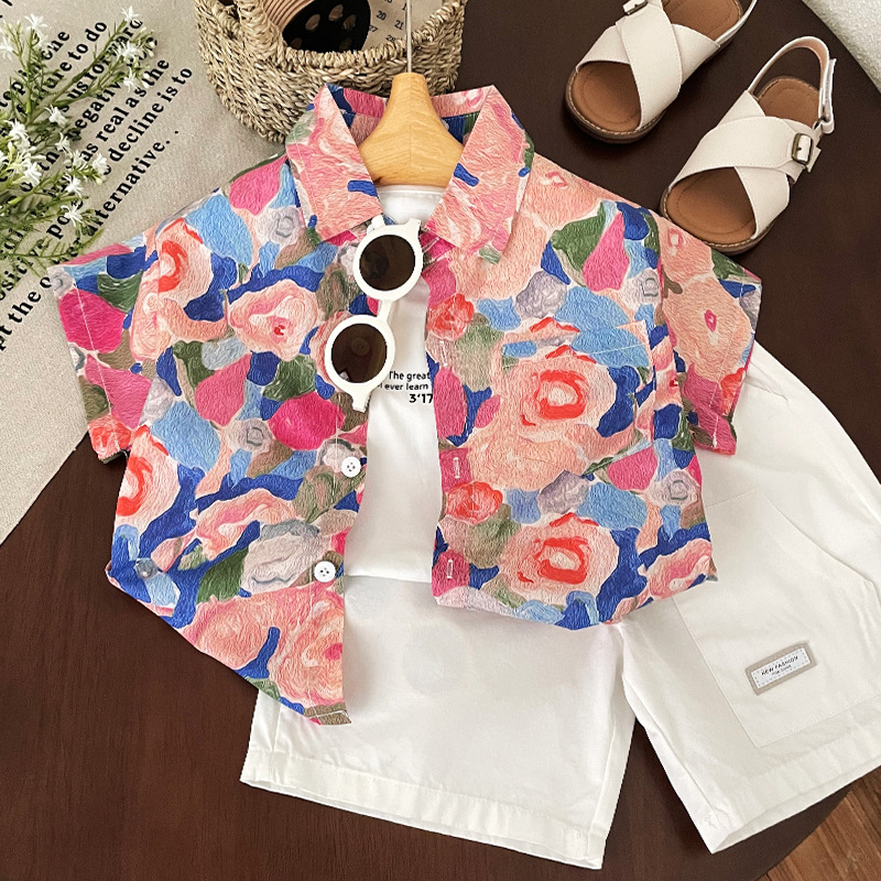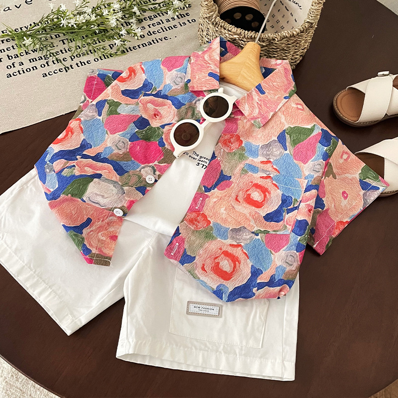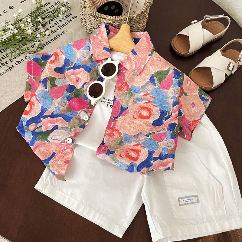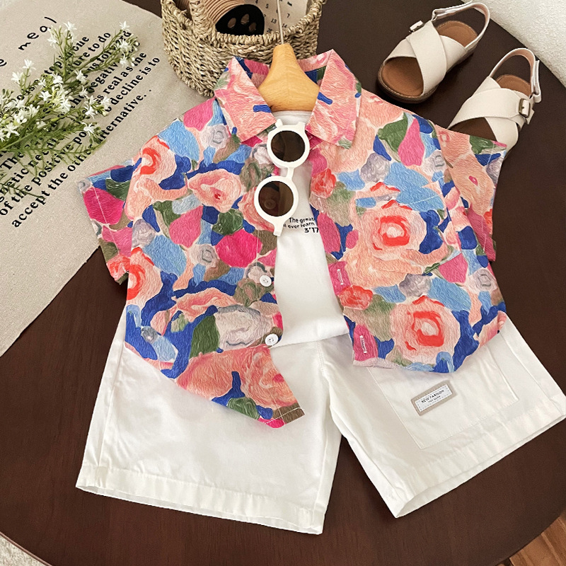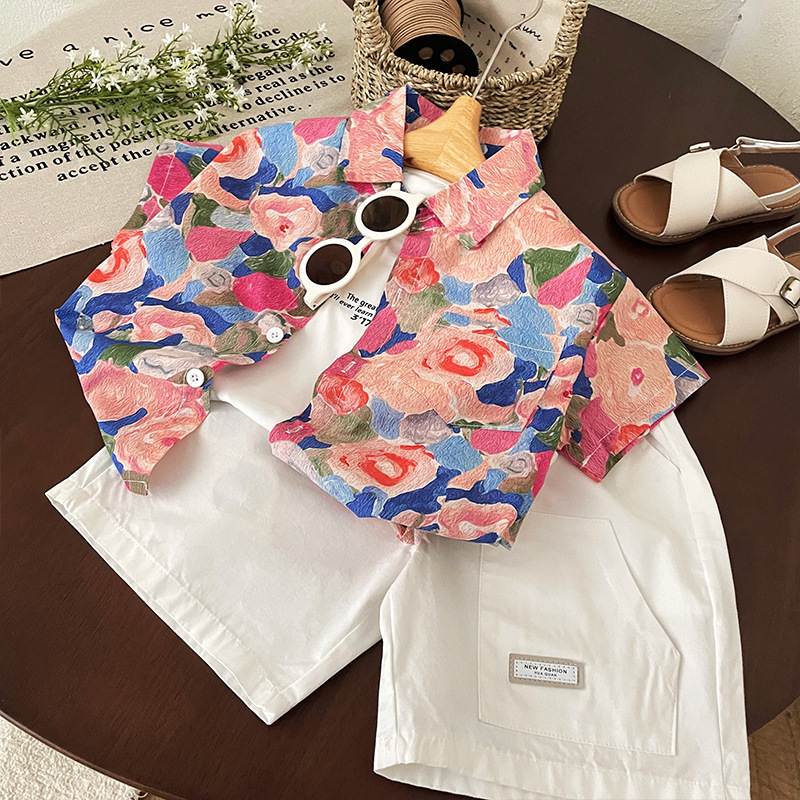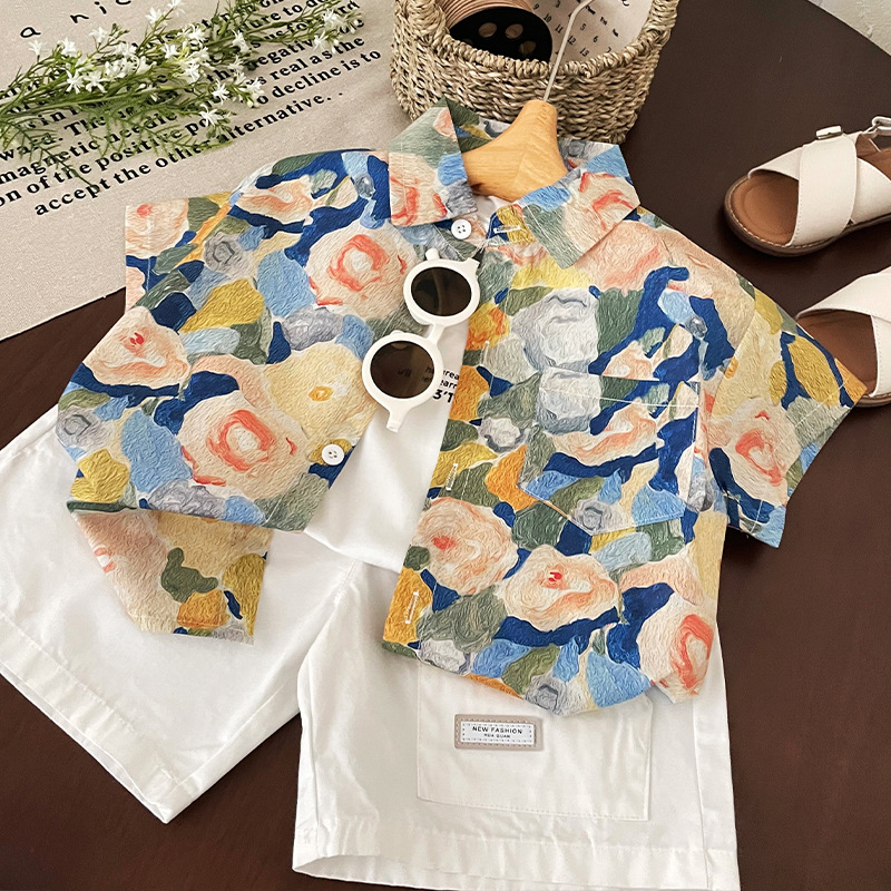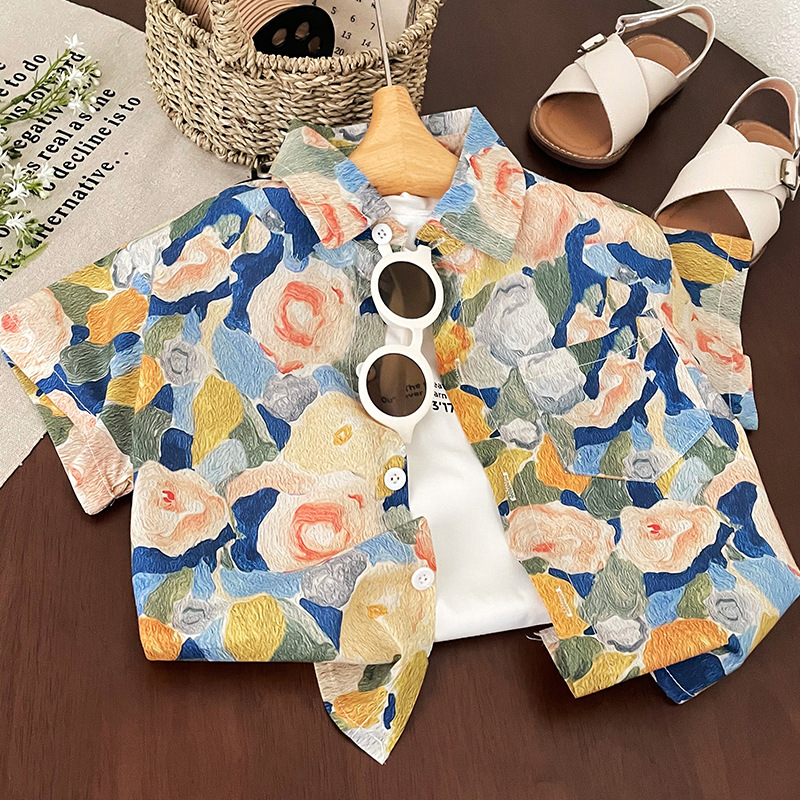 소년 반팔 셔츠 2025 여름 새로운 어린이 복고풍 캐주얼 홍콩 스타일 아기 여름 탑 휴가 카디건스토어 가기