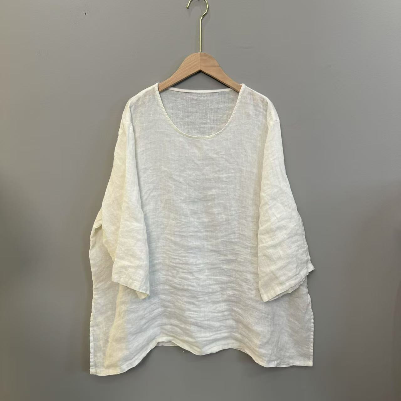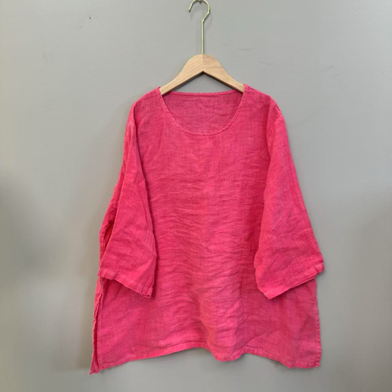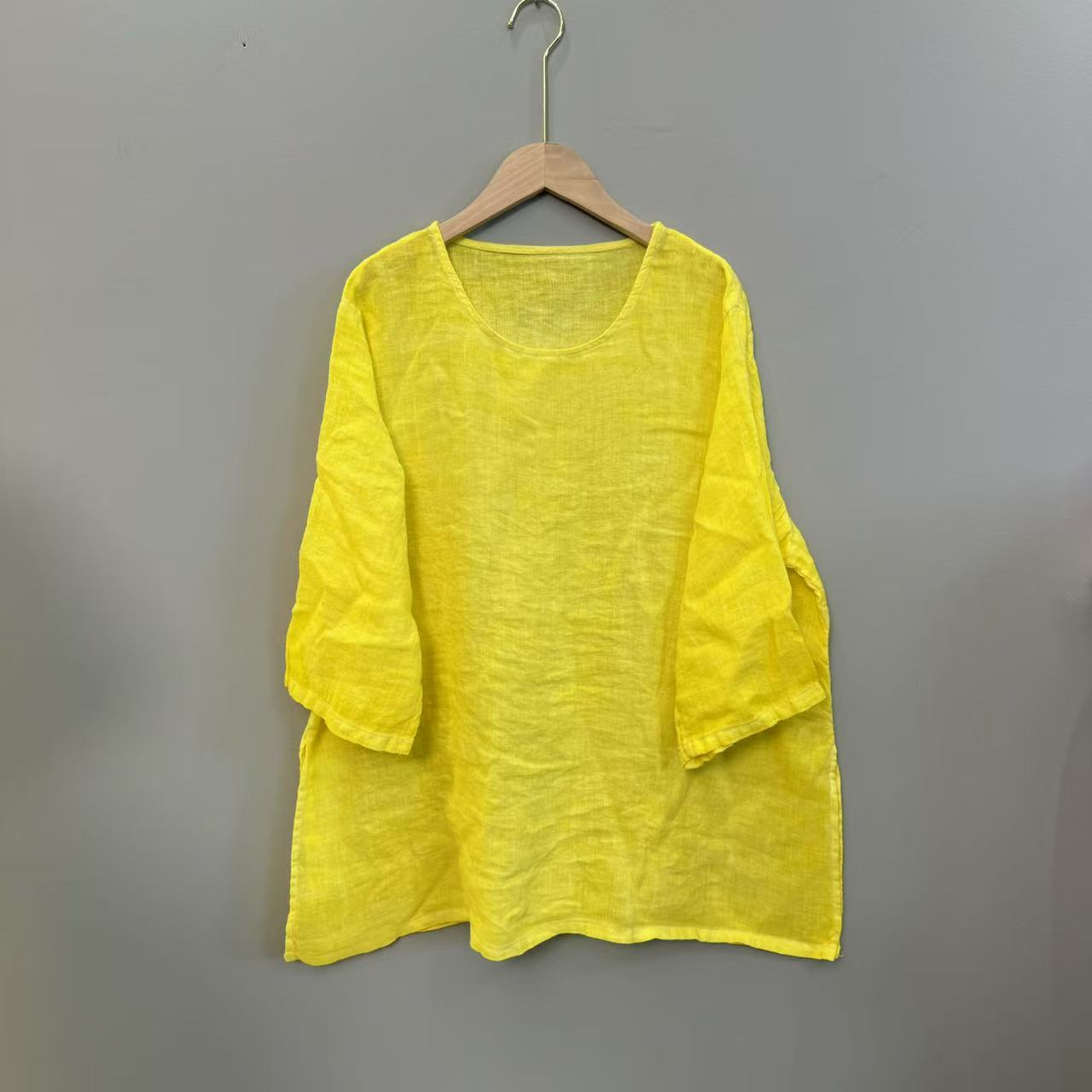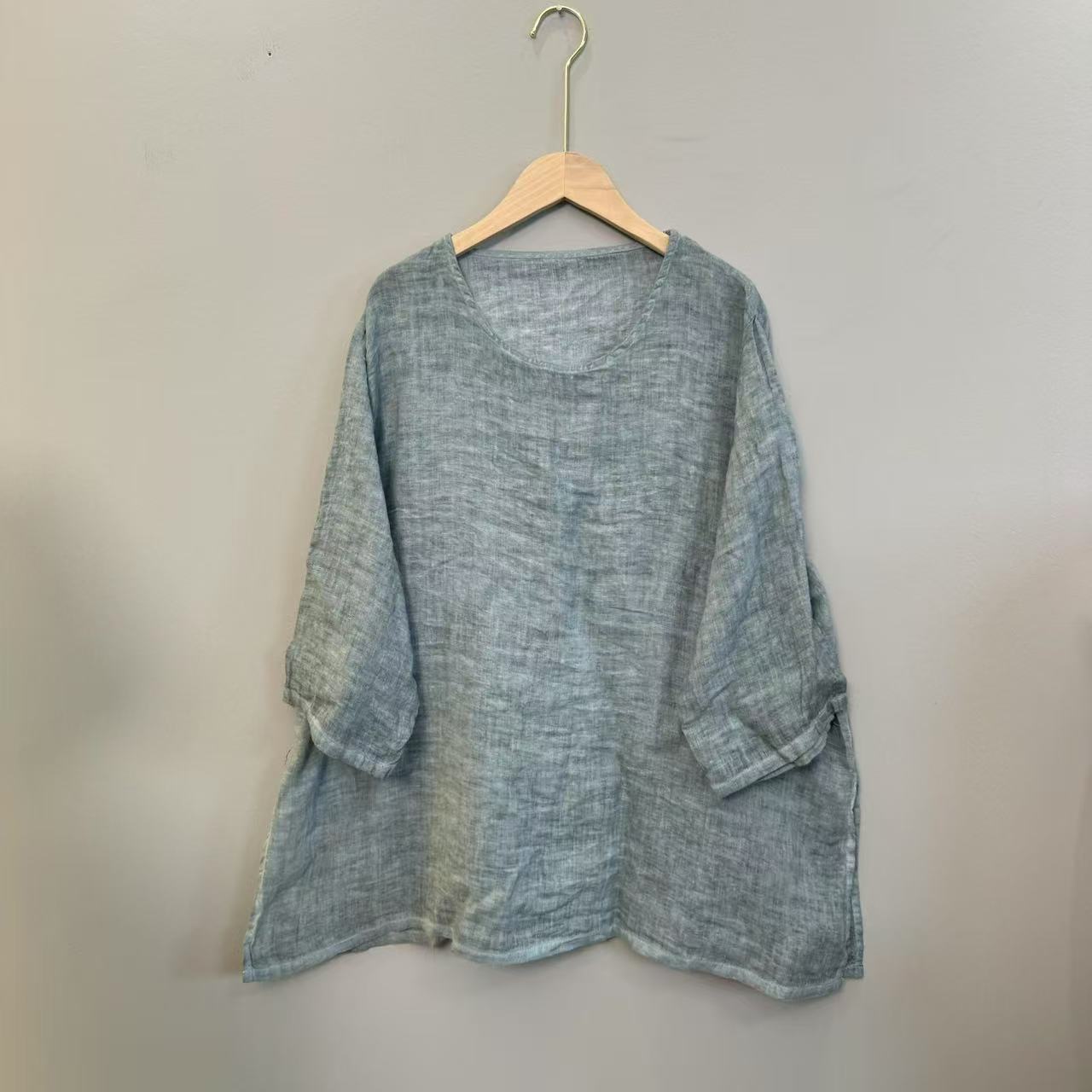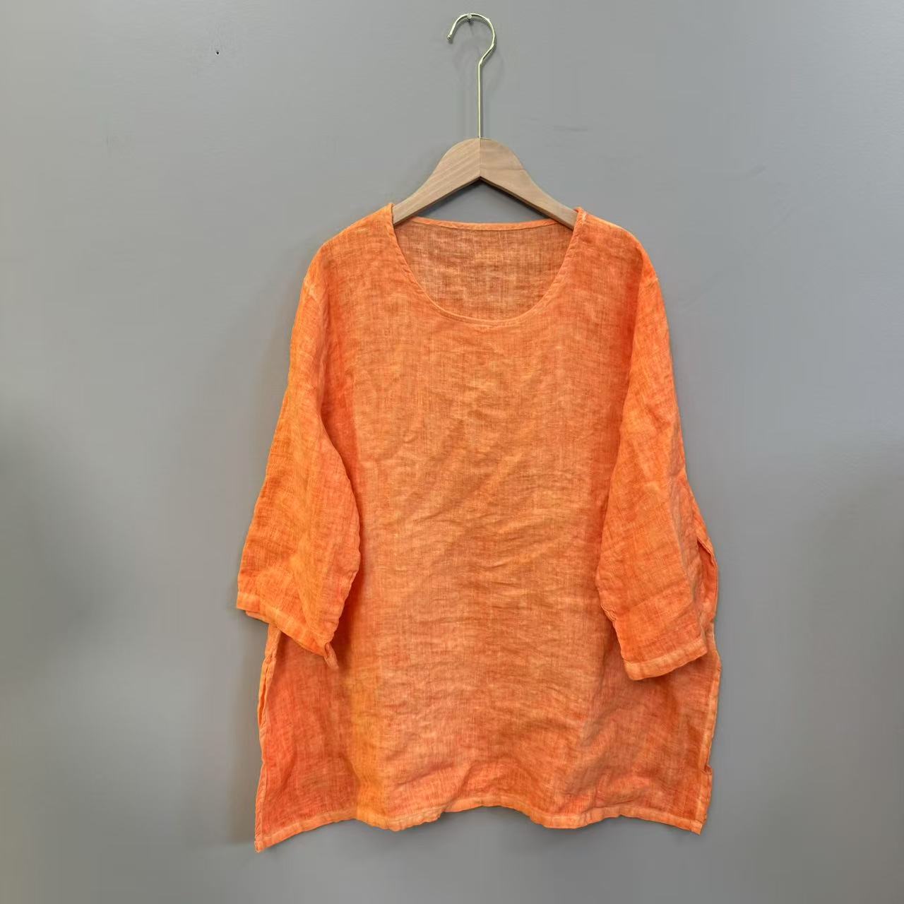 희소 리넨 더러운 염색 공예 간단한 둥근 목 셔츠 풀오버 모든 경기 느슨한 2025 봄과 여름 새로운 탑 작은 셔츠