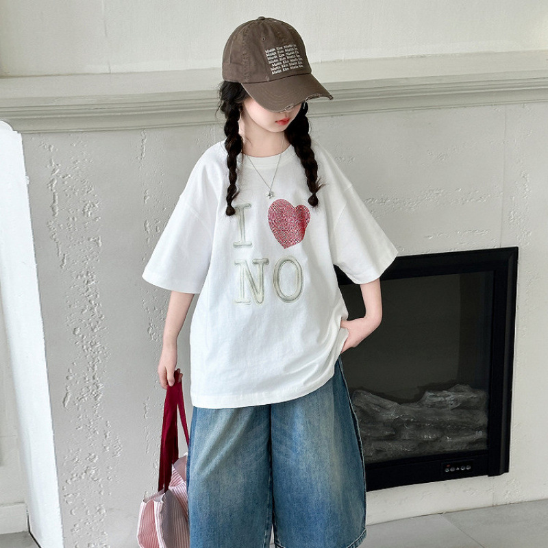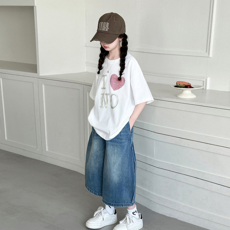 소녀의 뜨거운 시추 사랑 반팔 세트 2025 년 여름 새로운 큰 어린이 유행 티셔츠 어린이 여름 데님 바지
