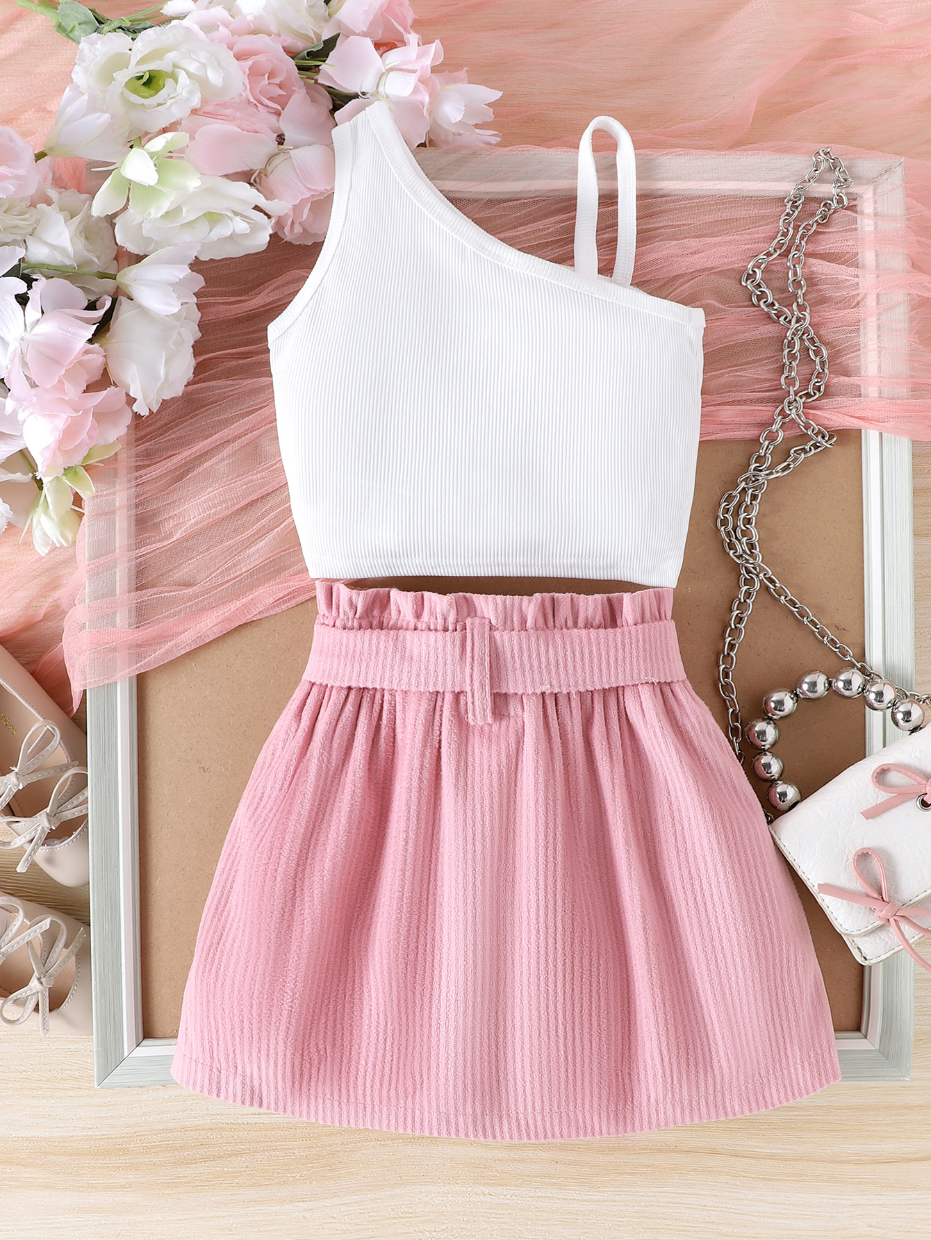 유럽과 미국의 국경 간 여름 귀여운 소녀 세트 중소 어린이 비스듬한 어깨 끈 스커트 액세서리 벨트