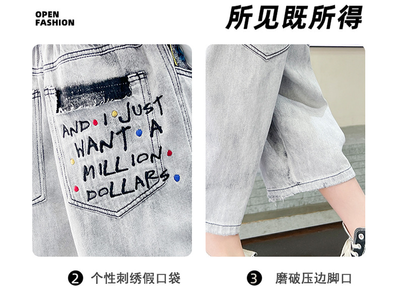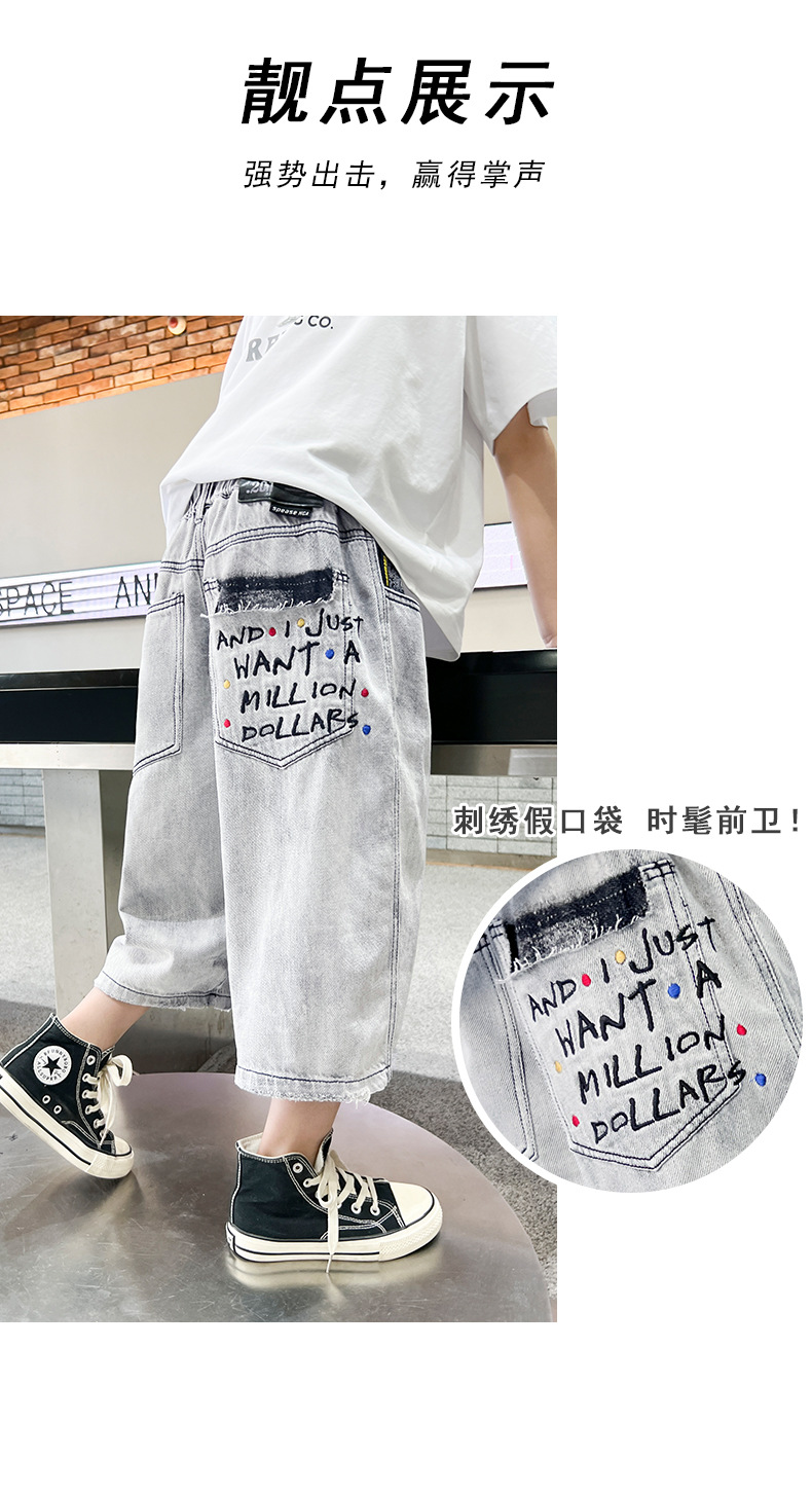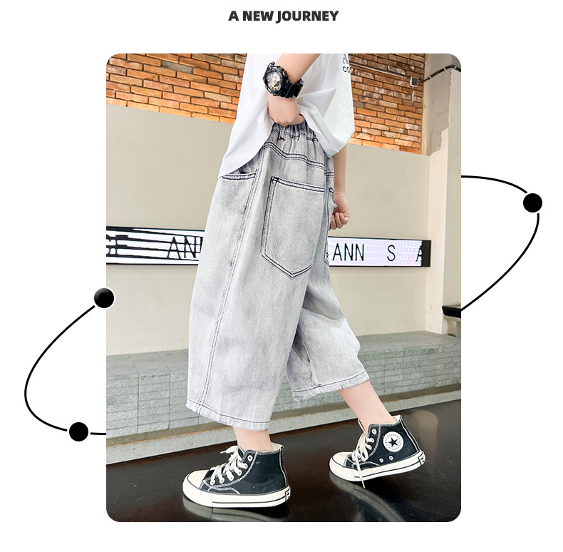 어린이 소년 바지 데님 반바지 여름 얇은 2025 새로운 도착 중대형 소년 여름 잘린 트렌디 바지