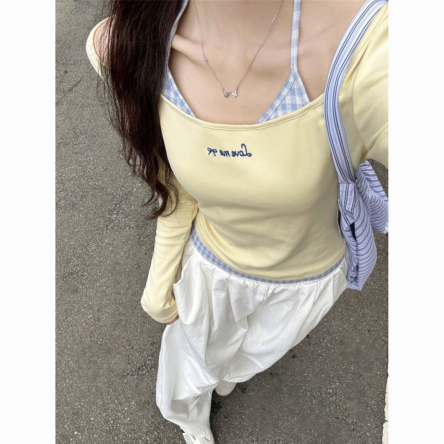 노란색 한국 스타일 긴팔 봄 새 어깨 레이스 업 티셔츠 어깨 페이크베이스 두 달콤하고 핫 슬림 핏 쇼트 탑스토어 가기