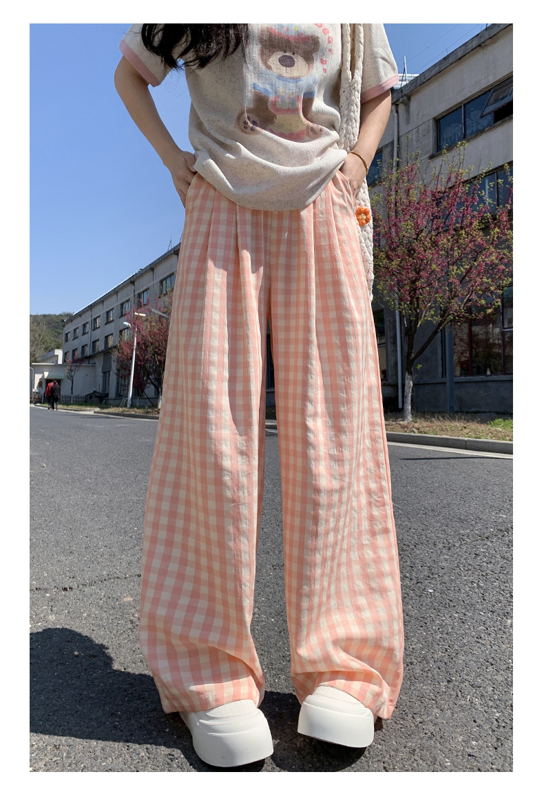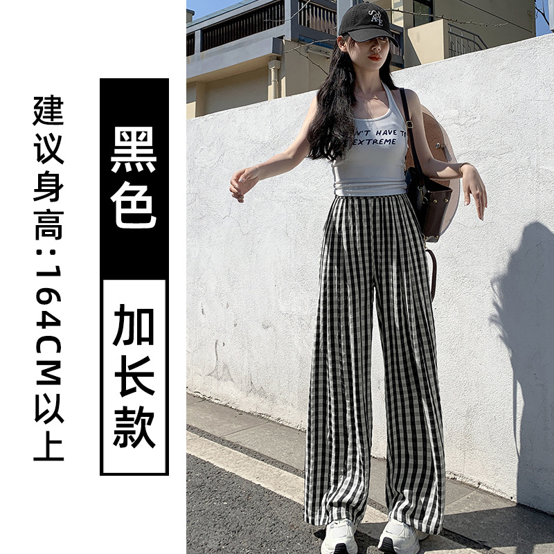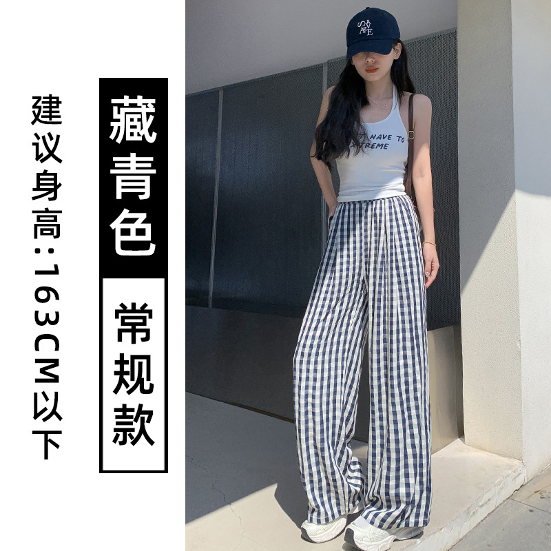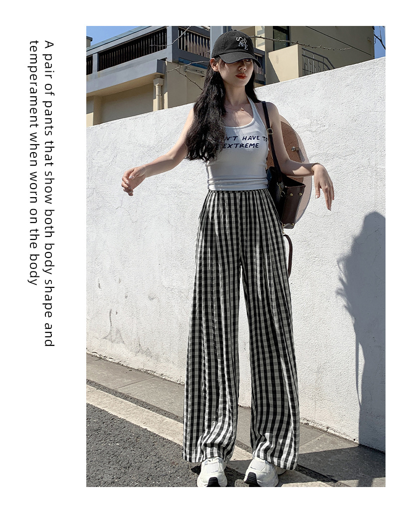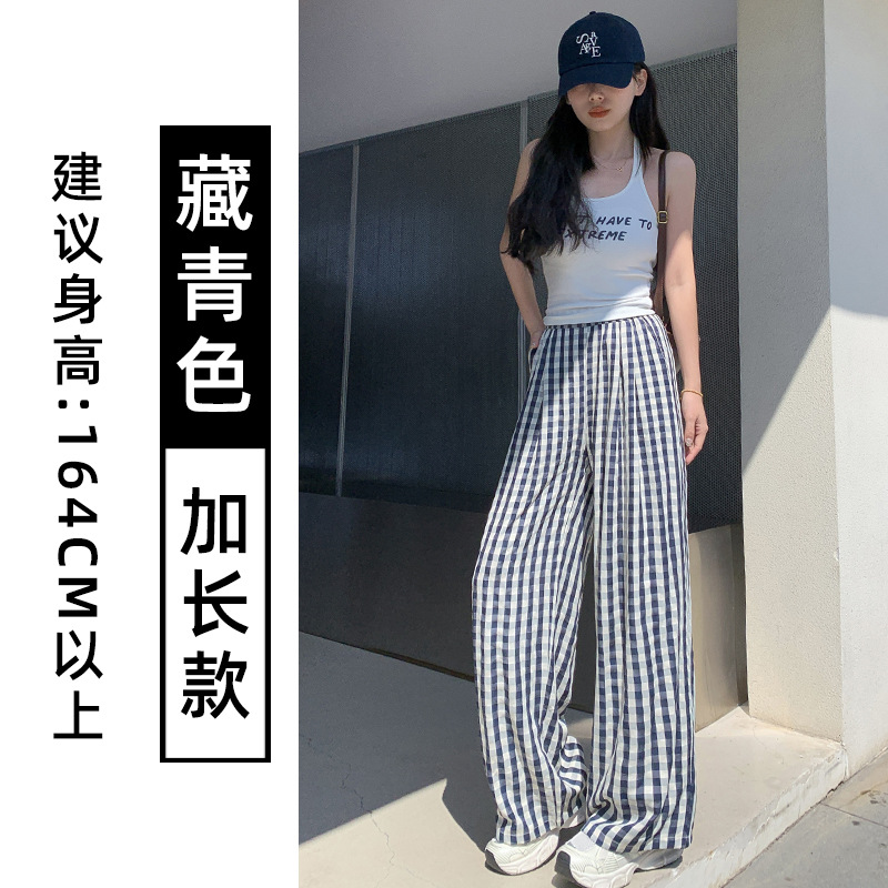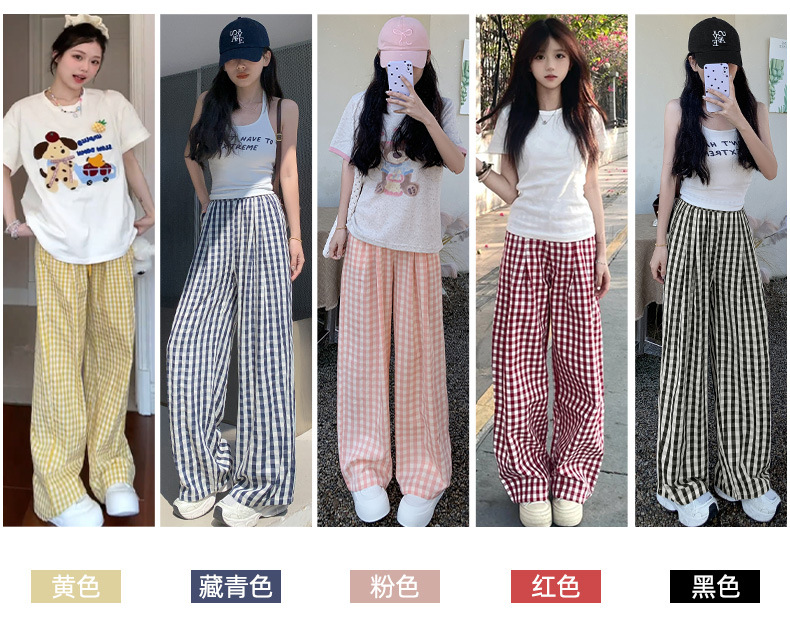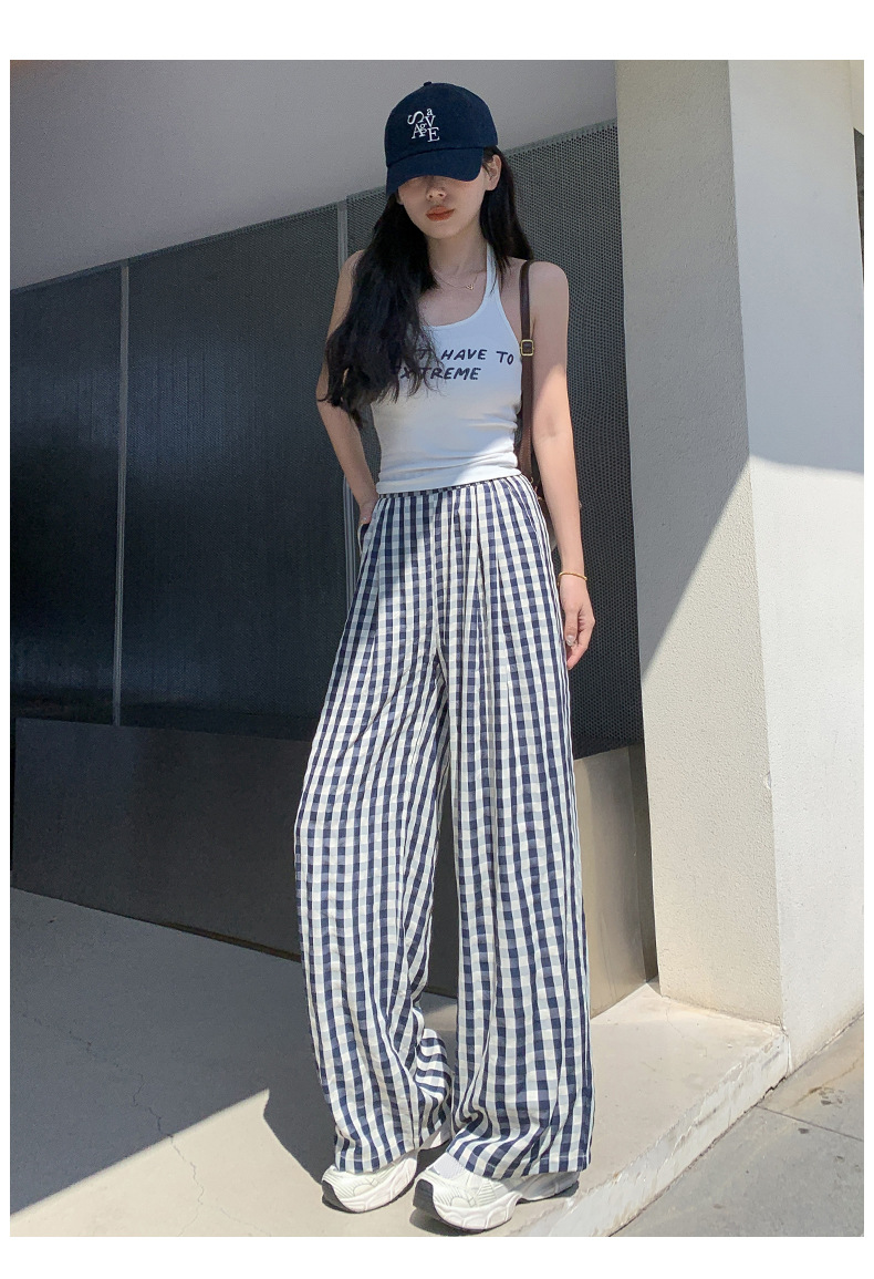 노란 격자 무늬 바지 여성 여름 2025 새로운 높은 허리 슬리밍 느슨한 복용량 캐주얼 스타일 아이스 실크 선 스크린 와이드 다리 바지스토어 가기