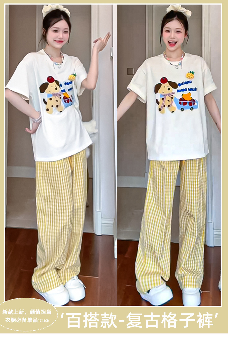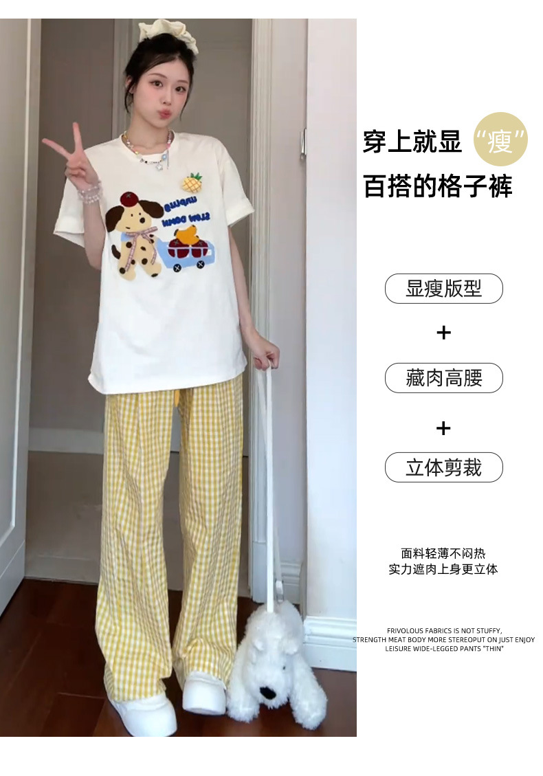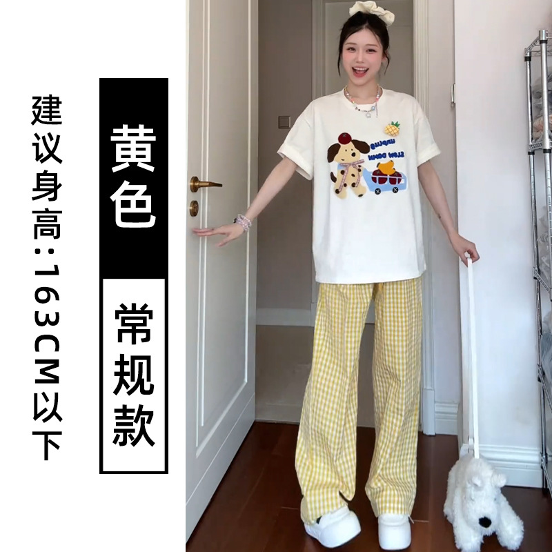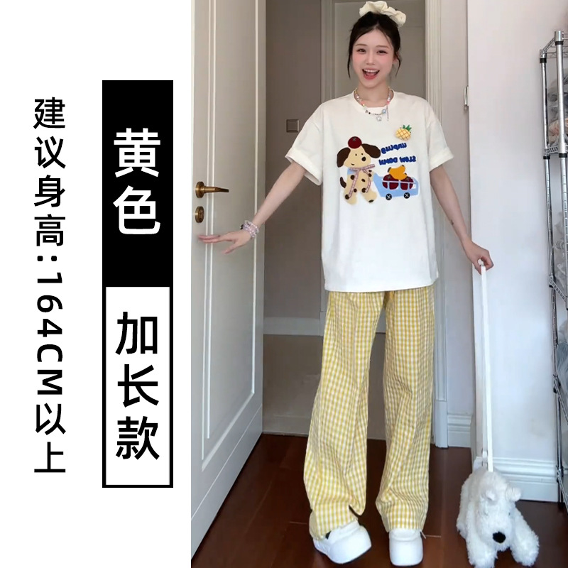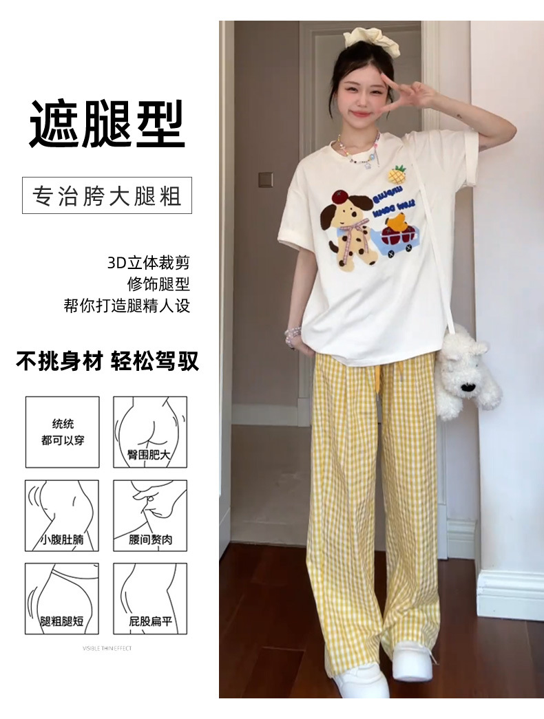 노란 격자 무늬 바지 여성 여름 2025 새로운 높은 허리 슬리밍 느슨한 복용량 캐주얼 스타일 아이스 실크 선 스크린 와이드 다리 바지