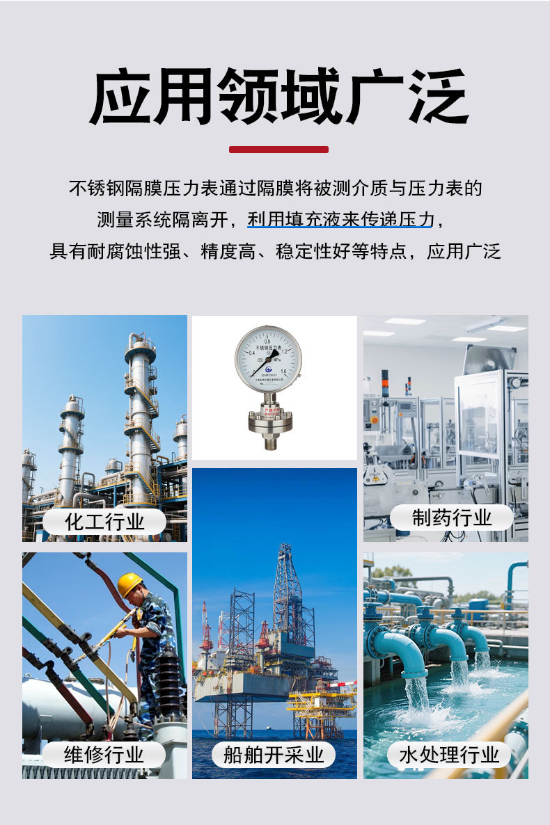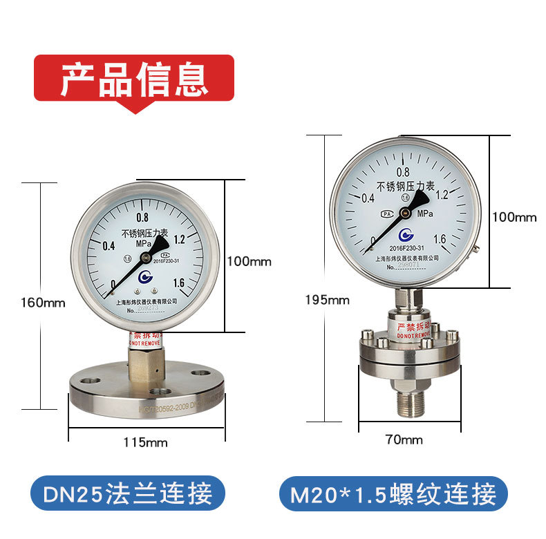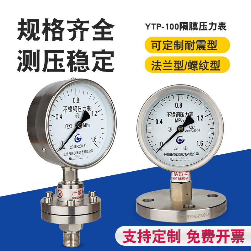스테인레스 스틸 다이어프램 압력 게이지 YTP-100 충격 방지 플랜지 연결 막힘 방지 수압 공기압 부식 방지 산 및 알칼리 방지