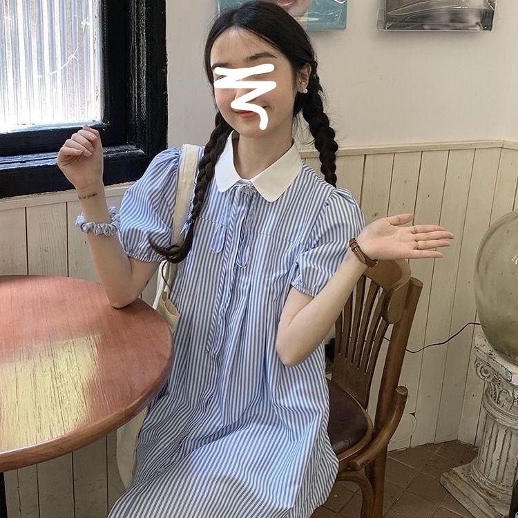 인형 칼라 블루 스트라이프 셔츠 원피스 여성의 2024 여름 새로운 스타일 도파민 착용 간단한 우아한 치마스토어 가기
