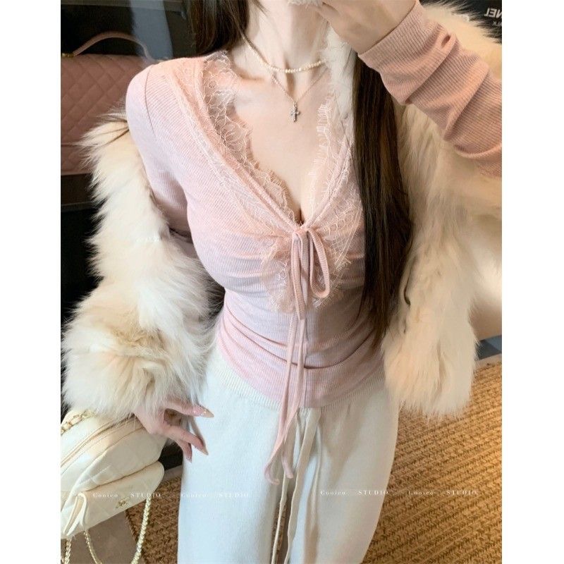 슬림핏 세련된 긴 소매 최고 순수 V-넥 레이스베이스 셔츠 스트랩 보우 티셔츠 여성용 봄과 가을 뉴스토어 가기