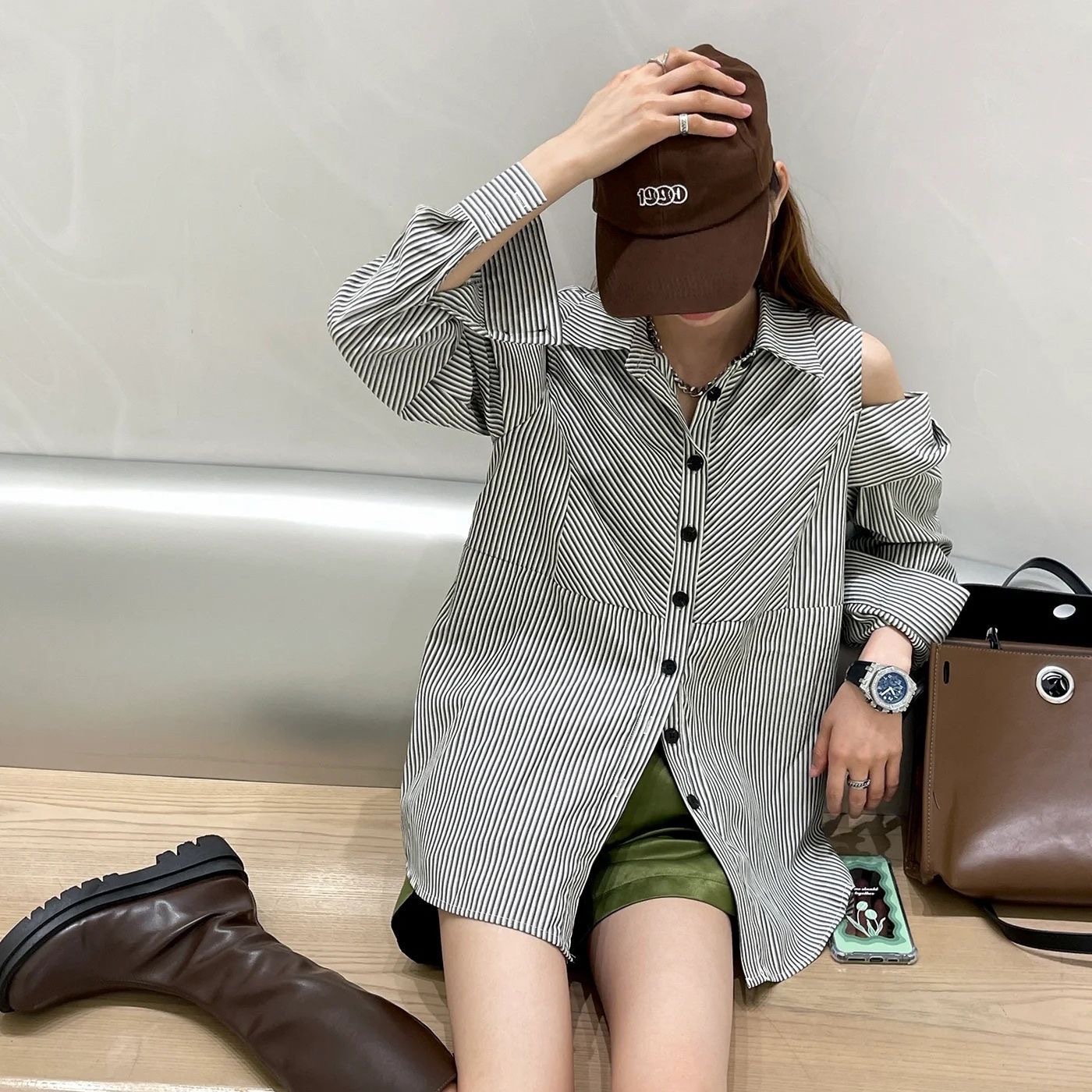 프렌치 할로우 아웃 숄더 2025 봄 새로운 섹시한 우아한 디자인 센스 니쉬 게으른 스트라이프 긴 소매 셔츠스토어 가기