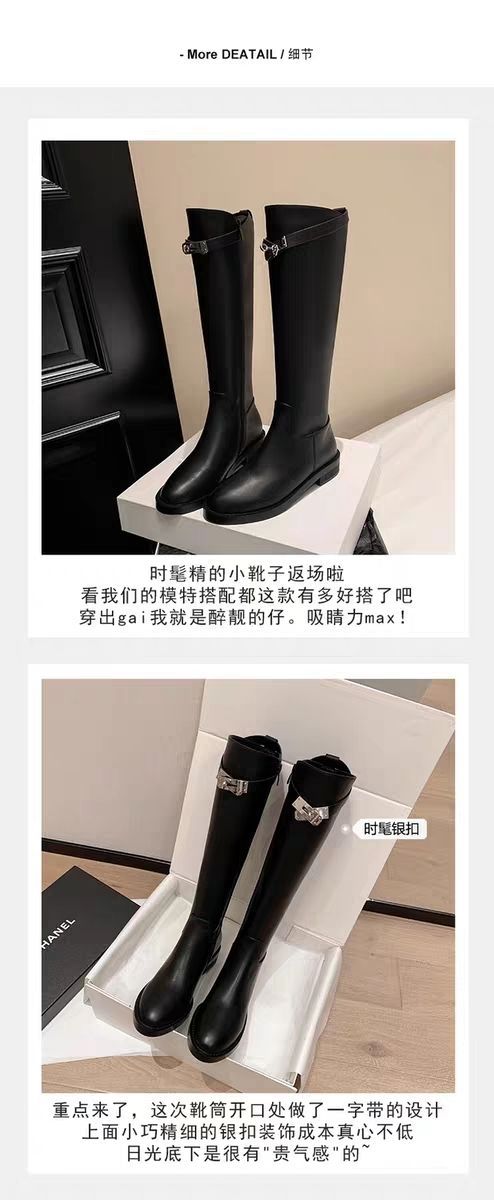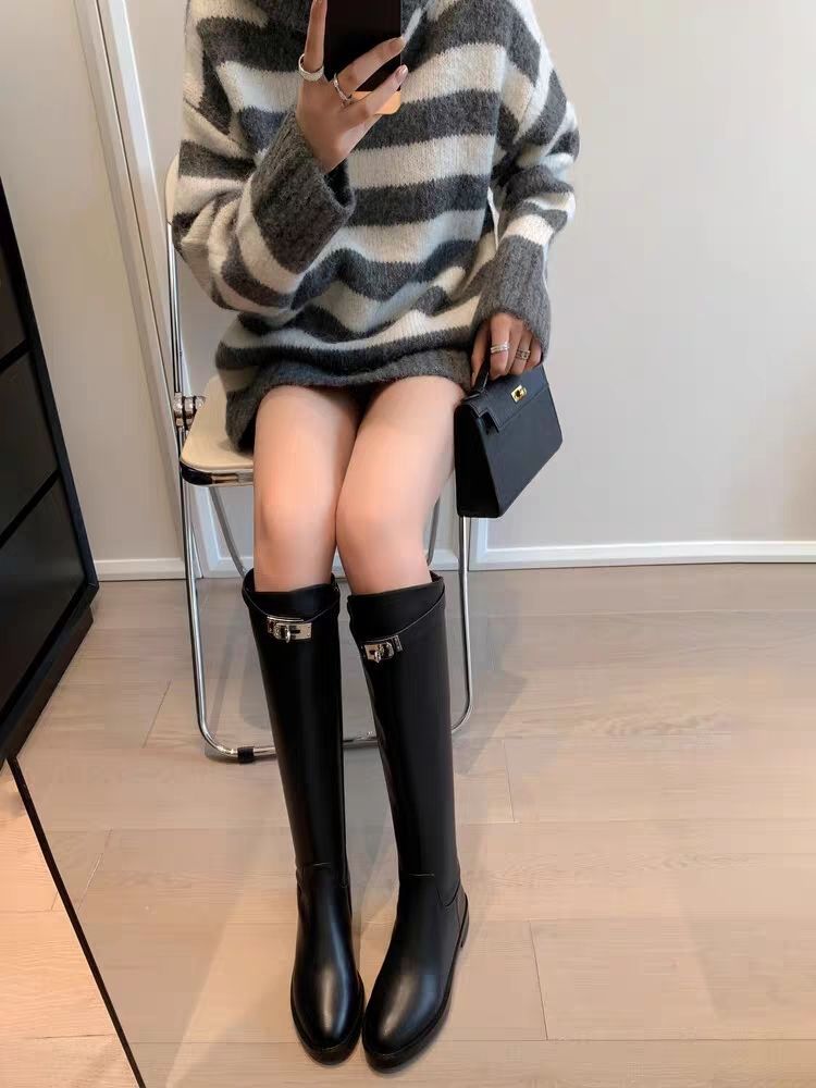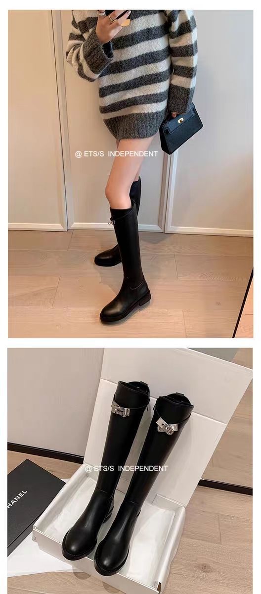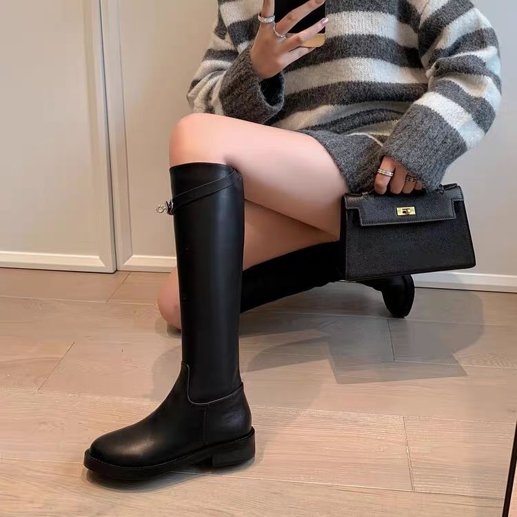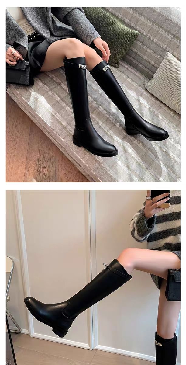 가을 겨울 여성용 유럽과 미국의 잠금 장교 부츠, 싱글 라이닝 블랙 리얼 소프트 가죽 플랫 하이 부츠, 작은 부츠스토어 가기