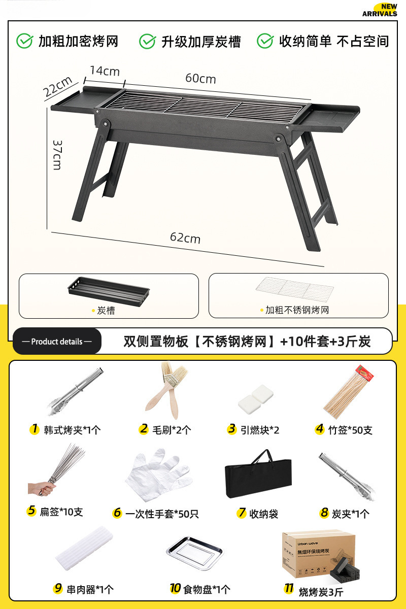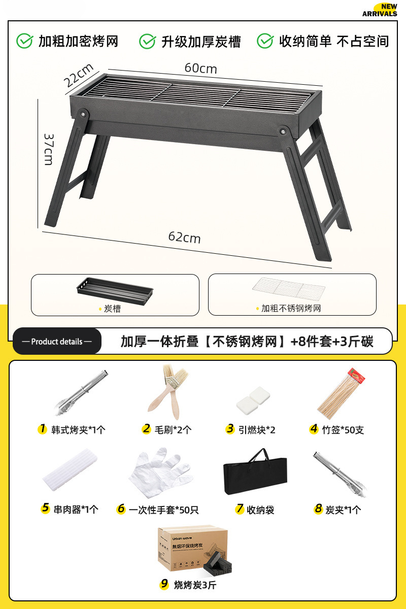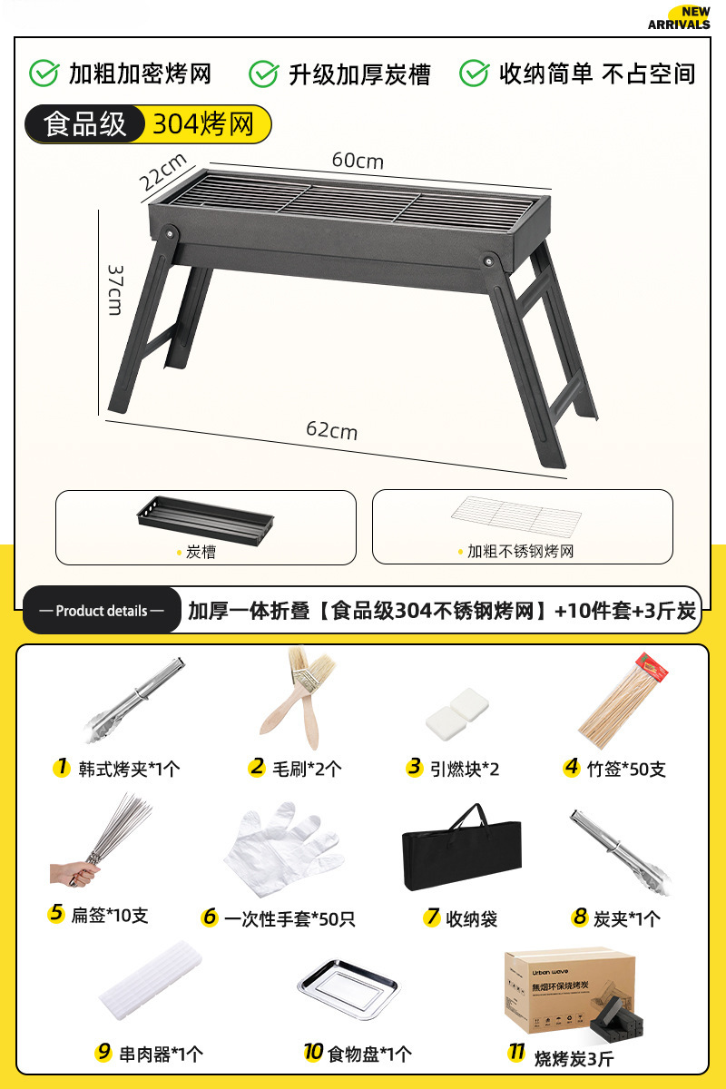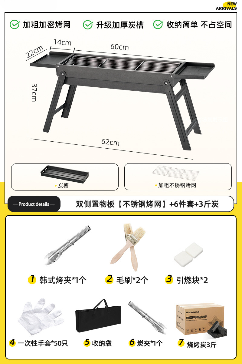 • 업그레이드 및 강화된 이중 날개 수납판 [두꺼운 스테인레스 스틸 그릴 메쉬] 무료 10개 세트 + 숯 1.5kg개