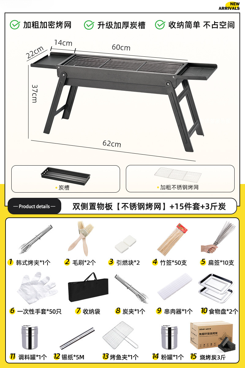 • 업그레이드 및 강화된 더블 윙 수납판 [두꺼운 스테인레스 스틸 그릴 메쉬] 무료 15종 세트 + 숯 1.5kg개