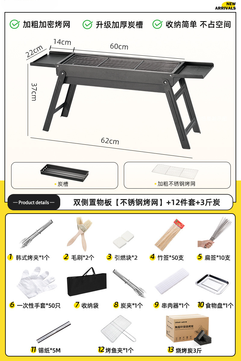 • 업그레이드 및 강화된 더블 윙 수납판 [두꺼운 스테인레스 스틸 그릴 메쉬] 무료 12종 세트 + 숯 1.5kg개