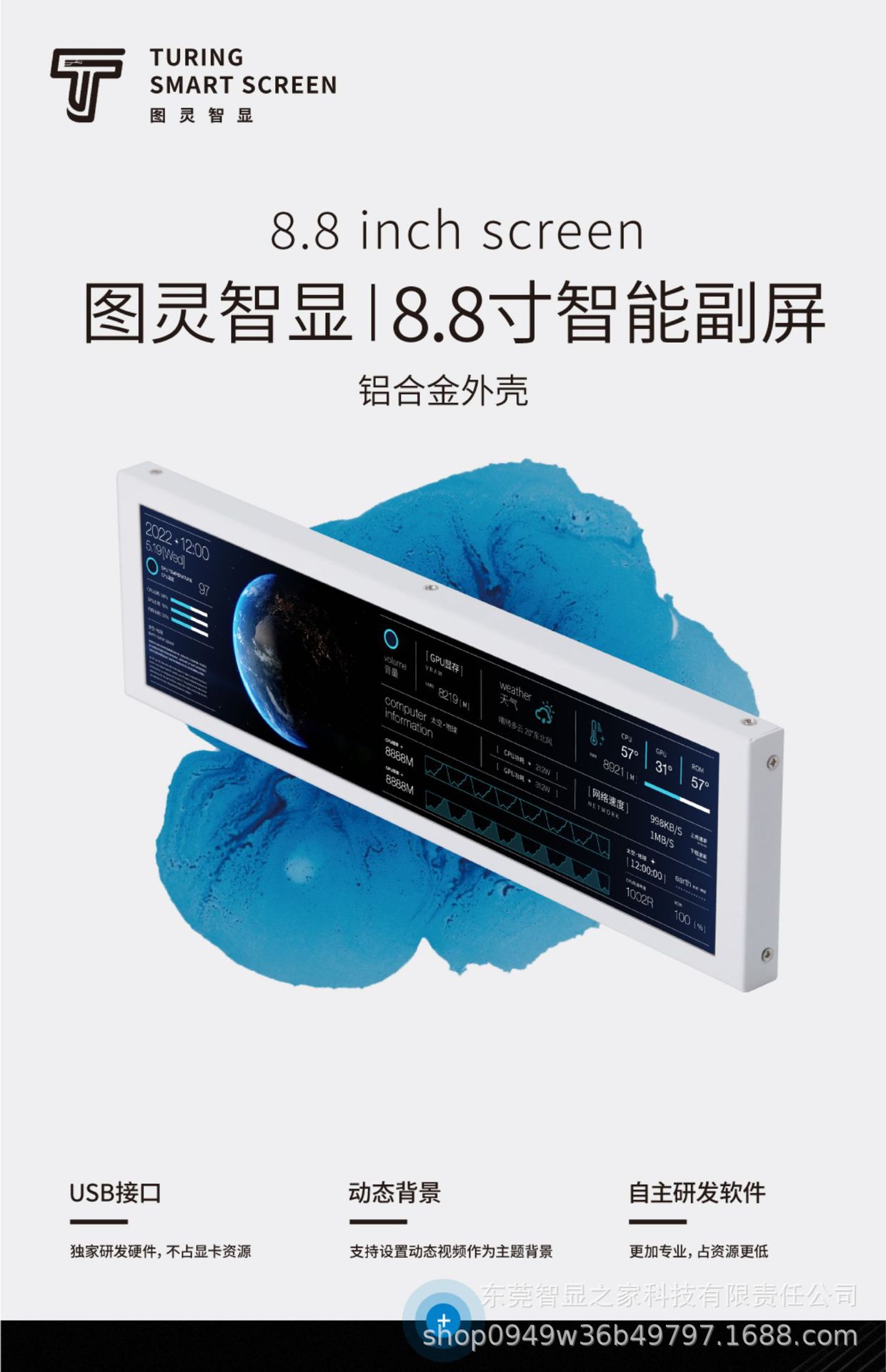 Turing Intelligent Display 8.8inch IPS 스트립 스크린 섀시 보조 스크린 컴퓨터 모니터링 상태 TypeC USB 무료 AIDA64스토어 가기