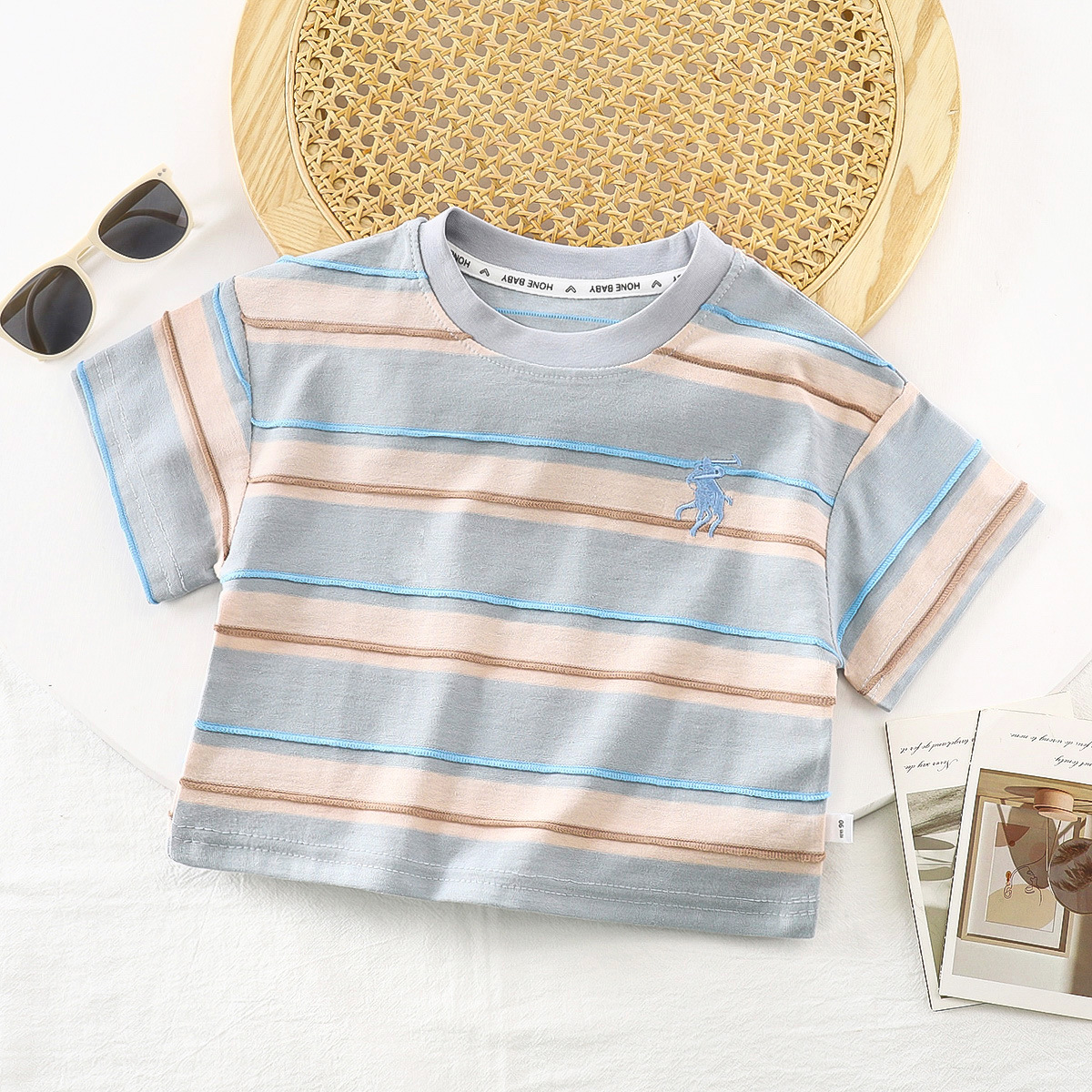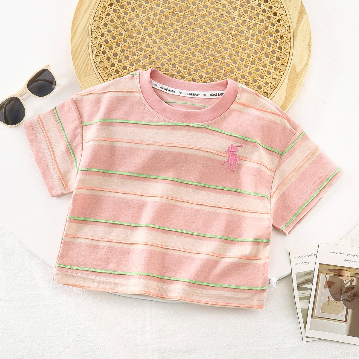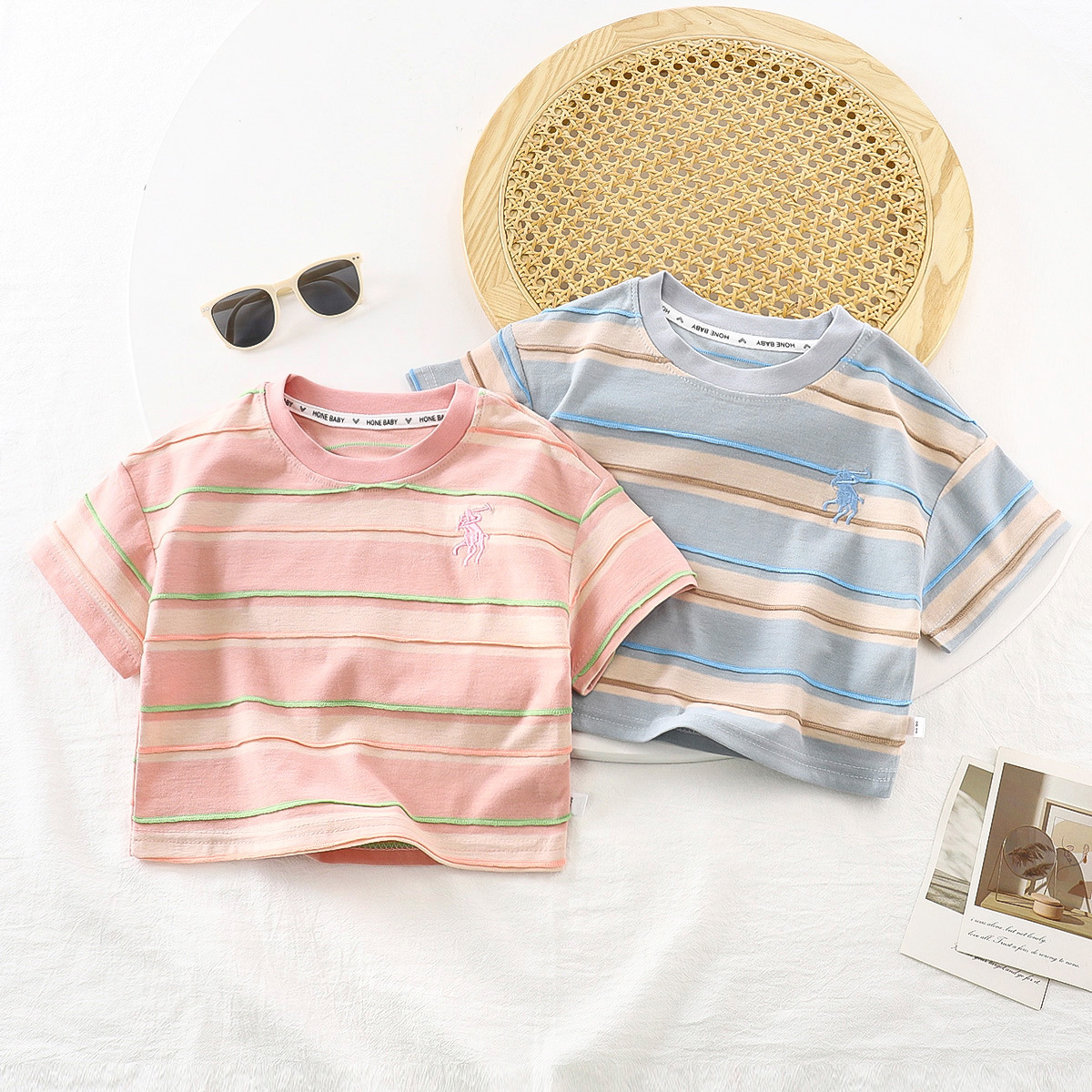 어린이 한국식 간단한 트렌디 남성과 여성의 줄무늬 반팔 탑 여름 유행 올 매치 티셔츠 세련된 새 티셔츠스토어 가기