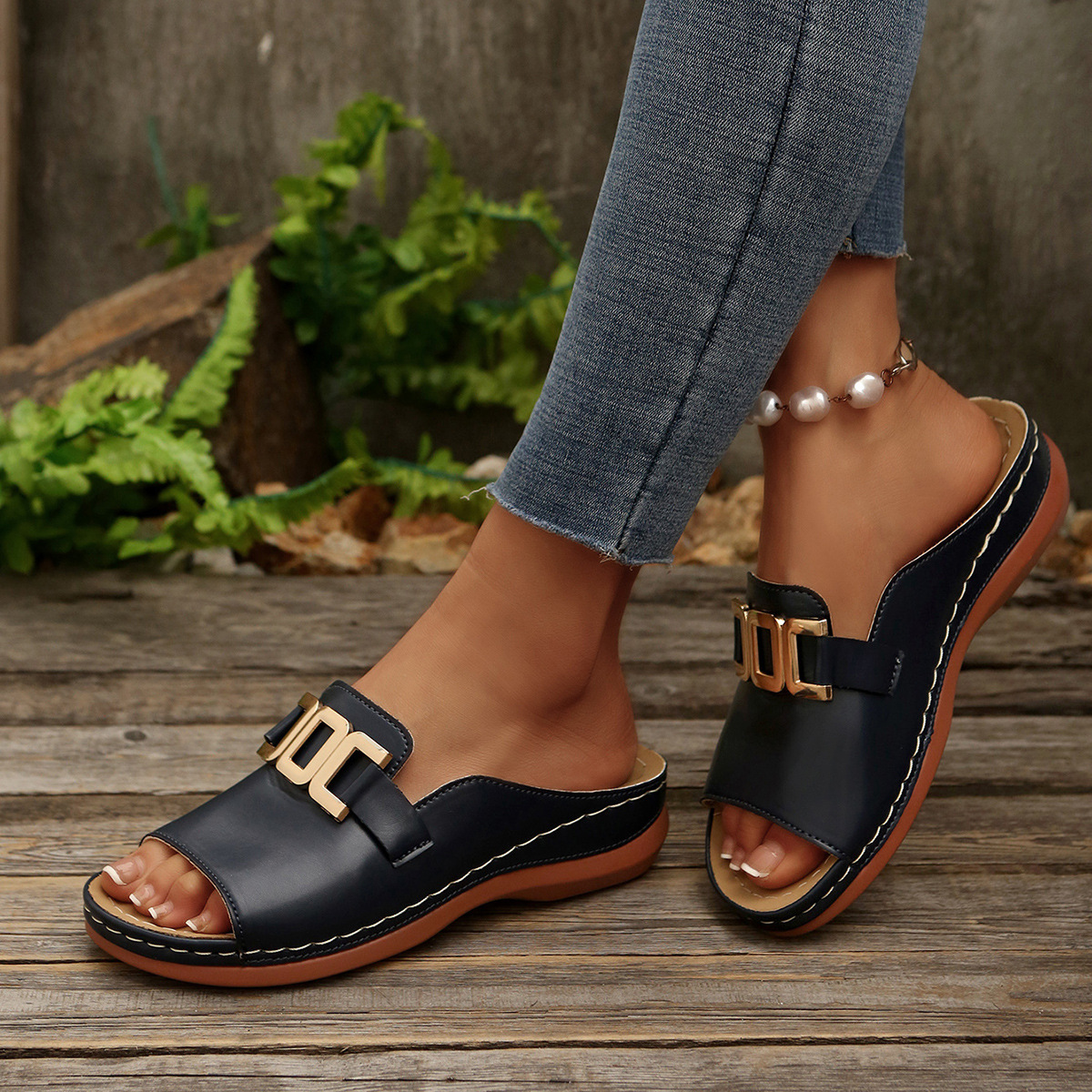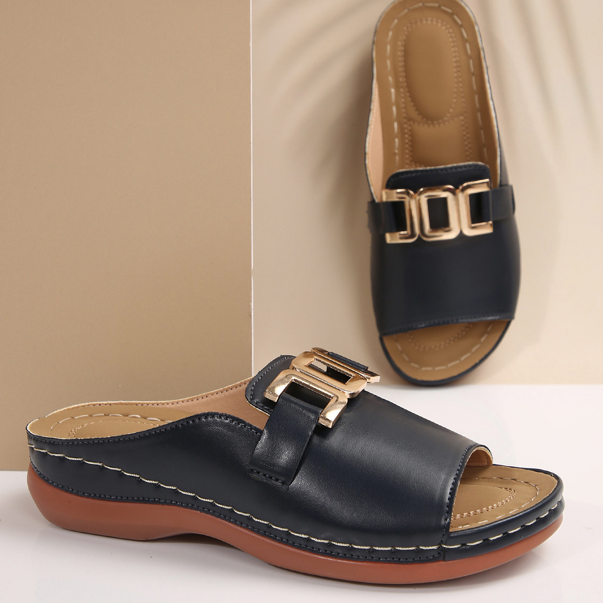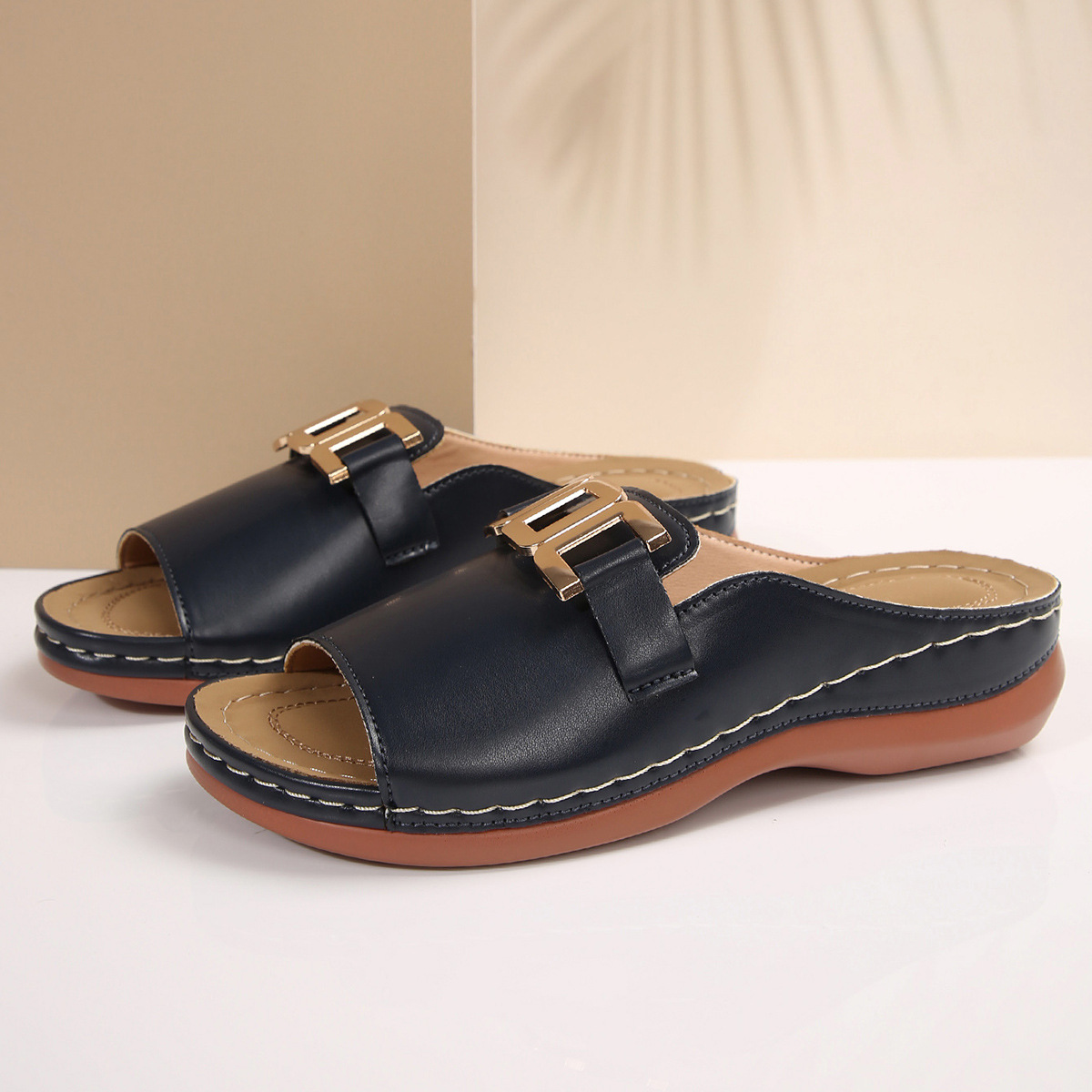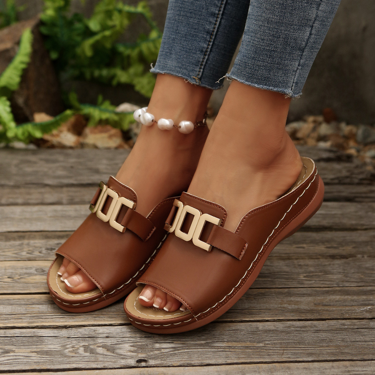 여성을위한 대외 무역 웨지 두꺼운 밑창 슬리퍼 2025 새로운 국경 간 대형 캐주얼 패션 간단한 금속 버클 물고기 입 샌들