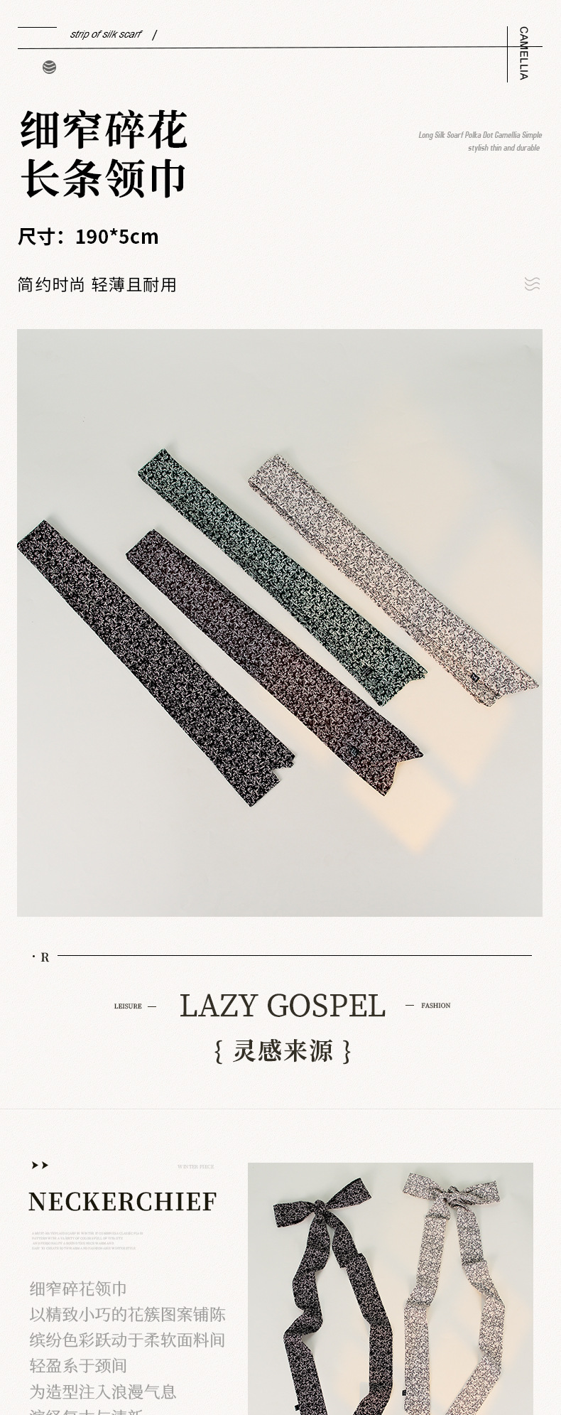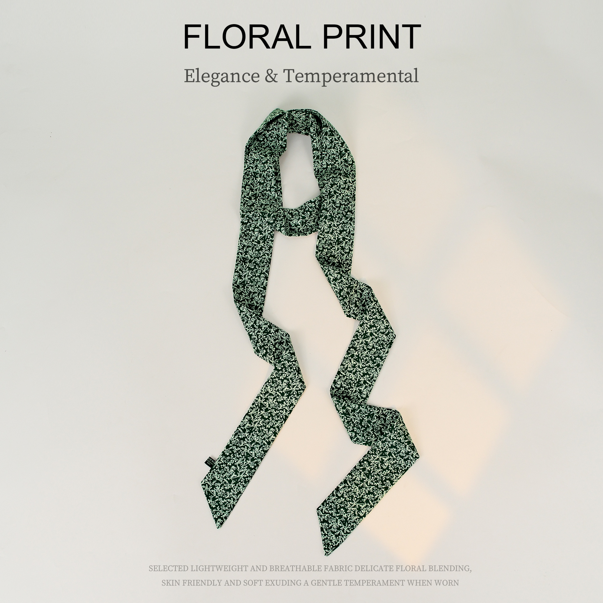 190cm 슬림하고 좁은 예술적 스타일의 작은 꽃무늬 실크 스카프, 같은 스타일의 한국식 작은 스카프, 가방 벨트와 리본
