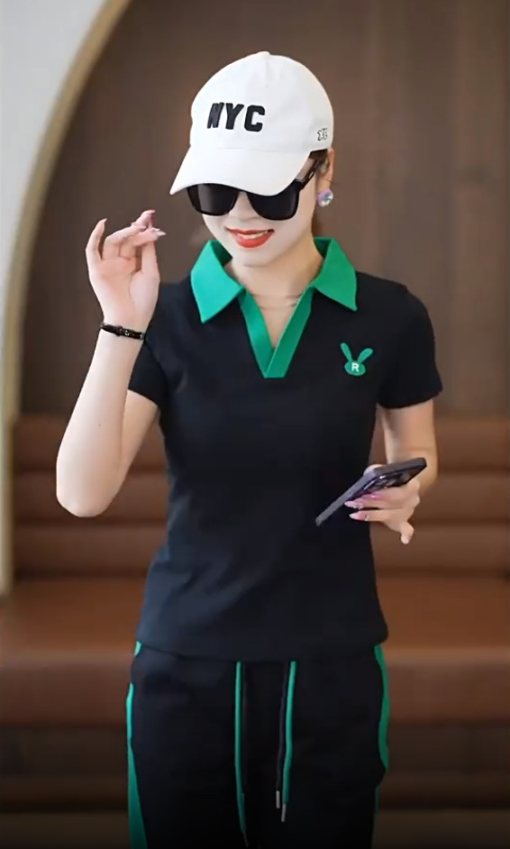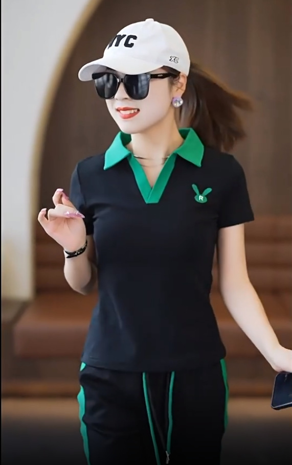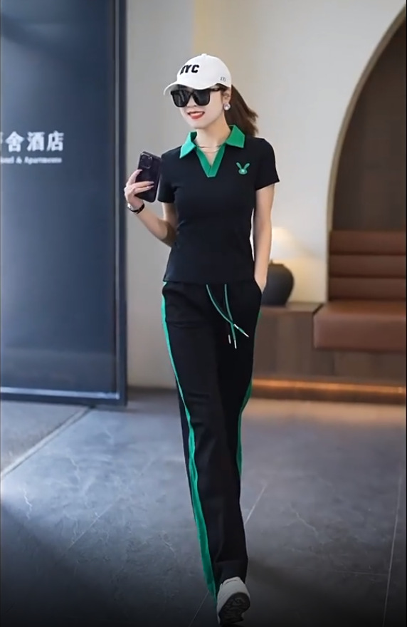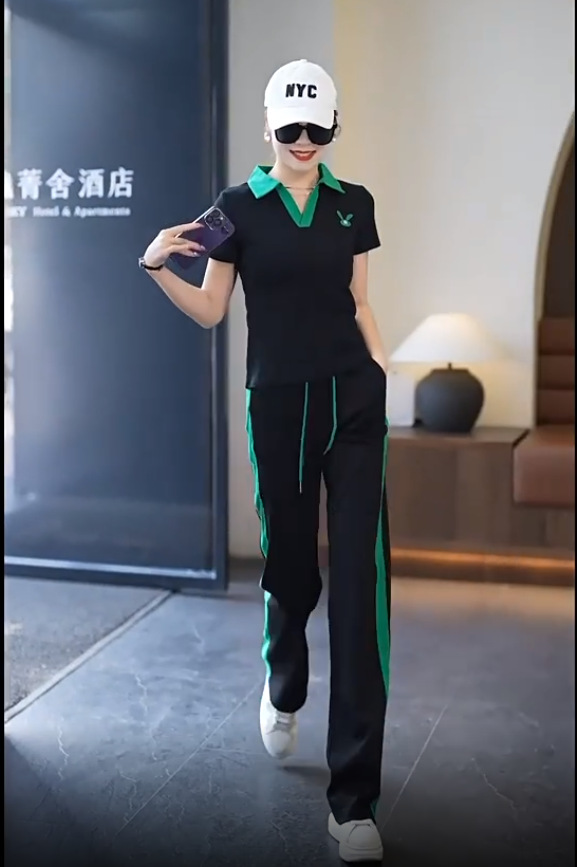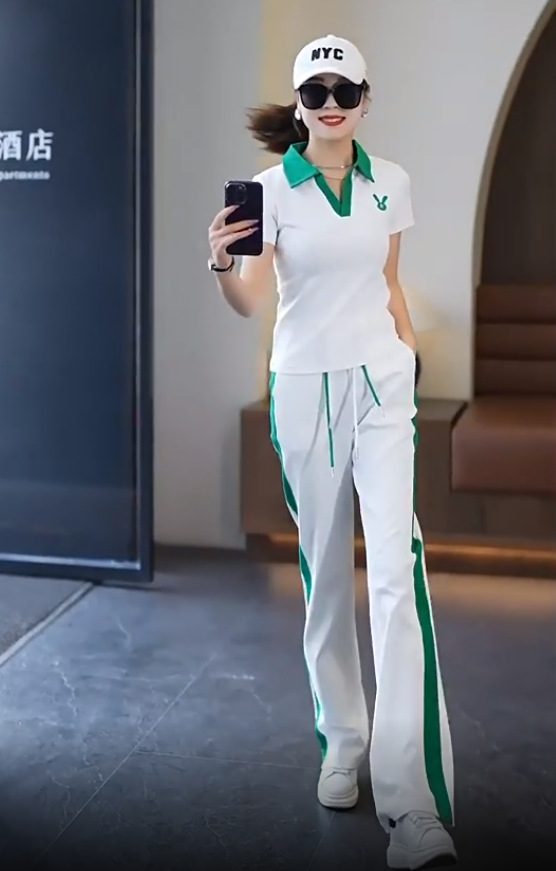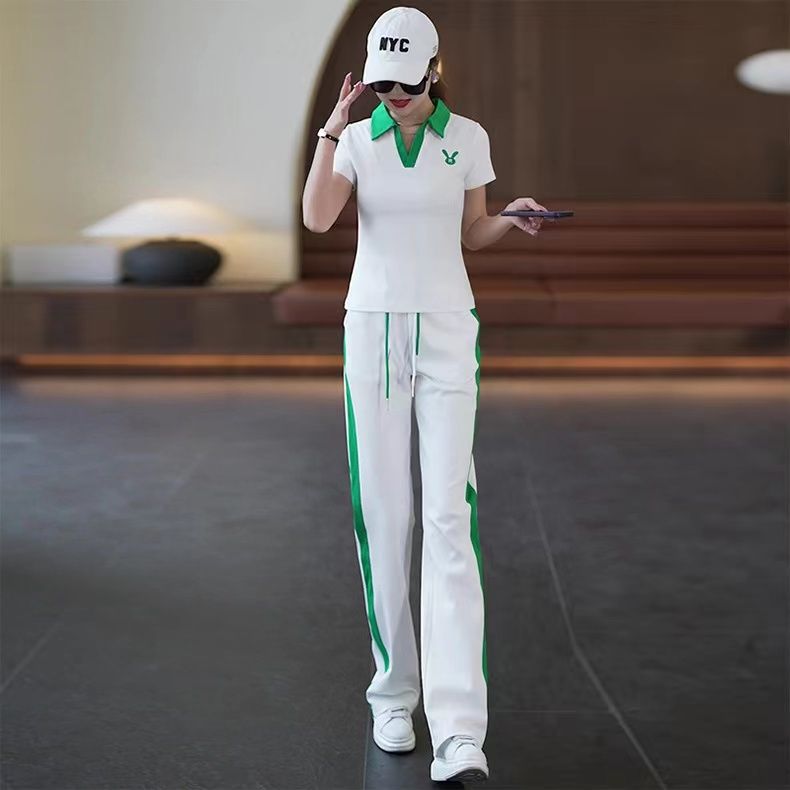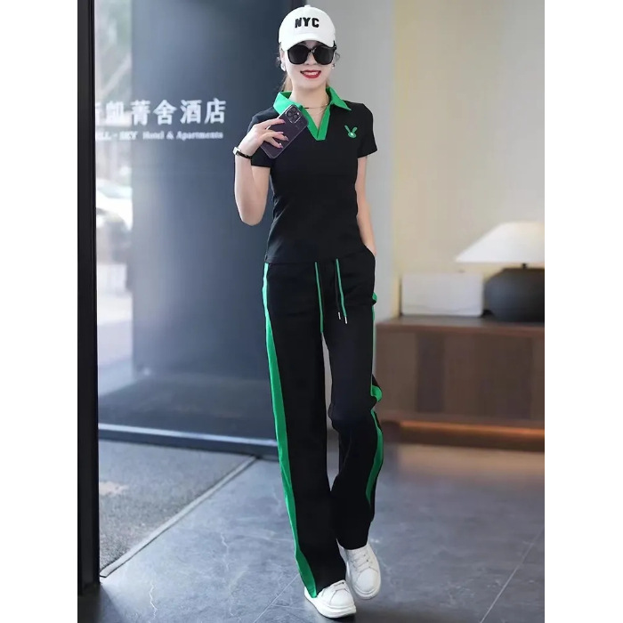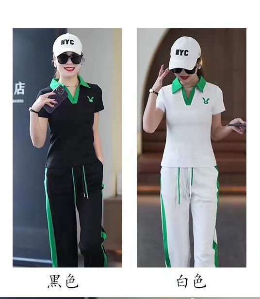 레저 스포츠 세트 여성 2025 새로운 여름 우아한 패션 세련 된 나이 감소 반팔 와이드 레그 바지 투피스 세트스토어 가기