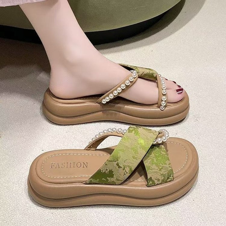 여름 아우터로 착용할 여성용 중국 스타일 두꺼운 밑창 진주 체인 슬리퍼 2025 새로운 요정 스타일 해변 아름다운 슬리퍼스토어 가기