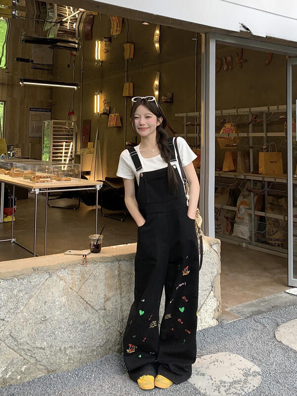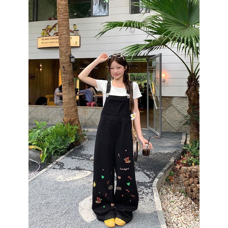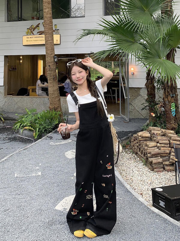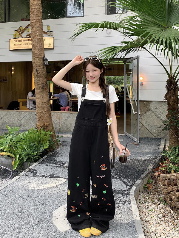 2025 봄 새로운 만화 수 놓은 검은 색 연령 감소 데님 작업복 여성 하이 웨이스트 루즈 스트레이트 바닥 길이 바지