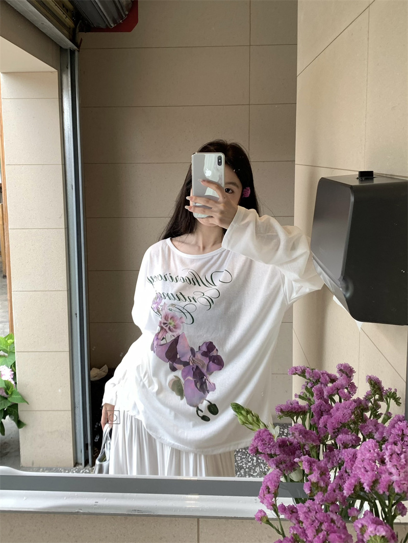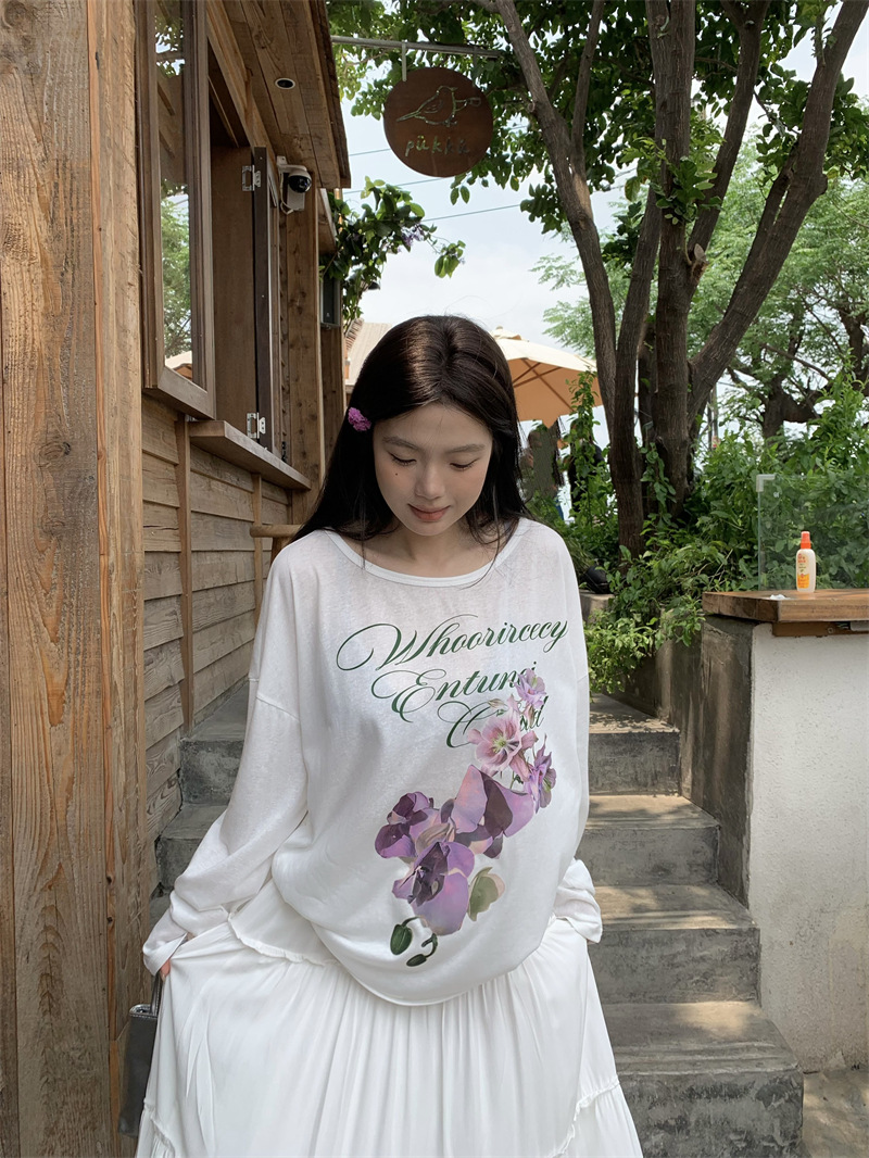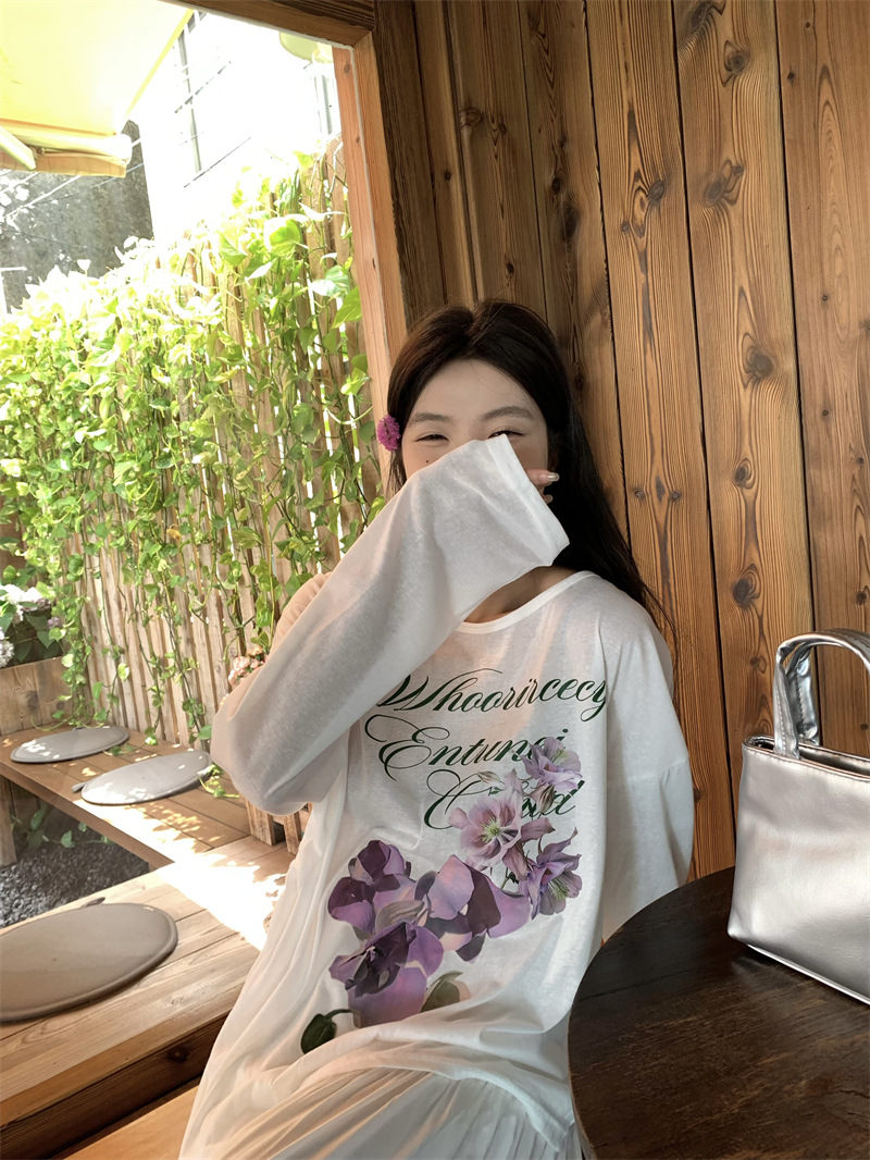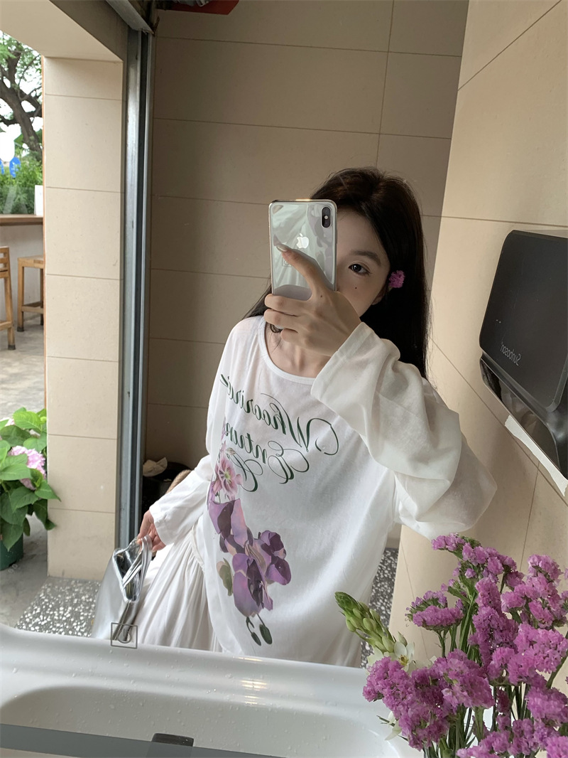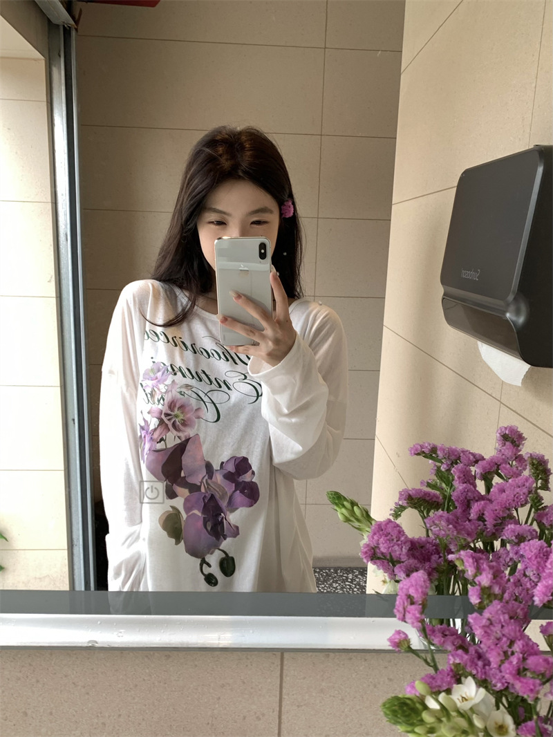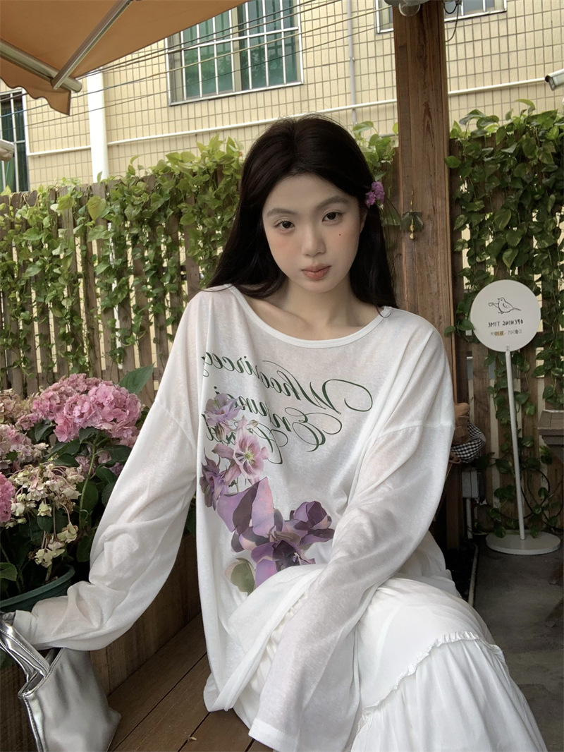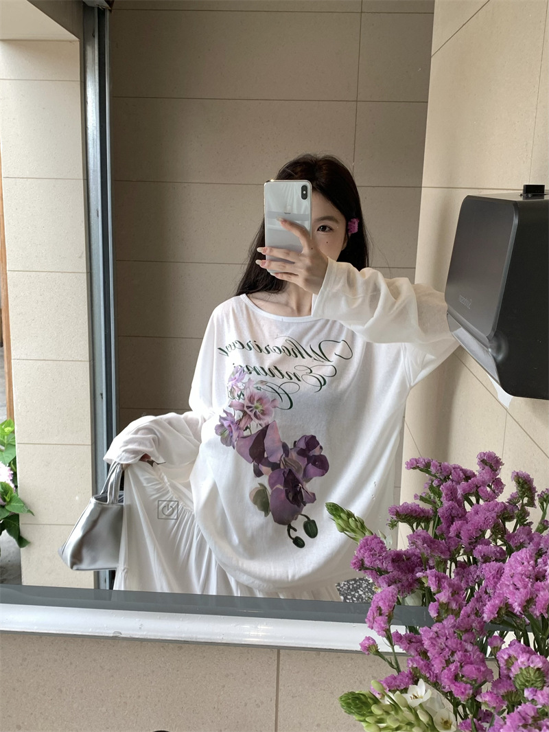 리얼 샷 ~ 2025 여름 새로운 한국 게으른 부드러운 꽃 프린트 블라우스 꽃 선 스크린 긴 소매 얇은 티셔츠