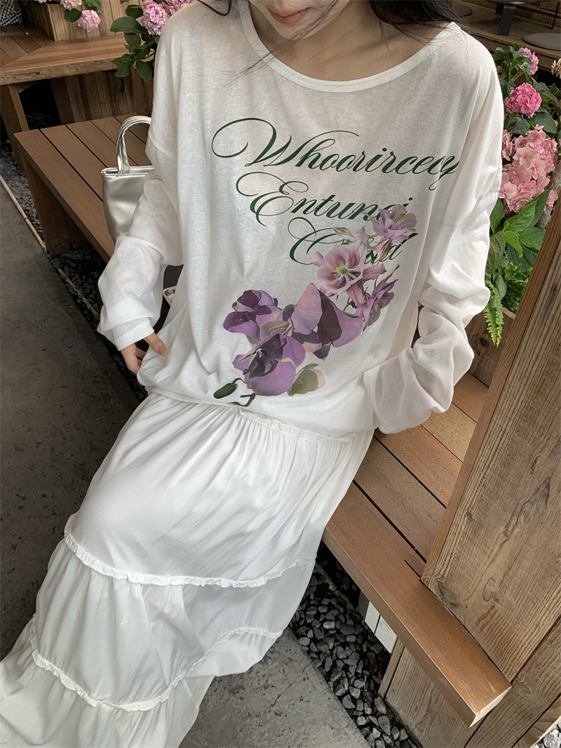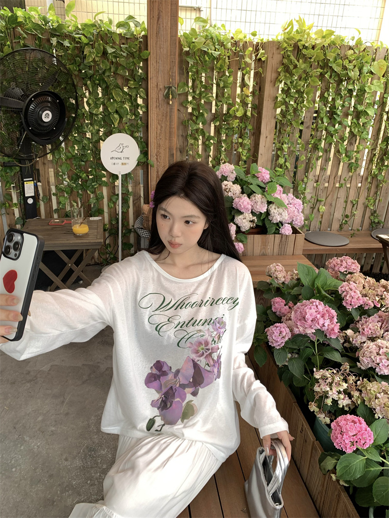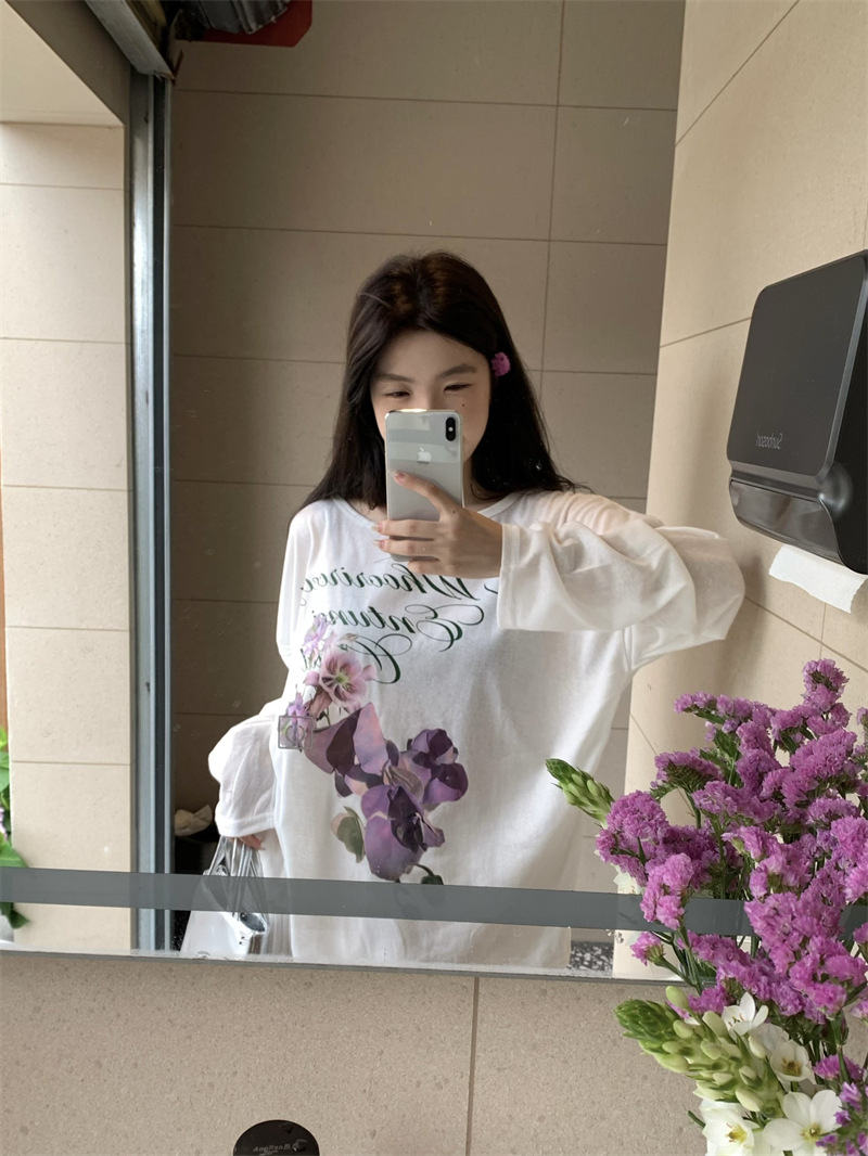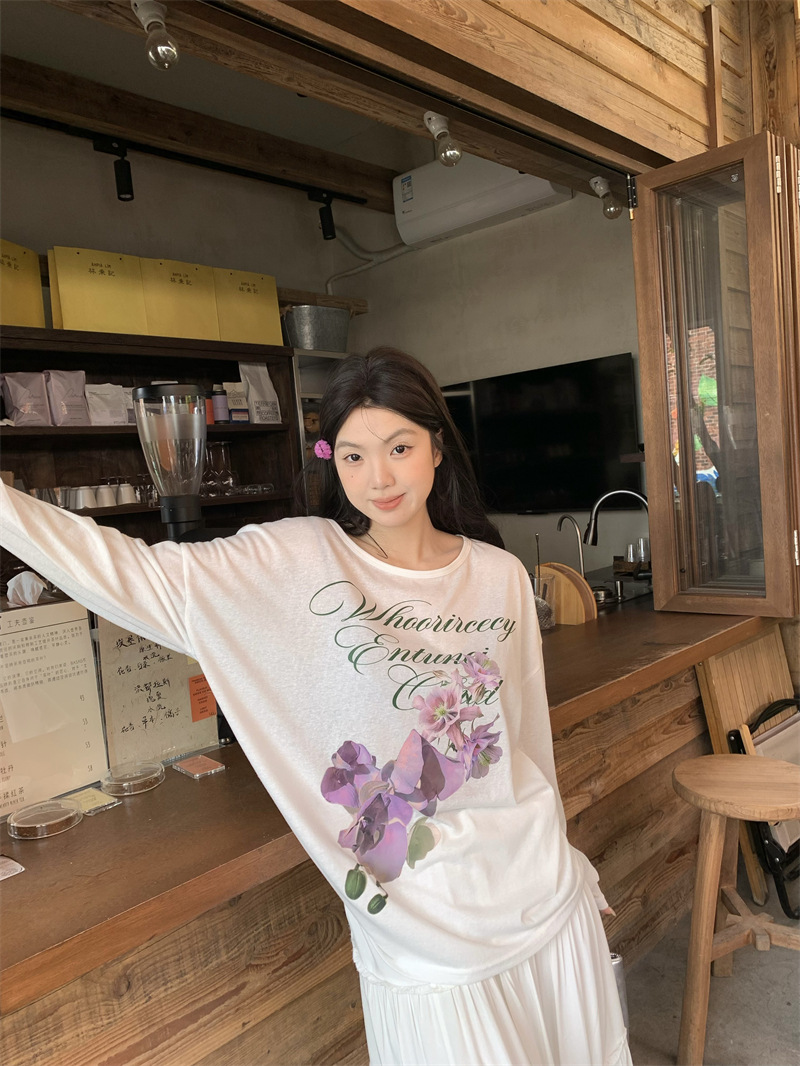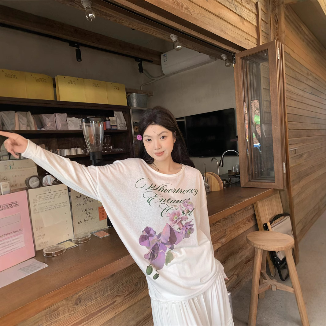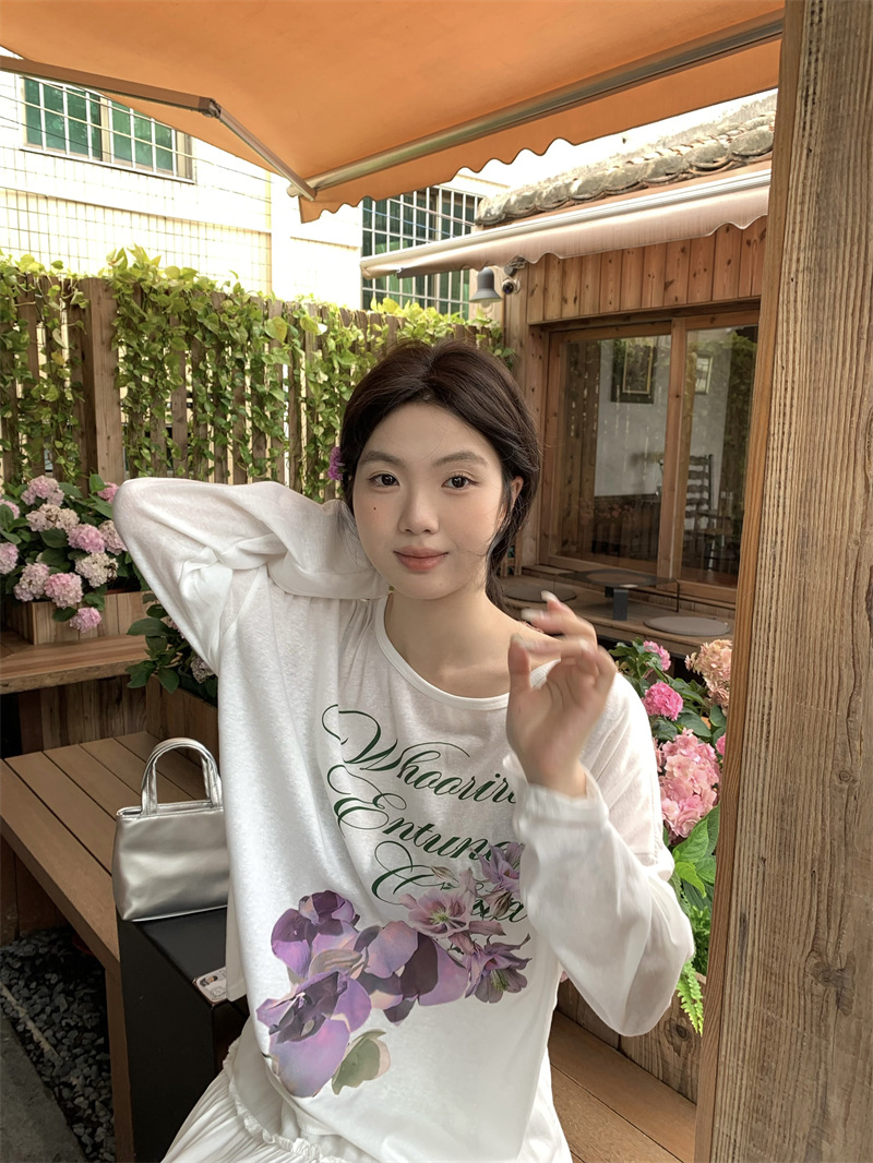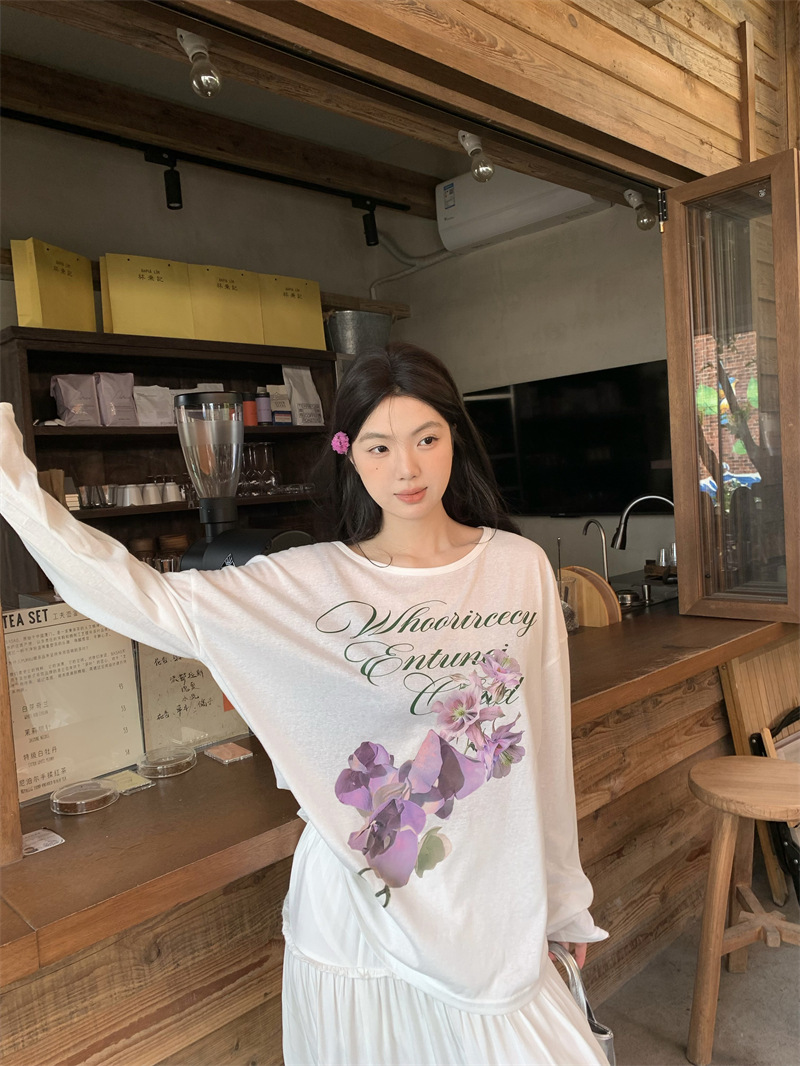 리얼 샷 ~ 2025 여름 새로운 한국 게으른 부드러운 꽃 프린트 블라우스 꽃 선 스크린 긴 소매 얇은 티셔츠