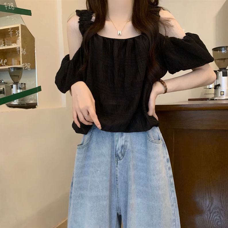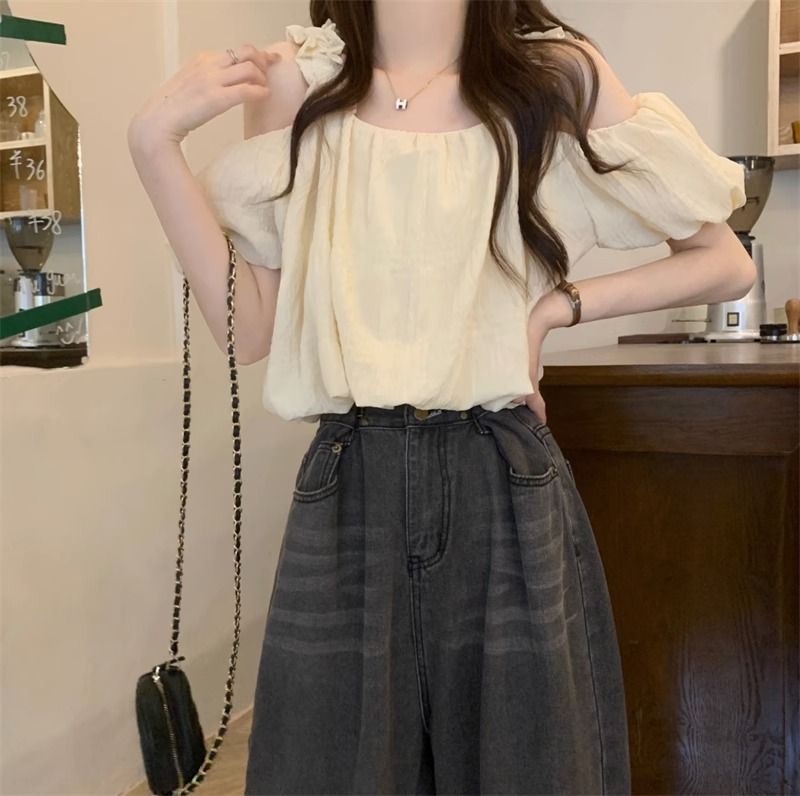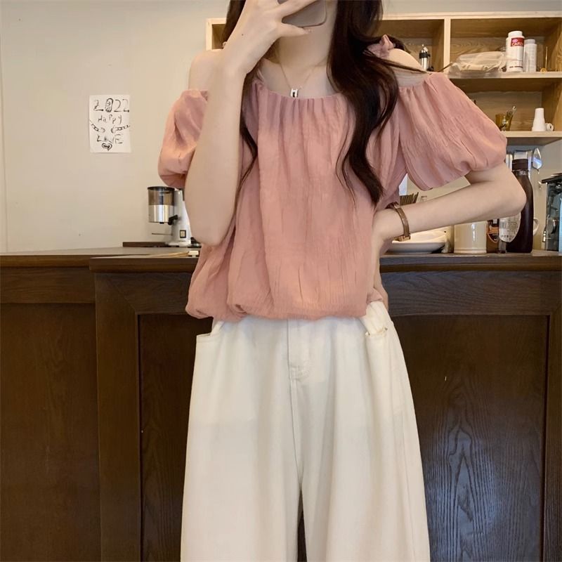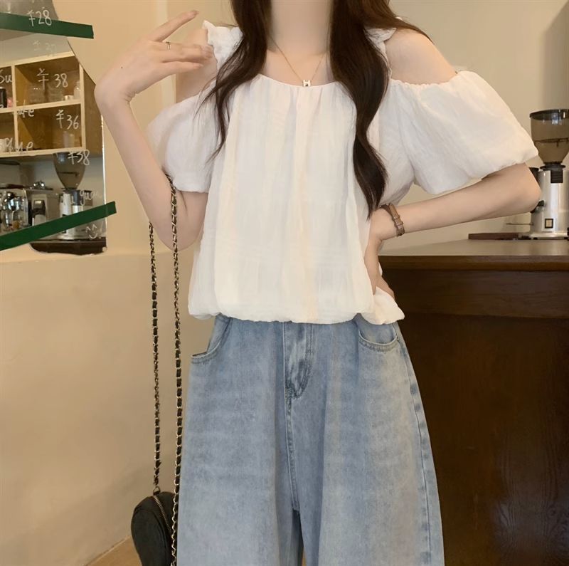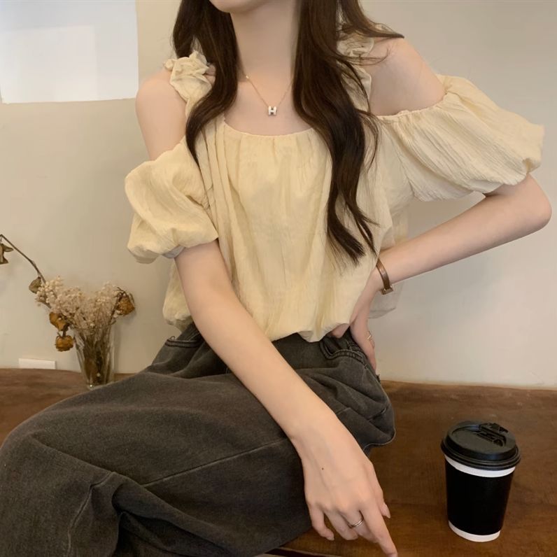 프렌치 스위트 앤 프레쉬 투웨어 여름 쉬폰 셔츠 원숄더 서스펜더 반팔 오프숄더 탑 퍼프 슬리브 니치 트렌드