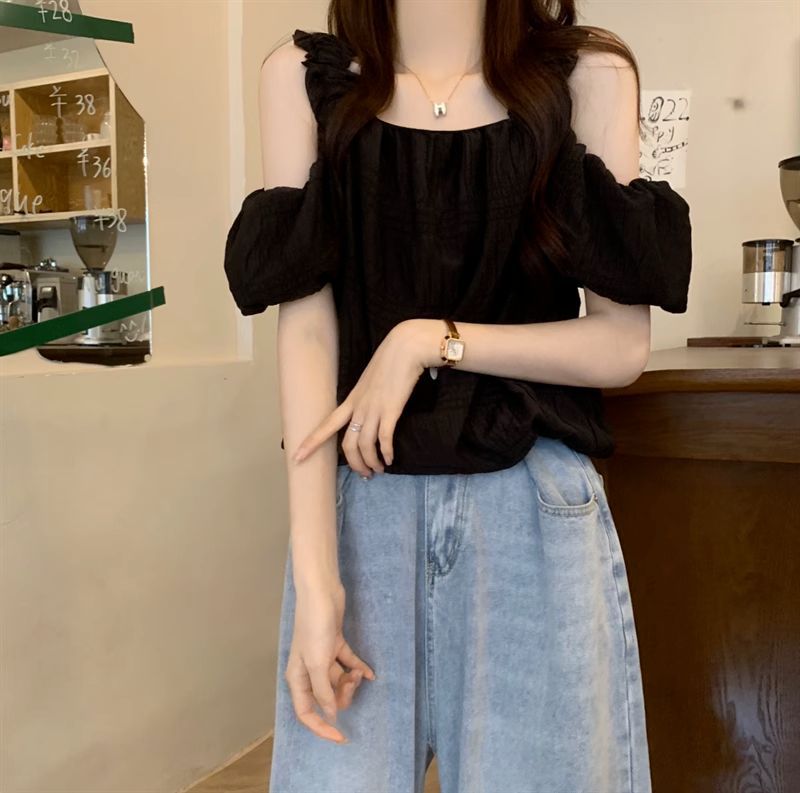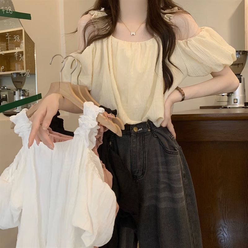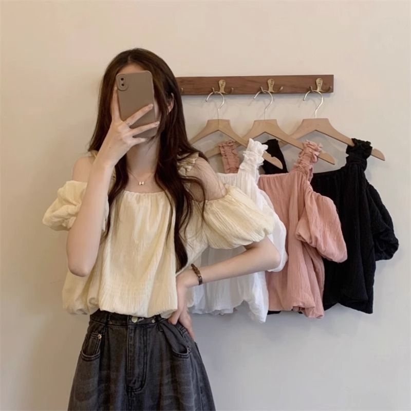 프렌치 스위트 앤 프레쉬 투웨어 여름 쉬폰 셔츠 원숄더 서스펜더 반팔 오프숄더 탑 퍼프 슬리브 니치 트렌드스토어 가기