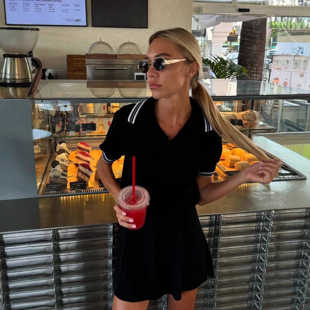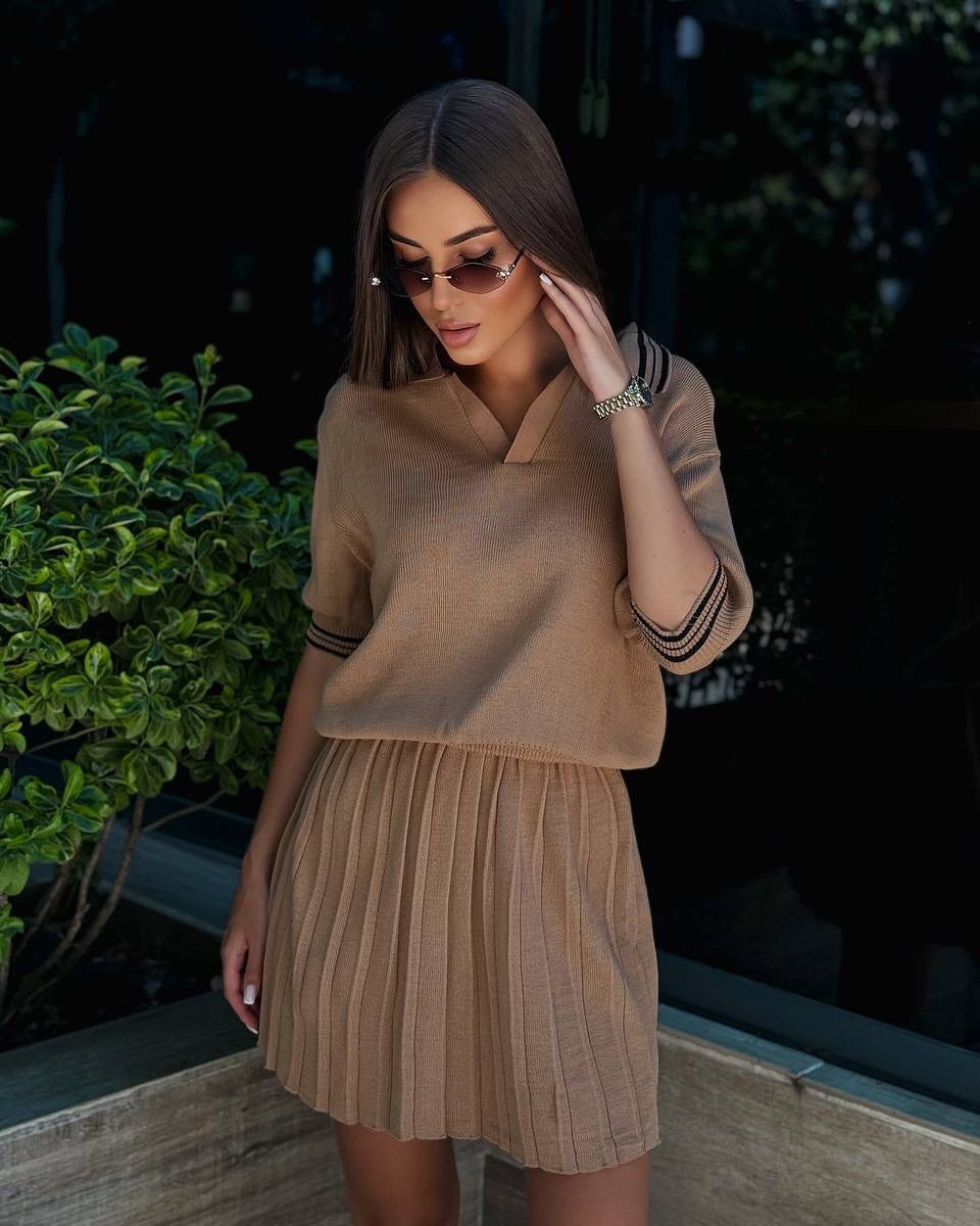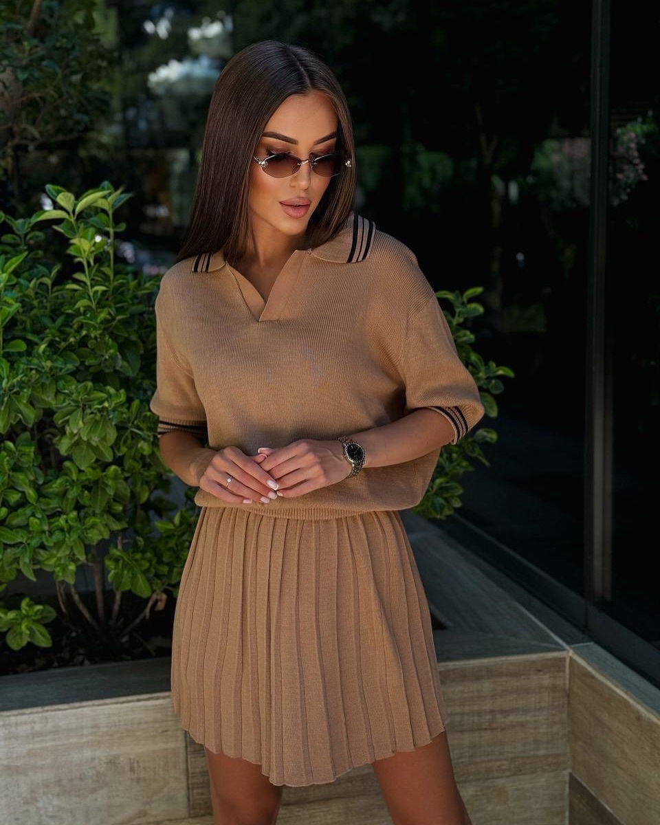 名称:2025夏季新款慵懒风翻领短袖毛衣休闲百搭半身裙毛织两件套女装