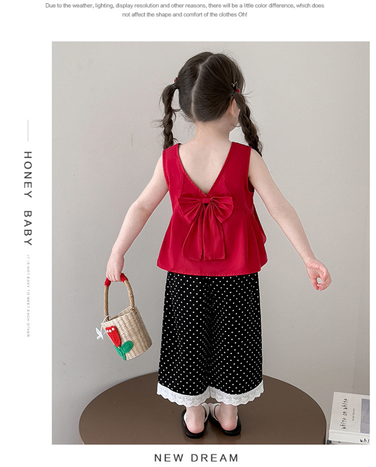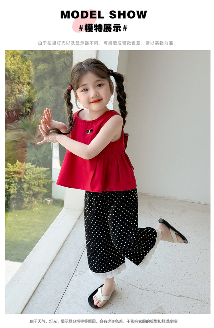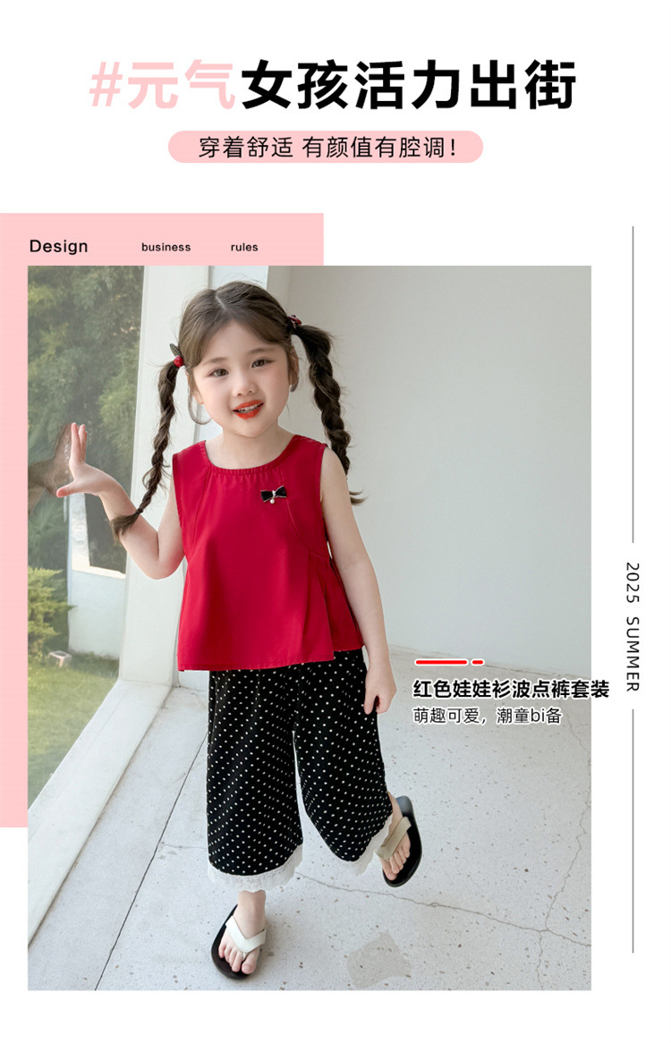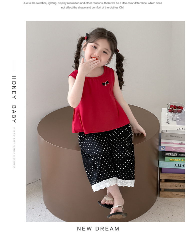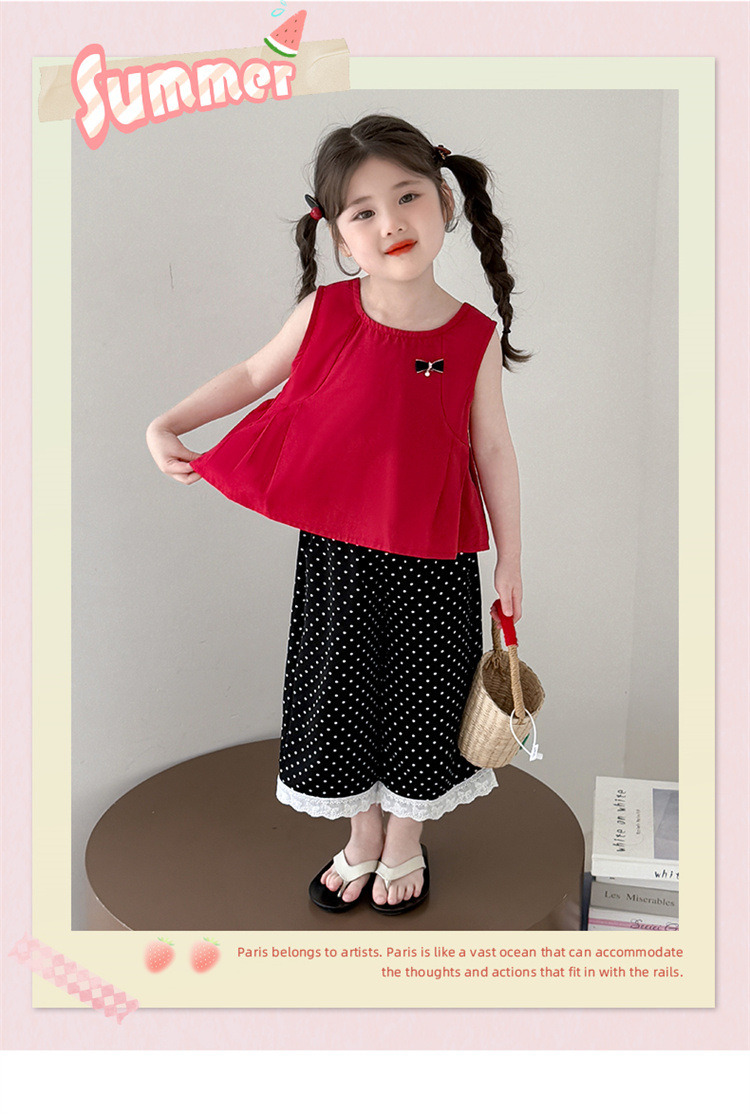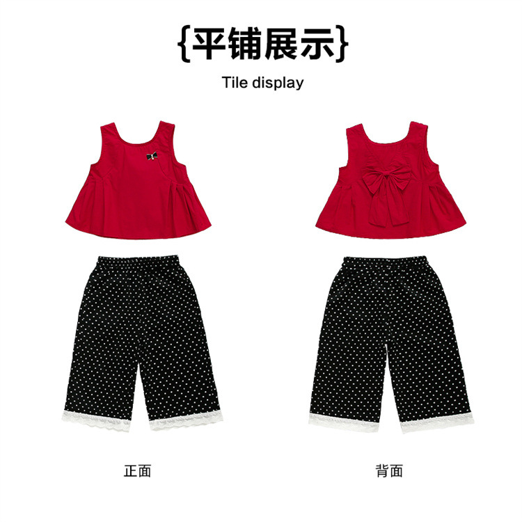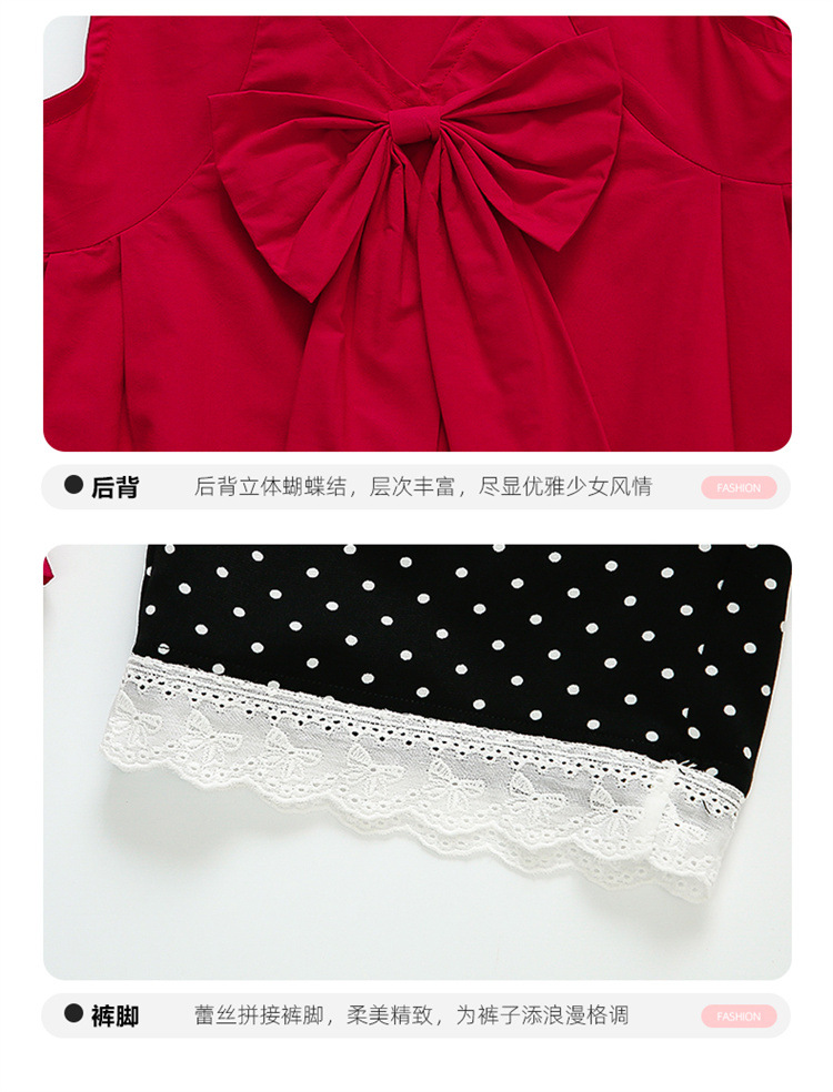 소녀의 빨간 활 폴로 점 바지 세트 2025 여름 새로운 패션 소녀의 세련된 투피스 여름 원피스