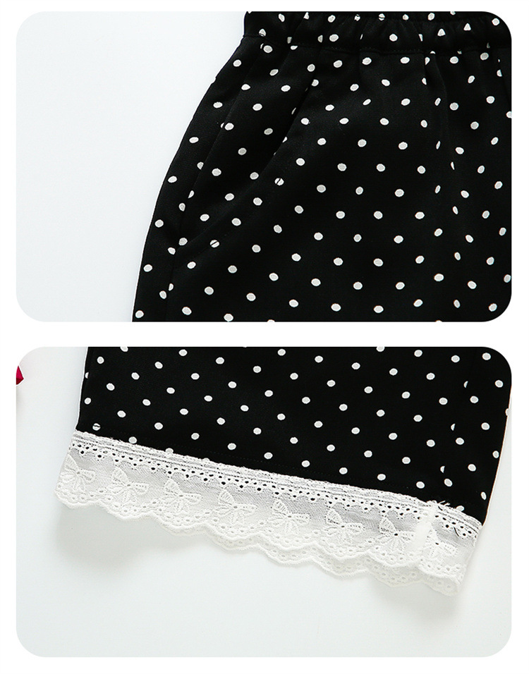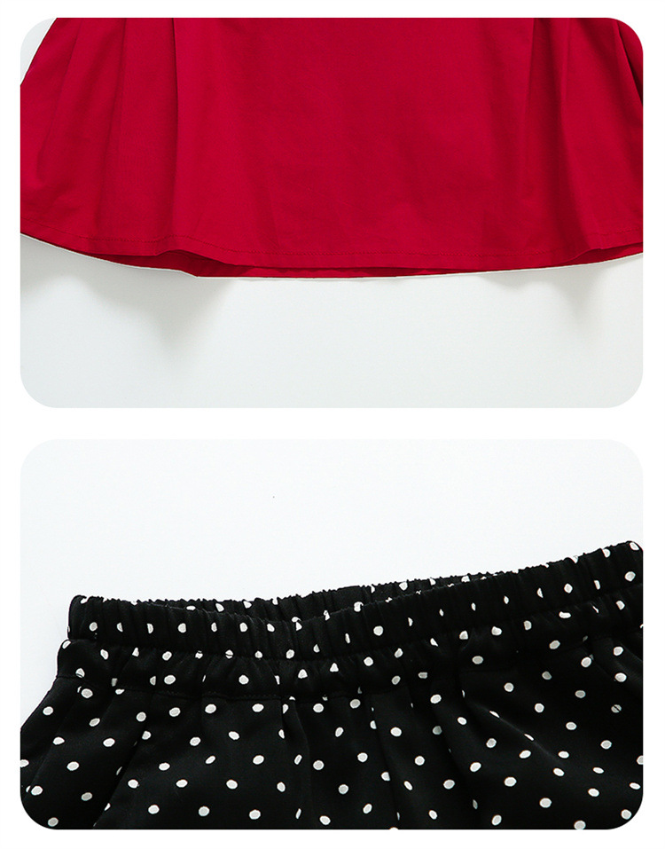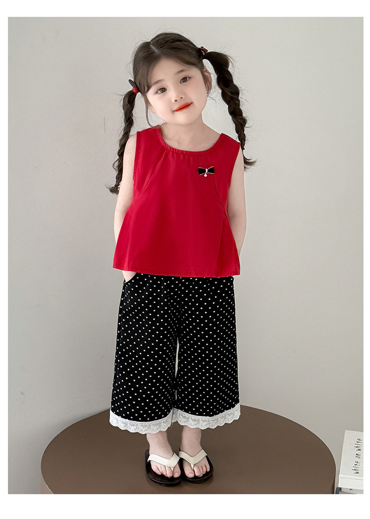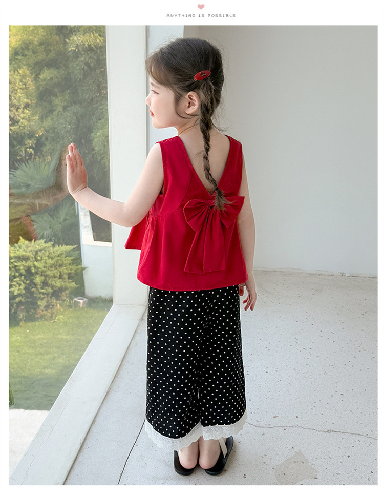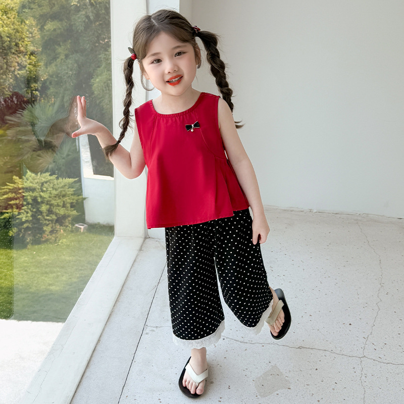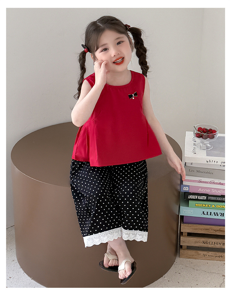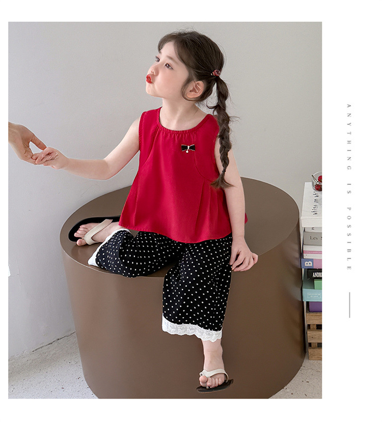 소녀의 빨간 활 폴로 점 바지 세트 2025 여름 새로운 패션 소녀의 세련된 투피스 여름 원피스