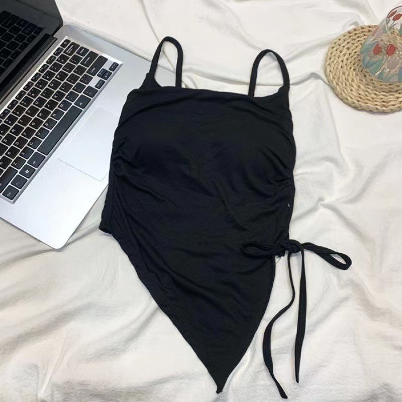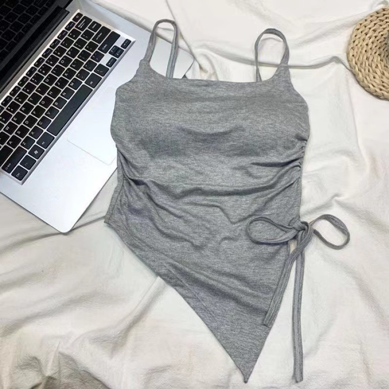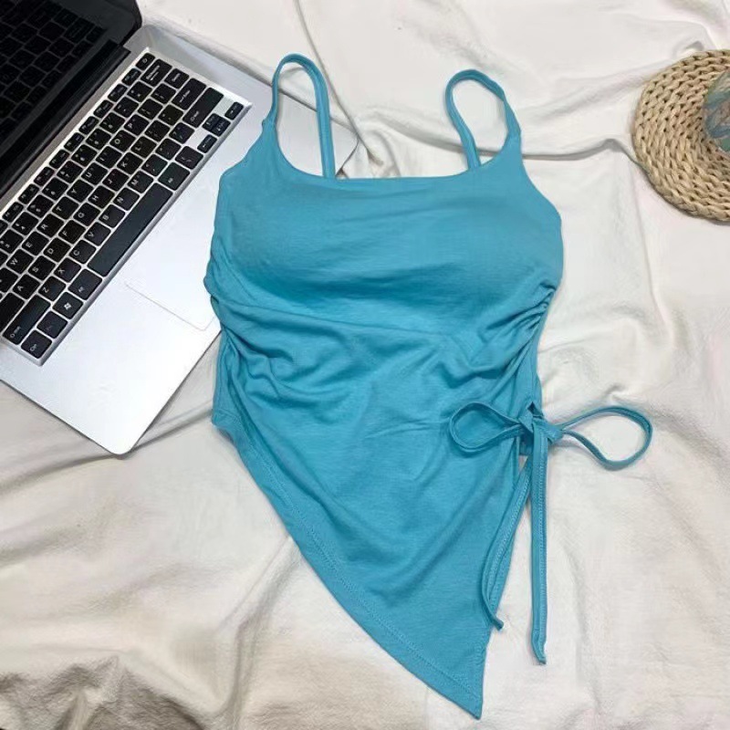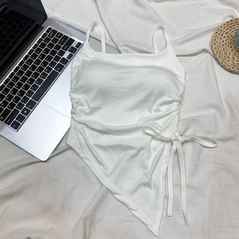 가슴 패드와 레이스업 디자인이 돋보이는 불규칙 슬릿 캐미솔, 순수하고 섹시하며 달콤하고 매콤한 여름 이너웨어 아우터 탑