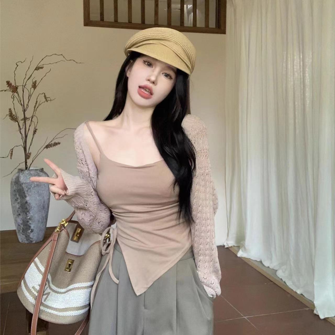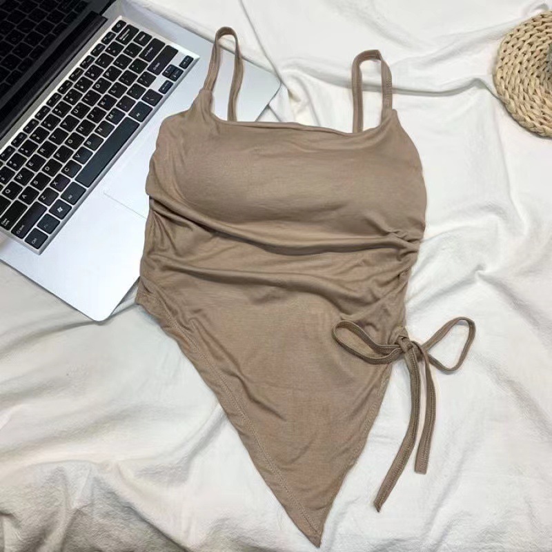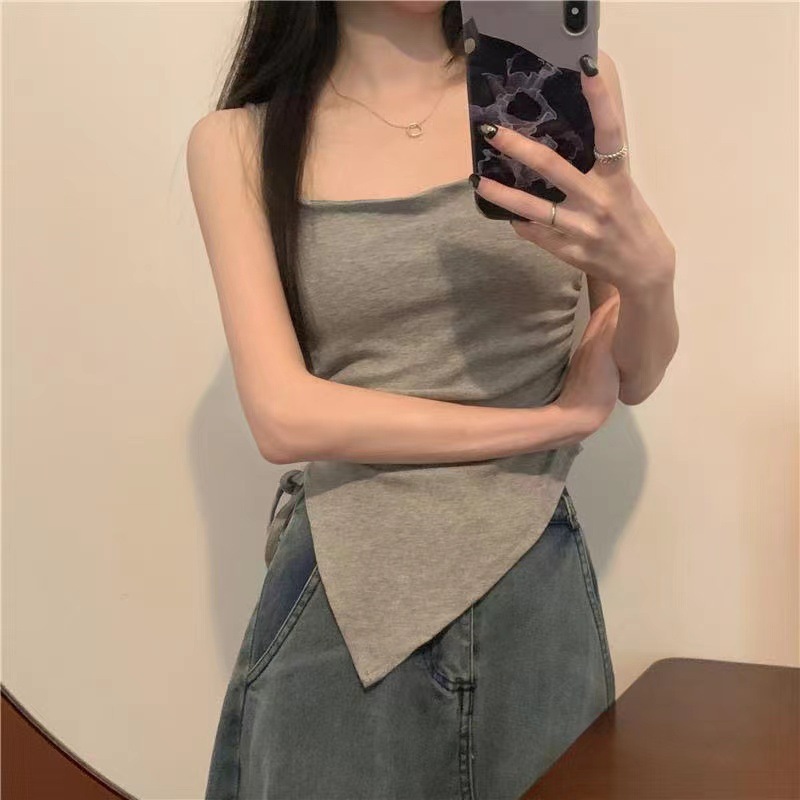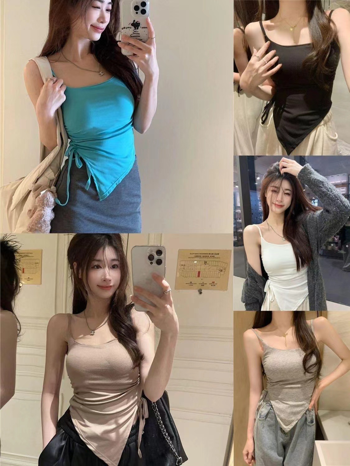 가슴 패드와 레이스업 디자인이 돋보이는 불규칙 슬릿 캐미솔, 순수하고 섹시하며 달콤하고 매콤한 여름 이너웨어 아우터 탑