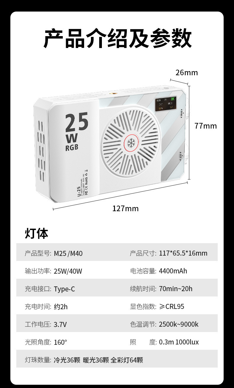 40W 포켓 램프 고출력 휴대용 작은 일반적으로 밝은 라이브 RGB 채우기 빛 휴대용 야외 사진 아름다움 조명