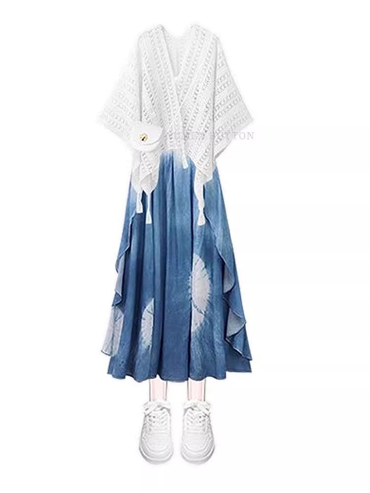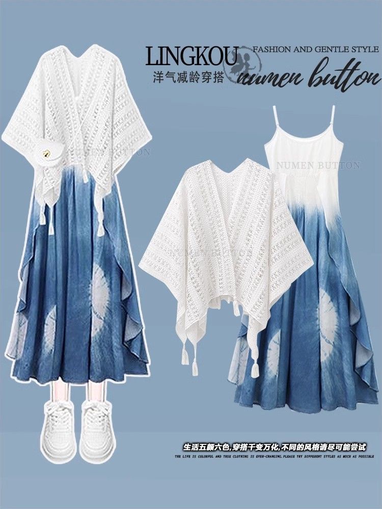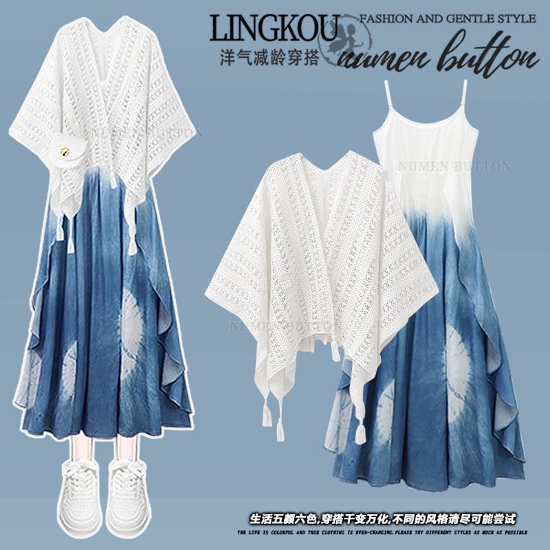 여성을위한 여름 정장 2025 새로운 여행 착용 중공 목도리 해변 휴가 스타일 서스펜더 드레스 투피스 세트