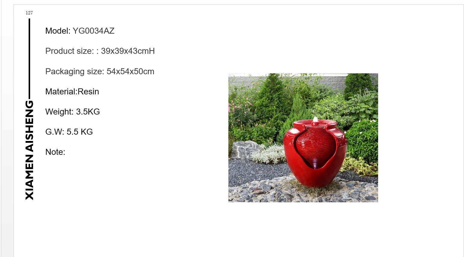 这款户外喷泉以鲜艳红色为主体,造型如艺术雕塑般独特新颖,流畅线条勾勒别致轮廓,开口设计融合传统与现代创意。精选优质材质,经精细工艺打造,表面纹理细腻、层次丰富、质感十足。潺潺流水自顶部涌出,动静相映成趣。置于庭院、花园或露台,不仅添一抹亮色,更带来自然灵动与生机,营造宁静雅致氛围,让您于喧嚣中寻得惬意天地,是装饰性与意境营造兼具的匠心之作