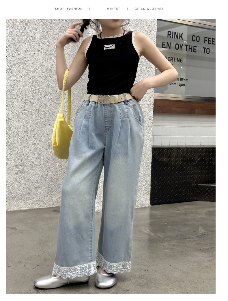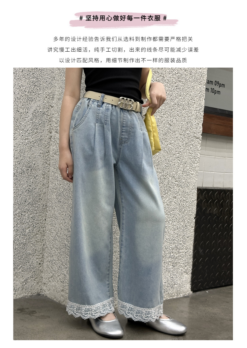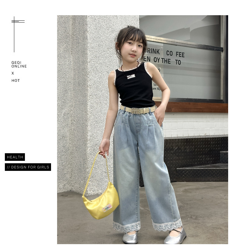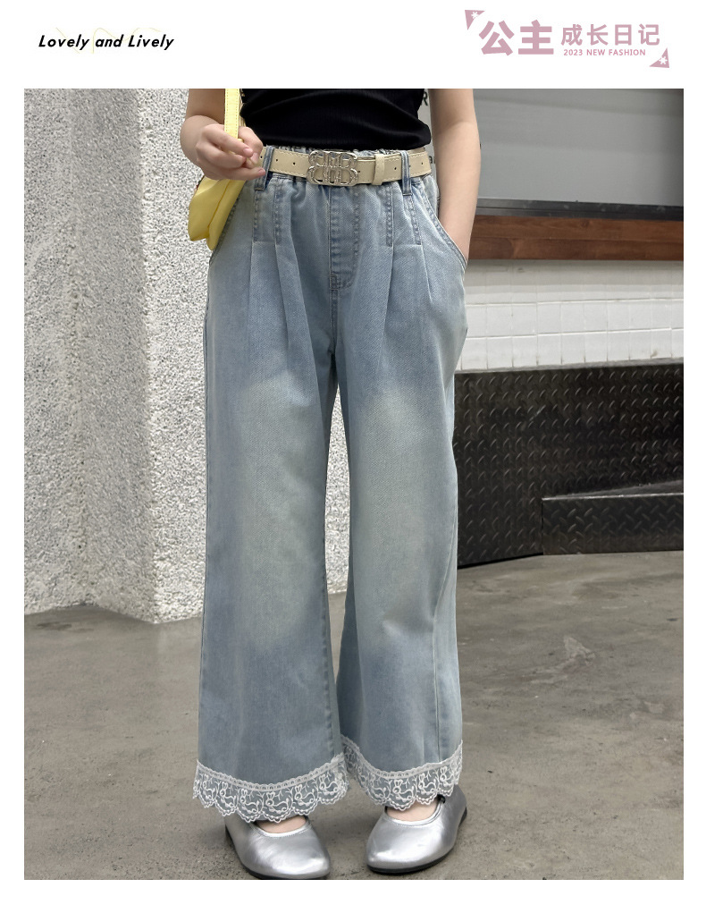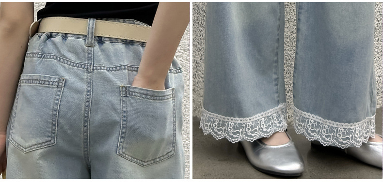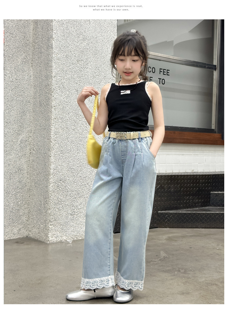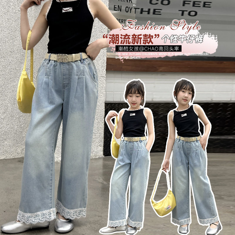 여름 새 스타일 여아 청바지 중대형 아동용 2025 여름 슬림 레이스 여아 와이드 청바지