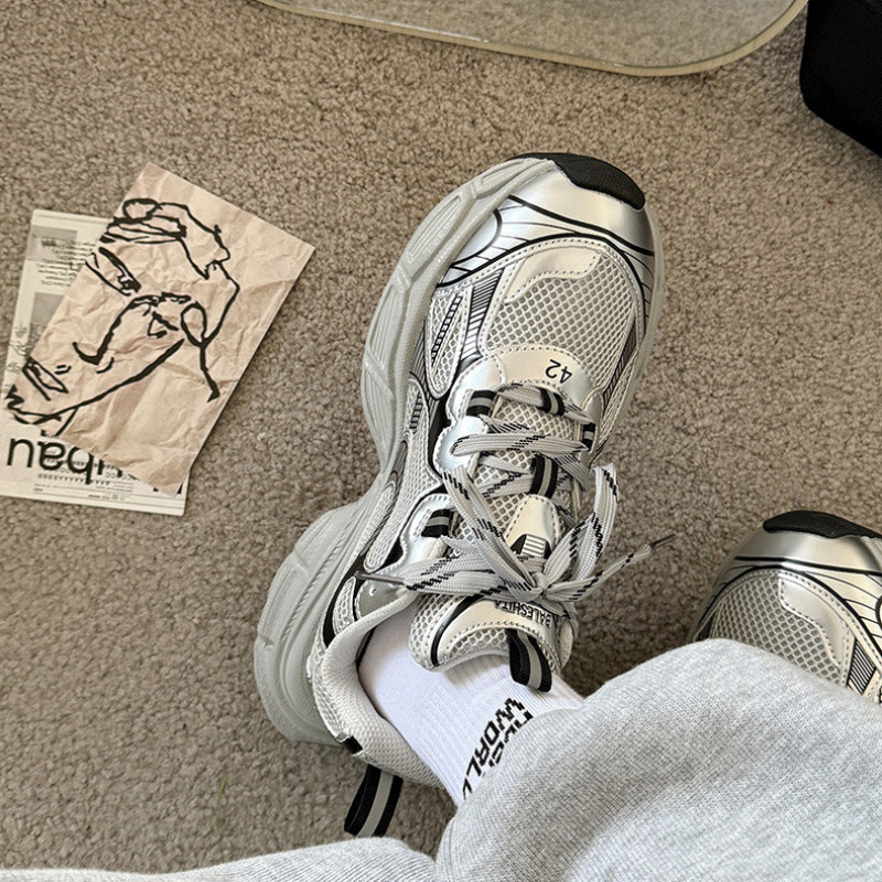 2024년 봄 남성용 실버 두꺼운 밑창 높이 증가 아빠 신발 틈새 시장 새로운 고급 커플 캐주얼 운동화스토어 가기