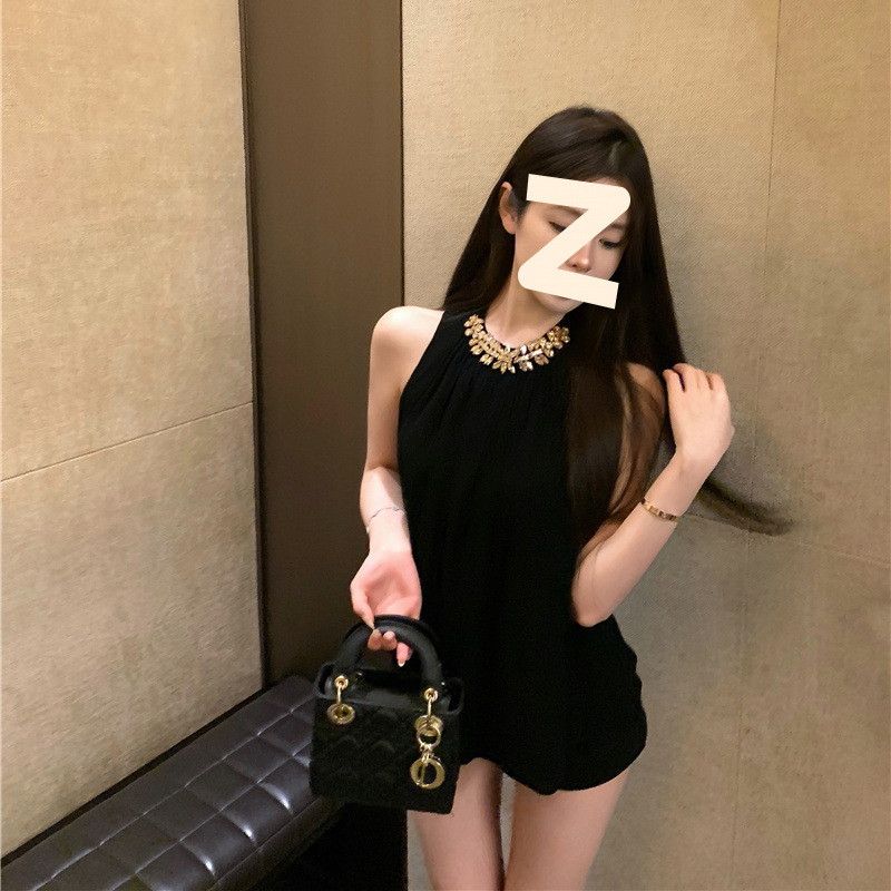 검은 매달려 목 민소매 쉬폰 셔츠 여성의 2025 년 여름 새로운 도착 중공업 다이아몬드 체인 느슨한 슬리밍 셔츠 핫 걸 탑