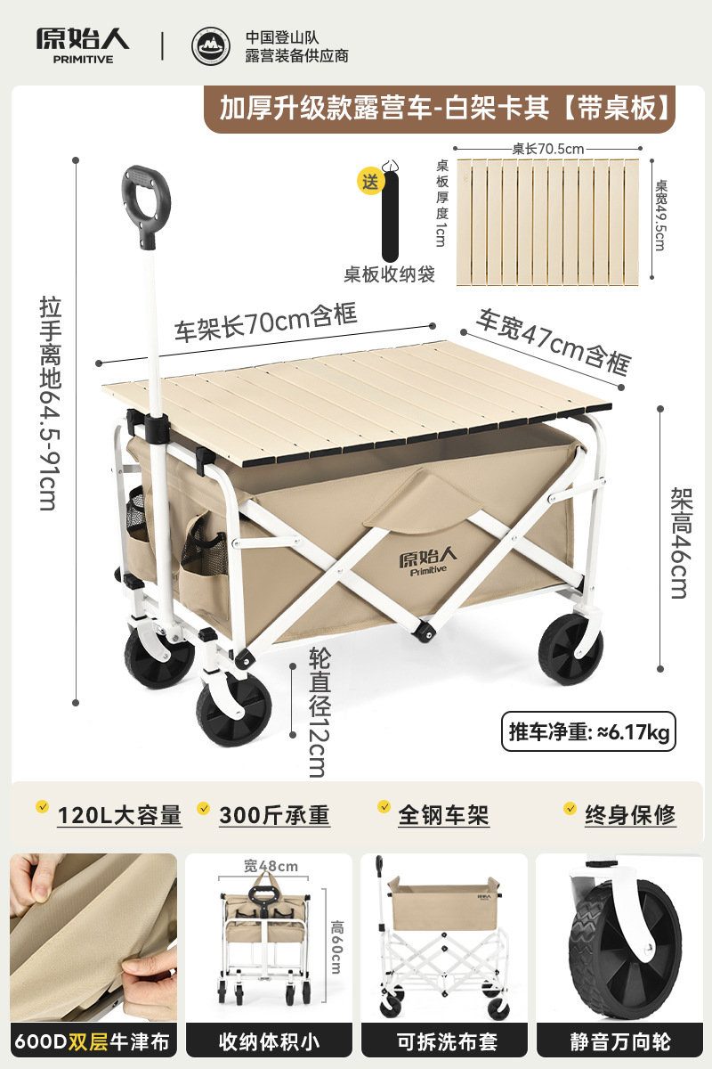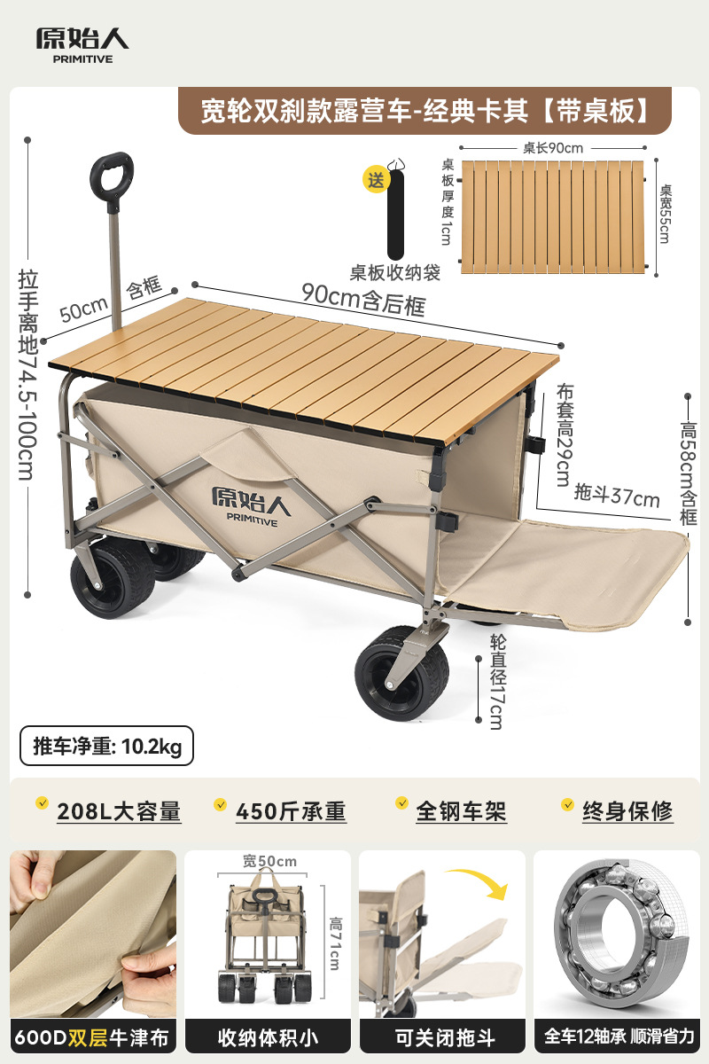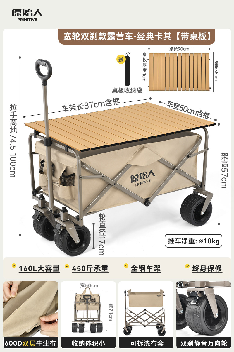 • 와이드 휠 더블 브레이크 캠핑카 - 클래식 카키 + 접이식 휴대용 테이블