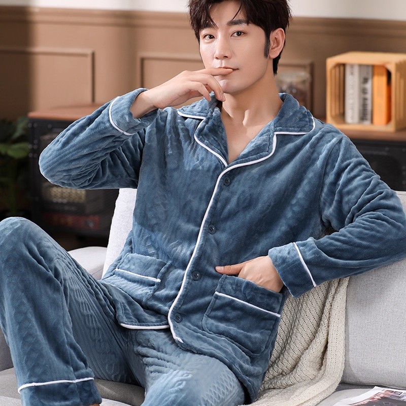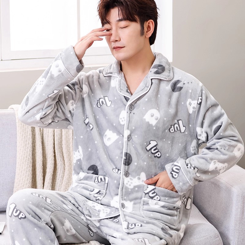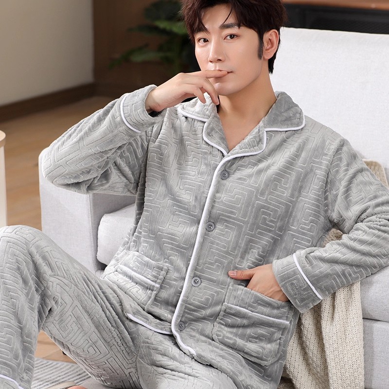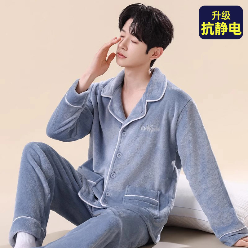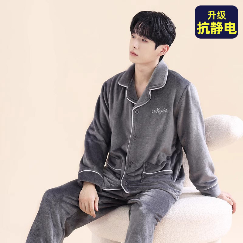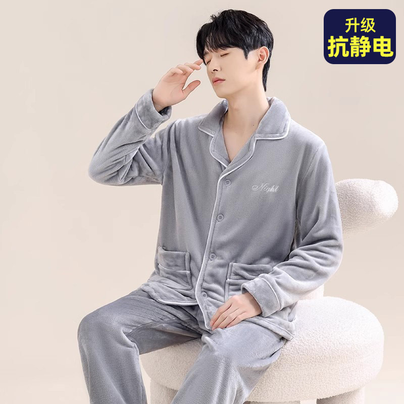 남성용 잠옷 남성용 플러스 벨벳 두꺼운 산호 벨벳 정전기 방지 긴팔 남성용 플란넬 홈웨어 가디건 가을 겨울용스토어 가기