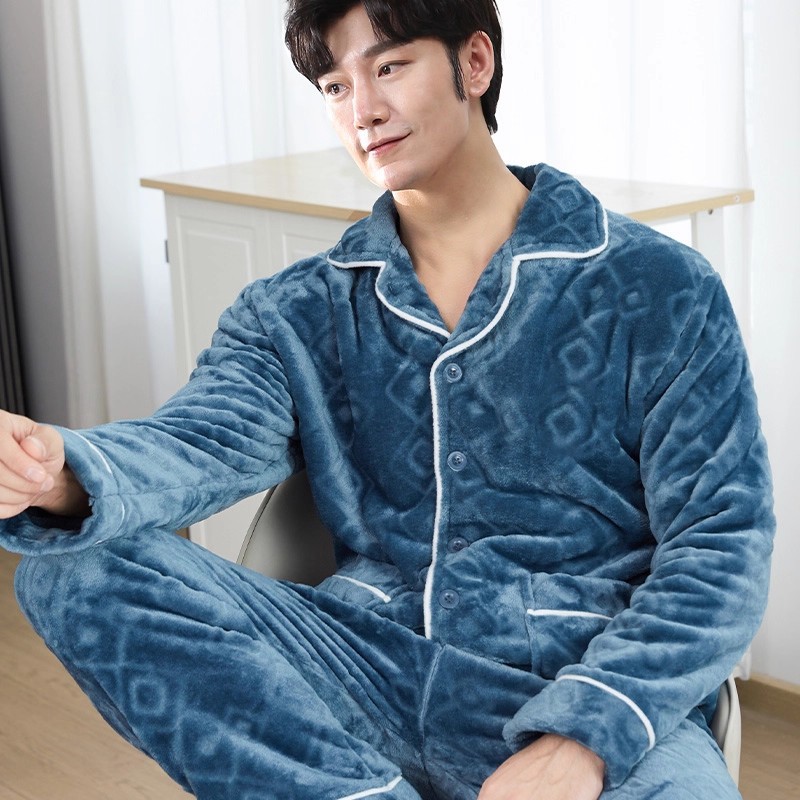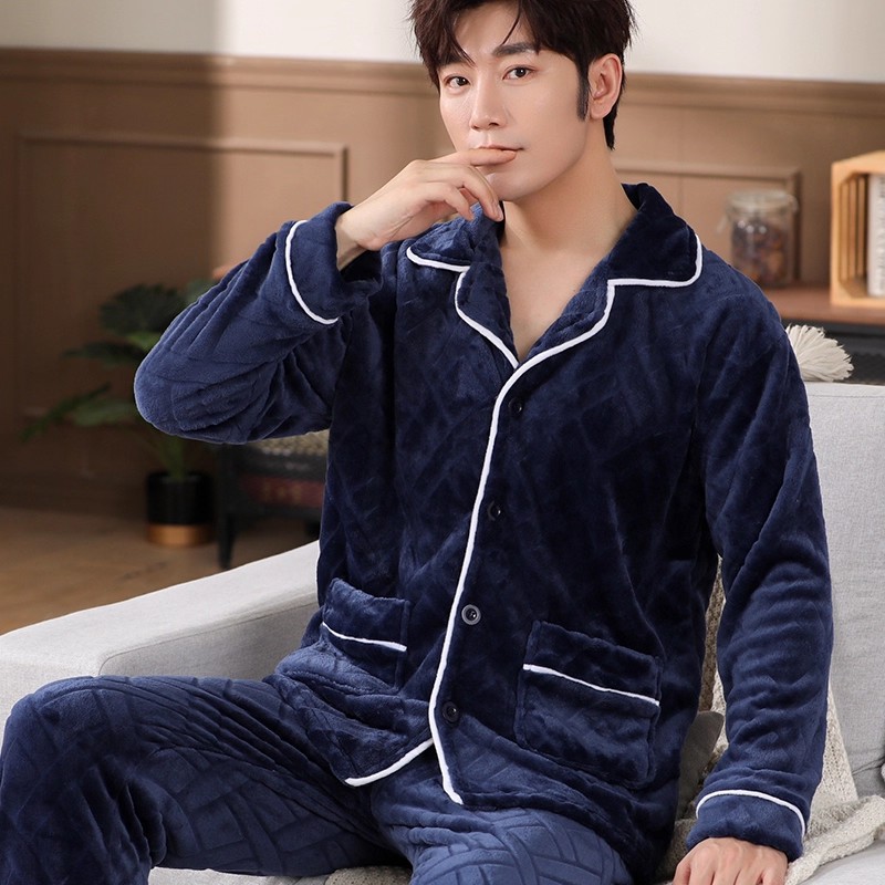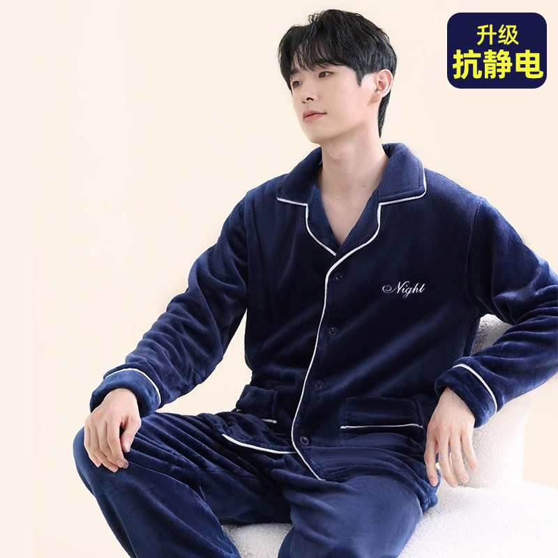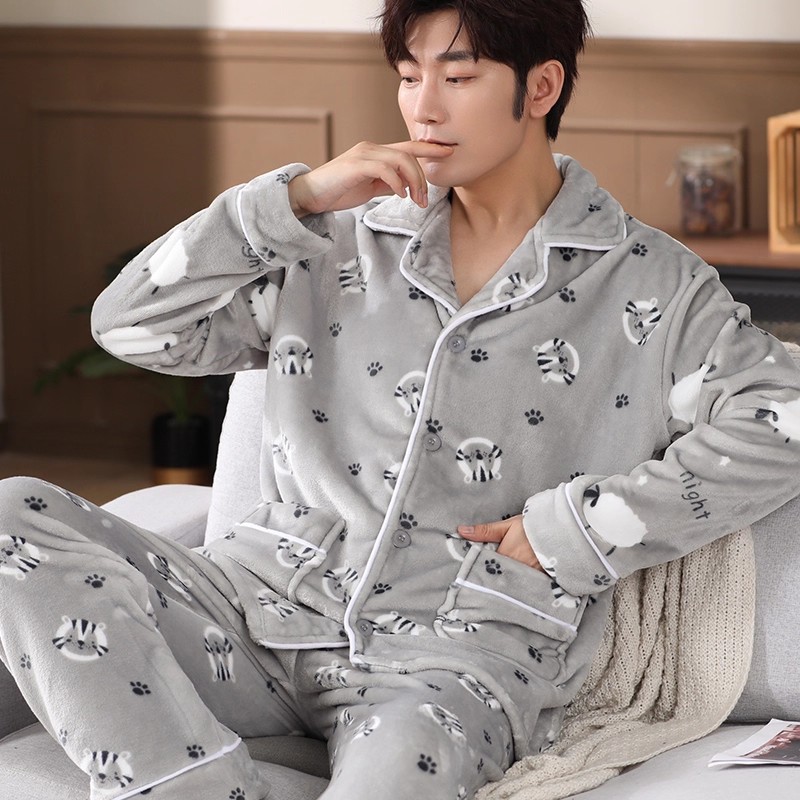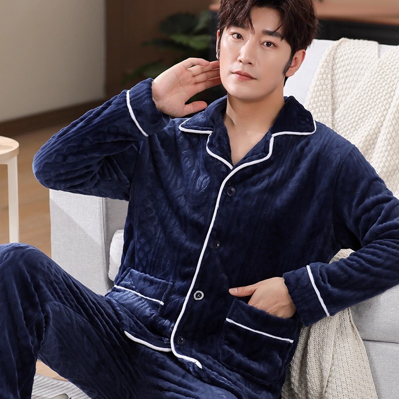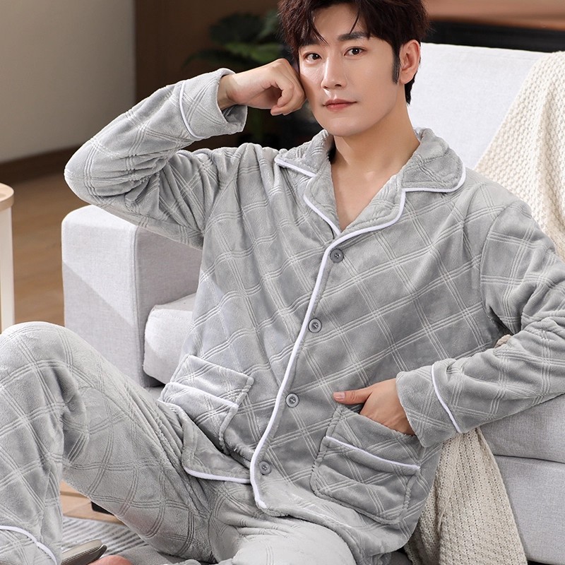 남성용 잠옷 남성용 플러스 벨벳 두꺼운 산호 벨벳 정전기 방지 긴팔 남성용 플란넬 홈웨어 가디건 가을 겨울용스토어 가기