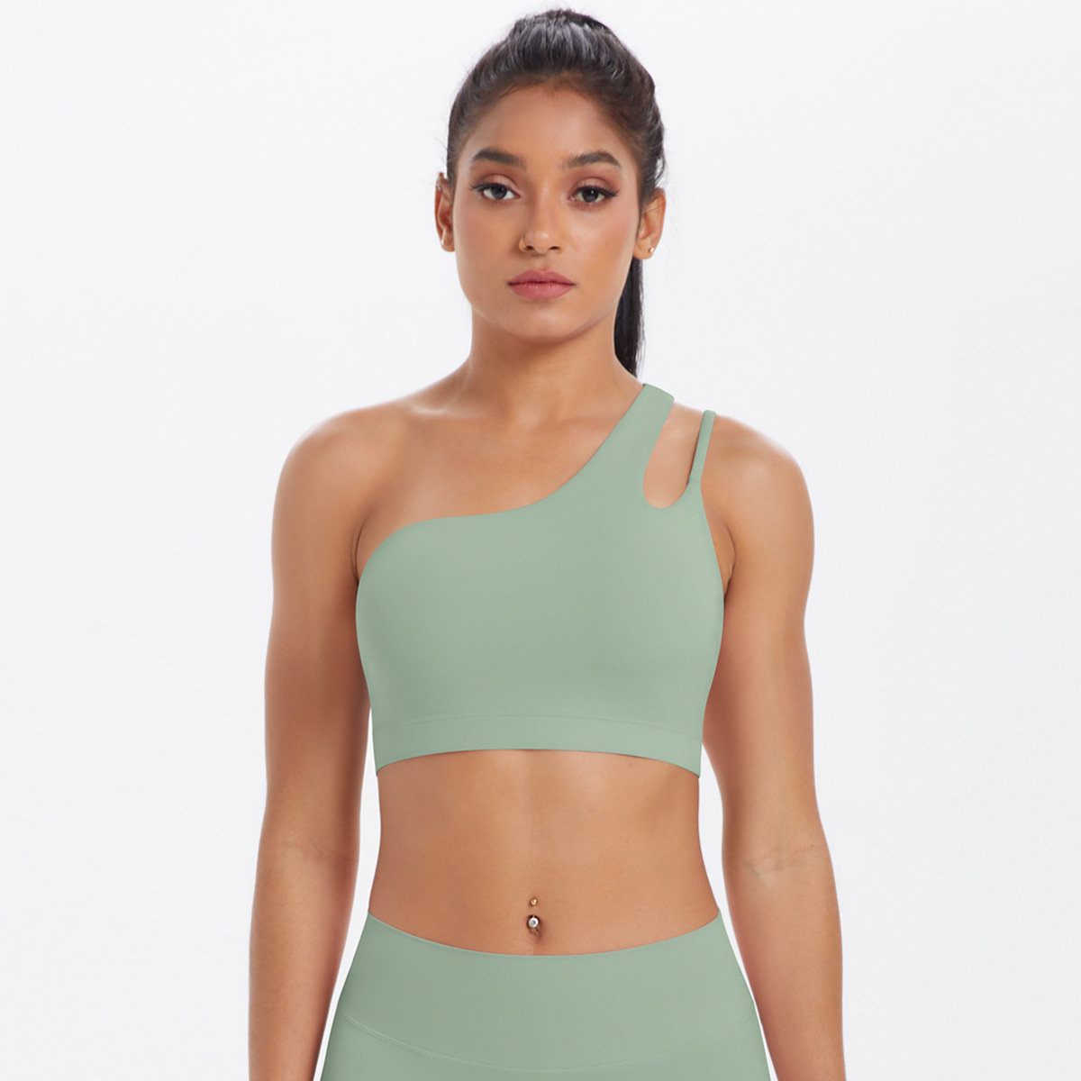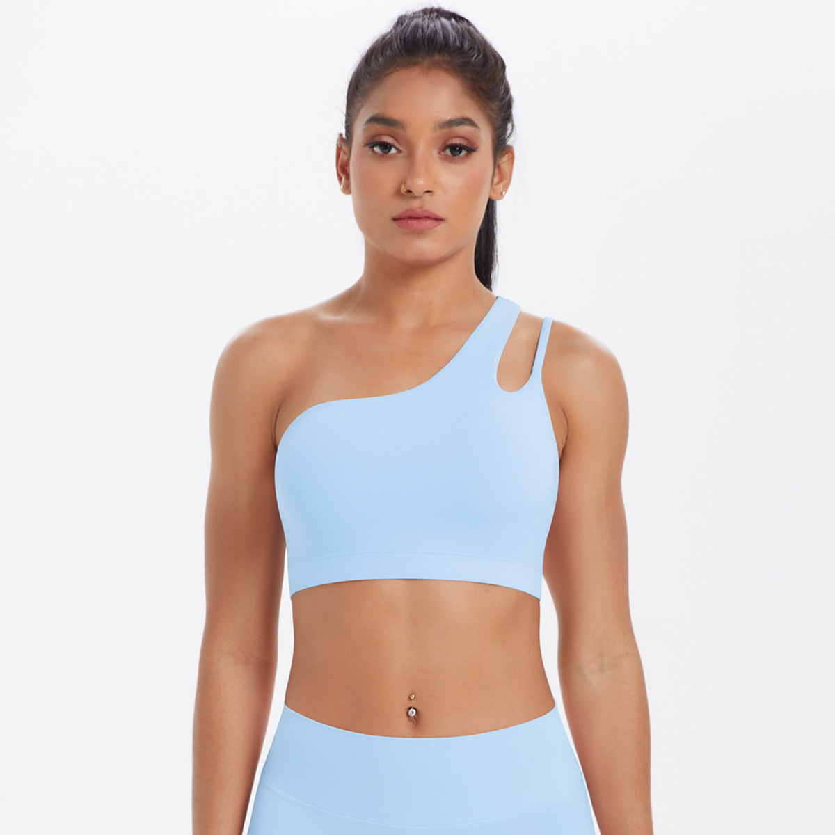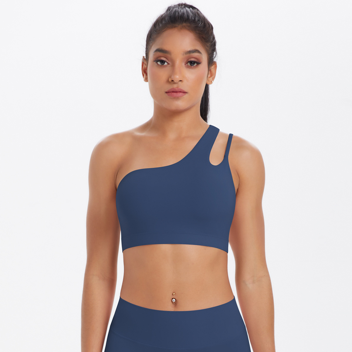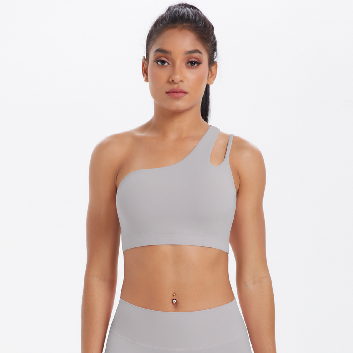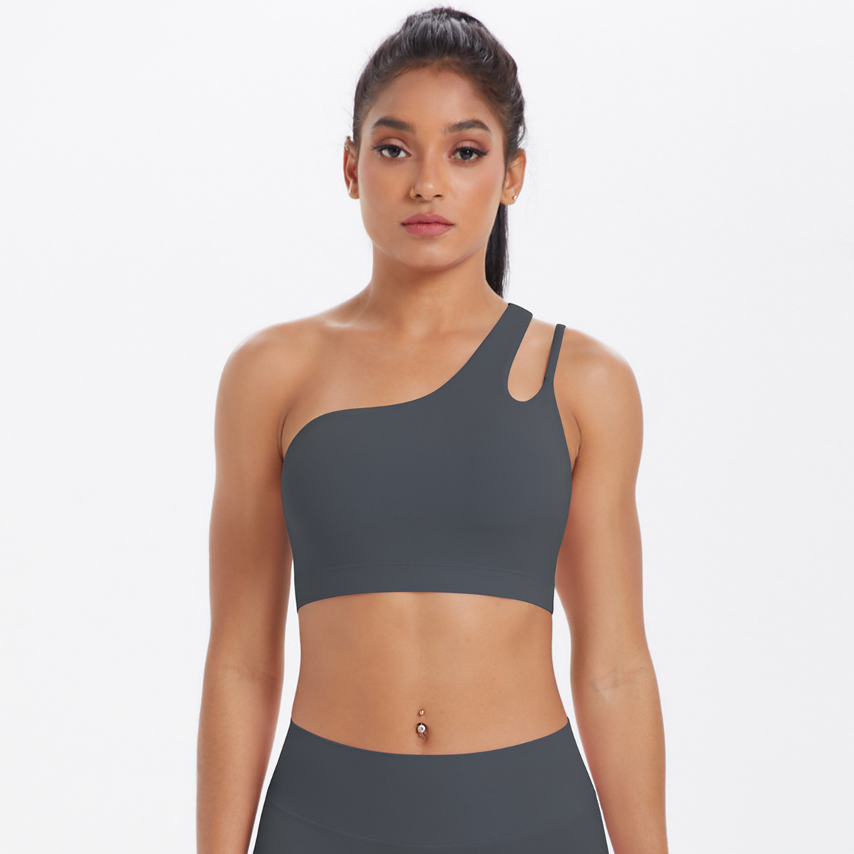 새로운 스타일의 비대칭 원 숄더 요가 브라, 누드 스포츠 브라, 불규칙한 어깨 끈, 런닝 피트니스 조끼 탑