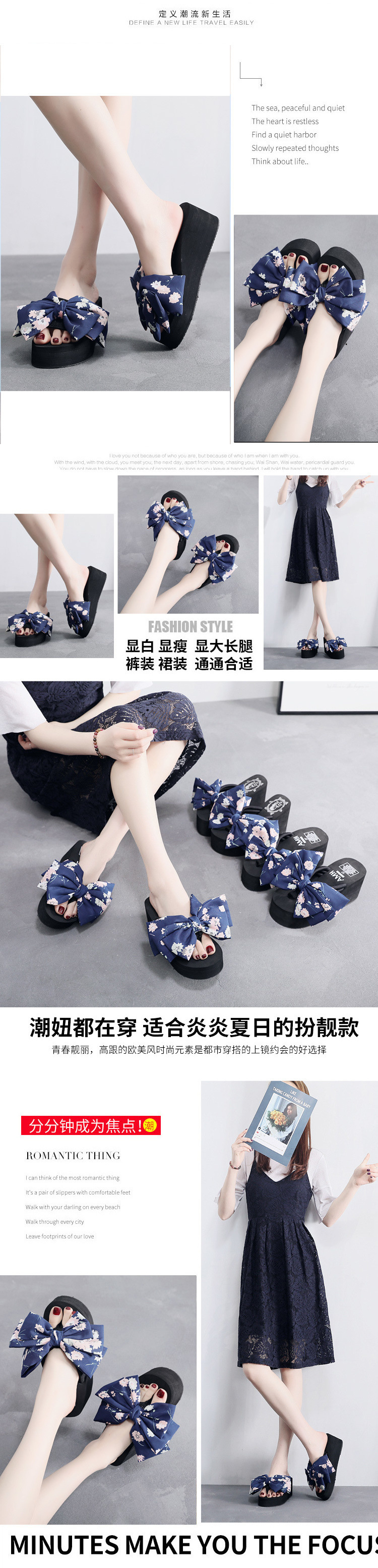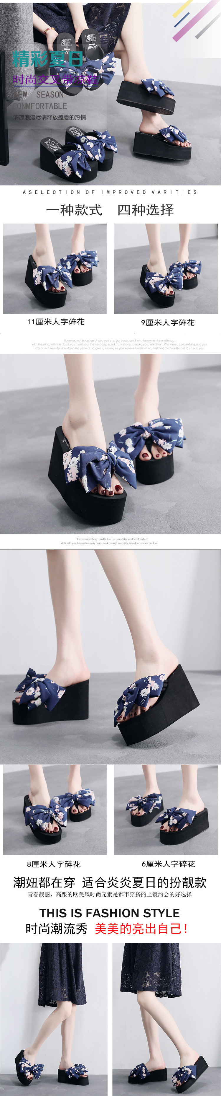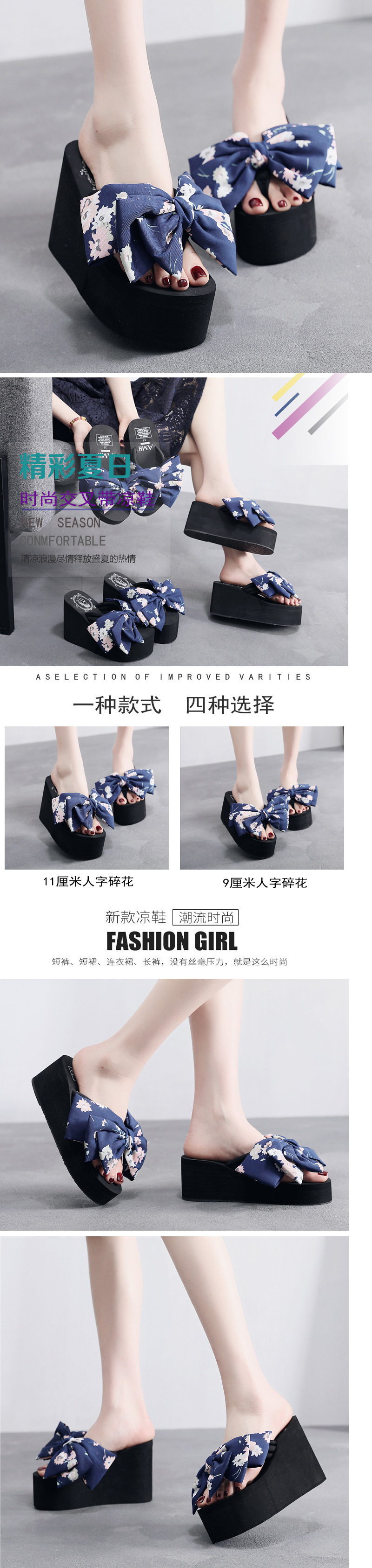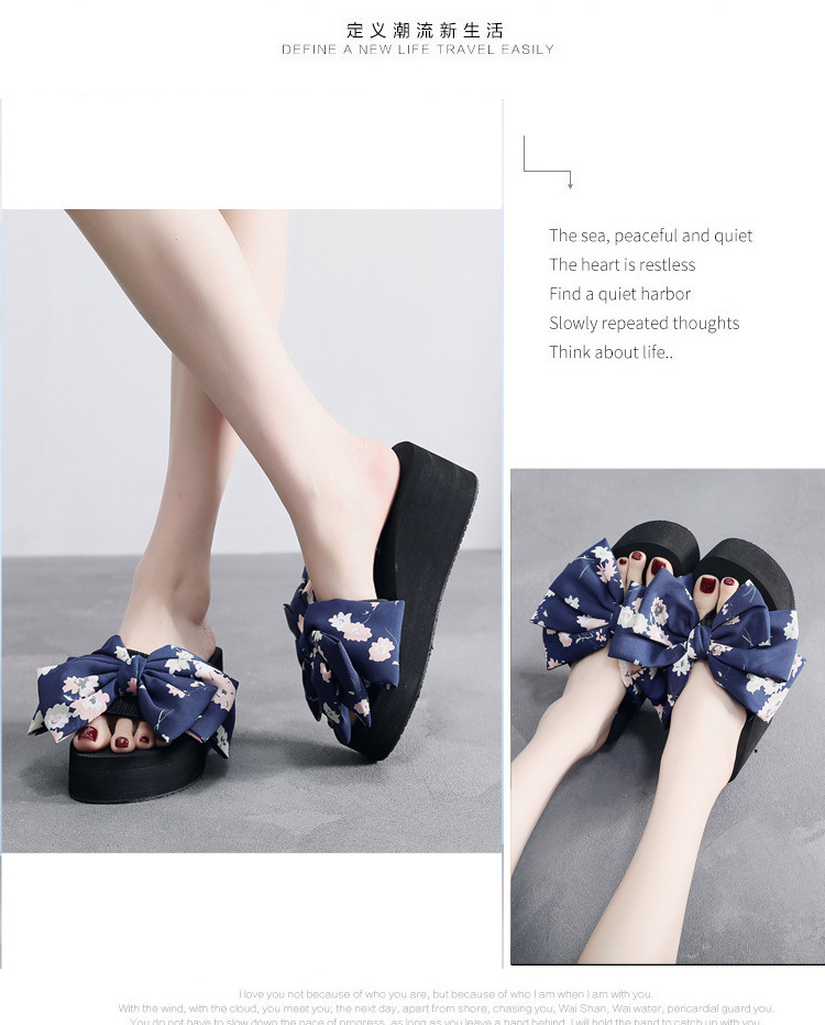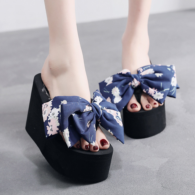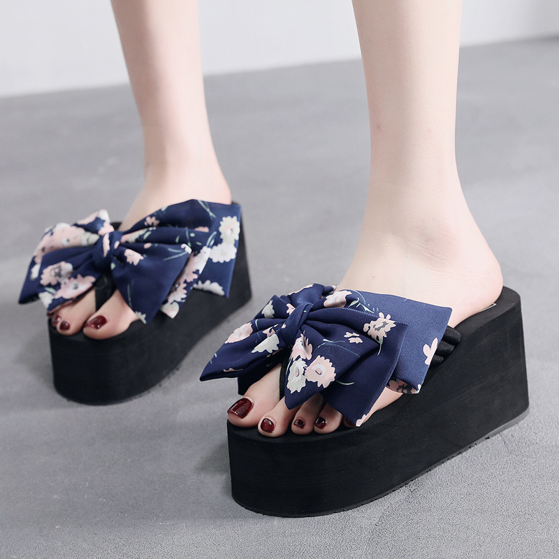 11cm 비치 슈즈 플립 플롭 여성 샌들 해변 패션 휴가 착용 두꺼운 밑창 웨지 힐 꽃무늬 리본스토어 가기