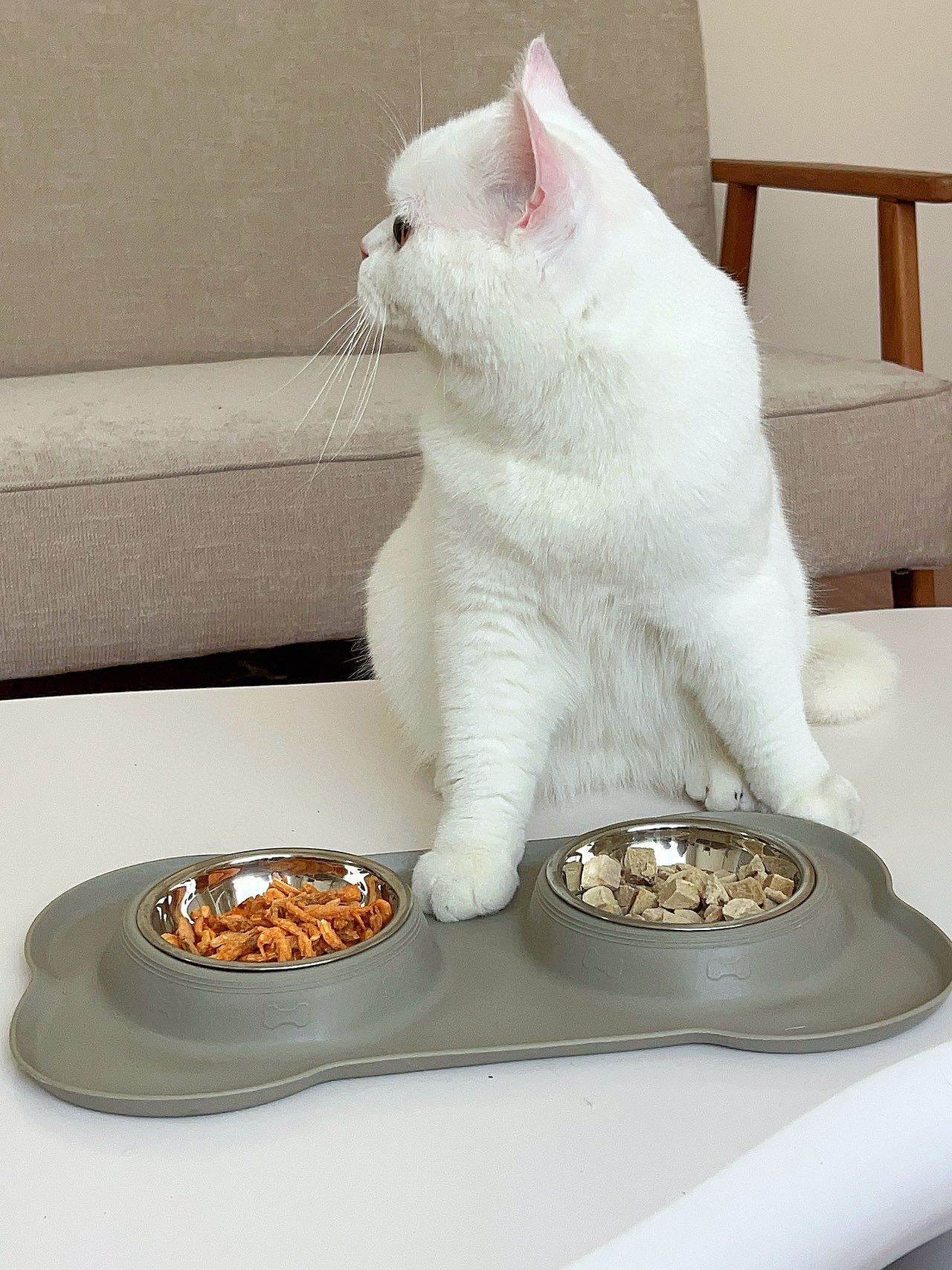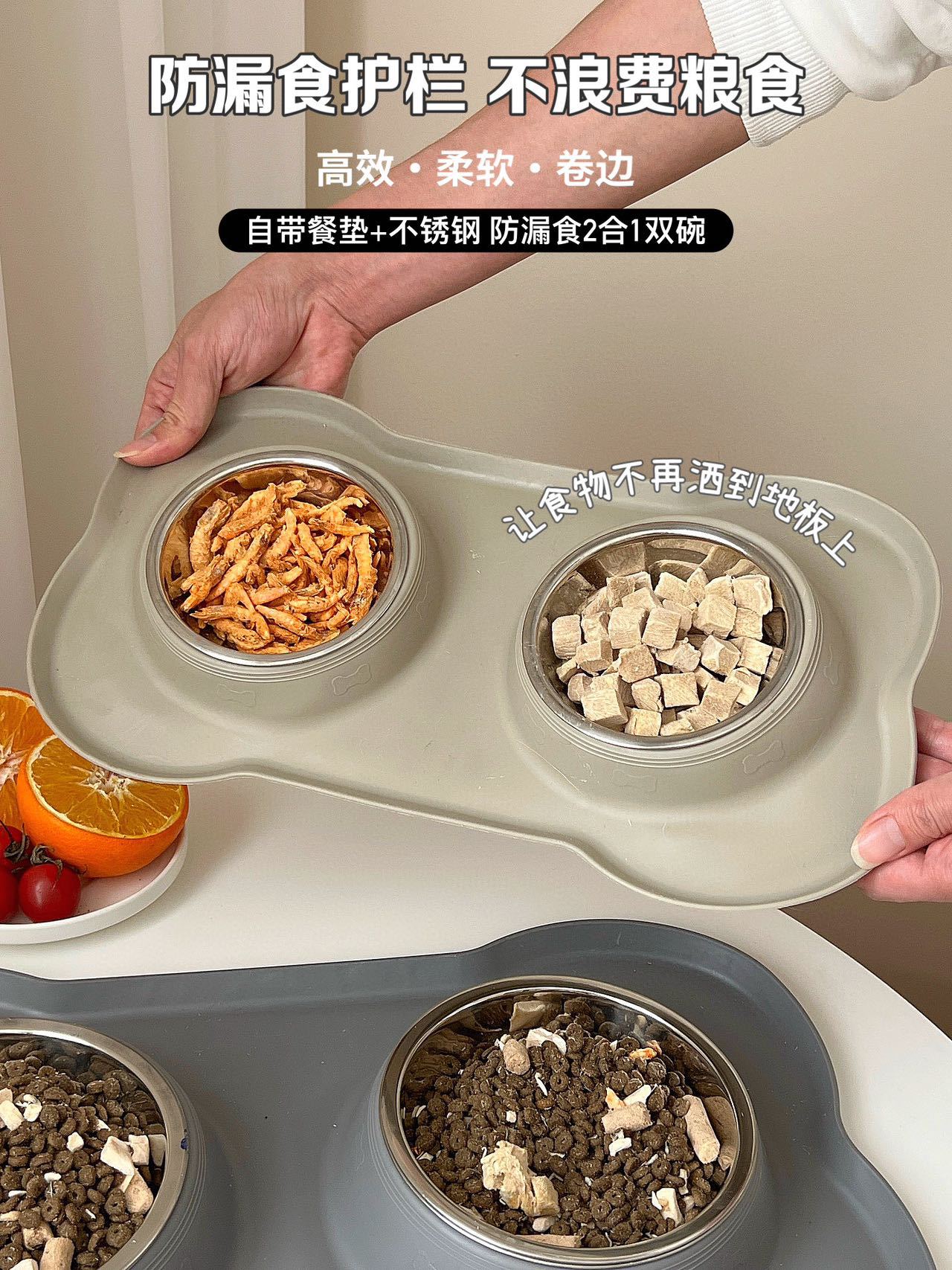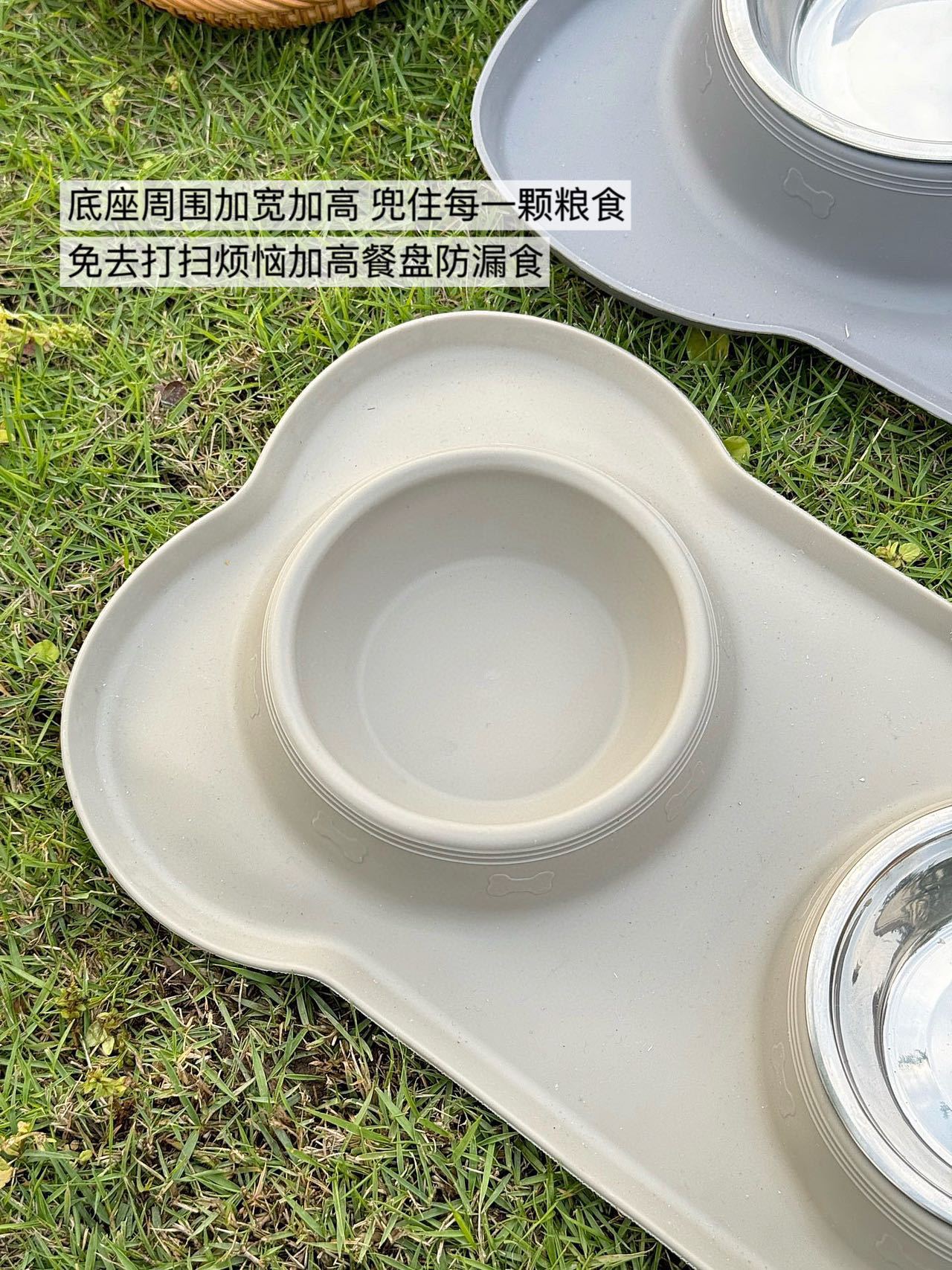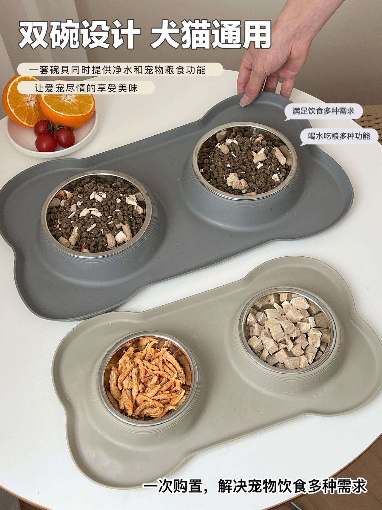 分离式的双碗设计,犬猫通用。底部的防漏食护栏可以防止食物溅出