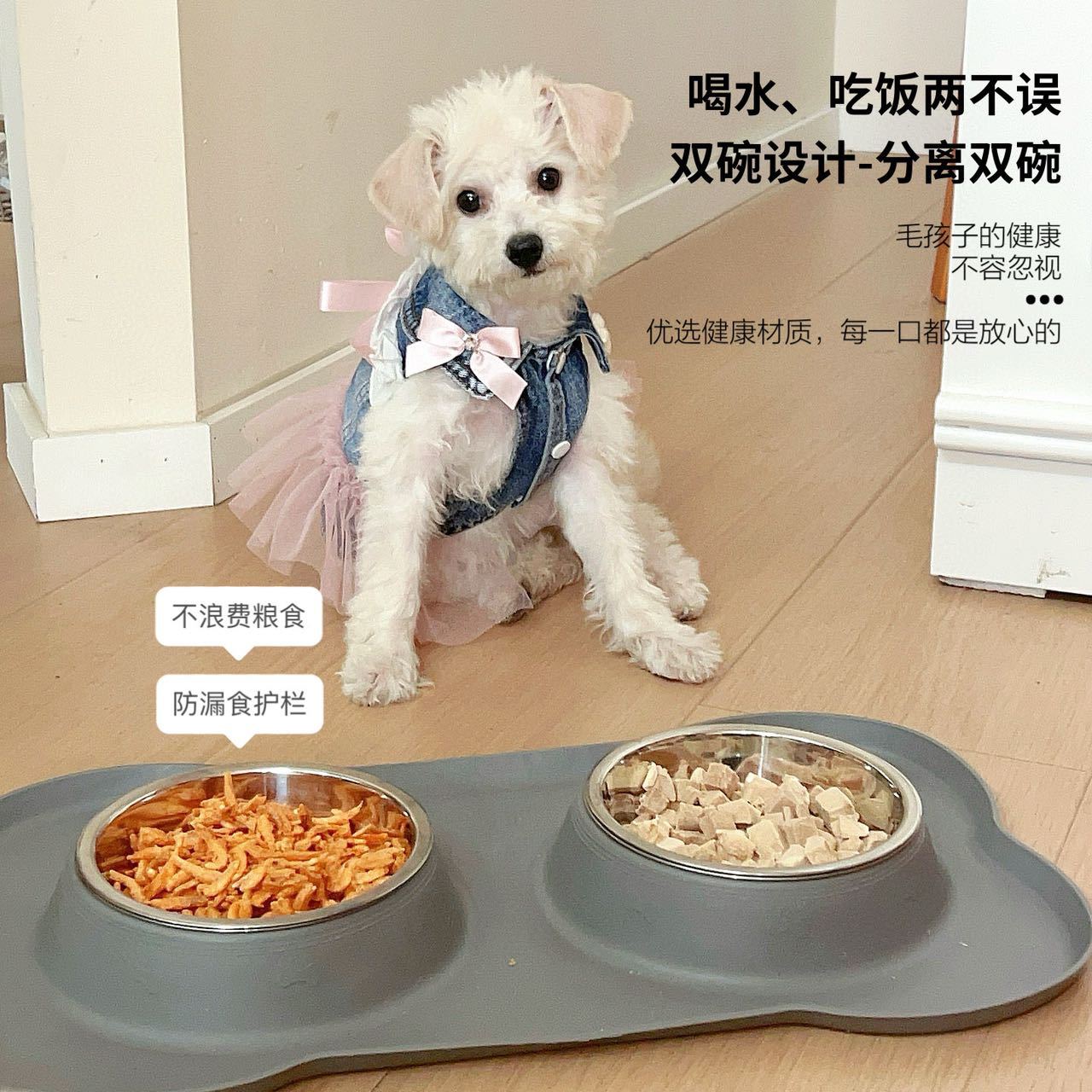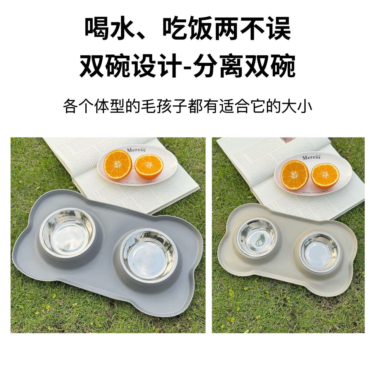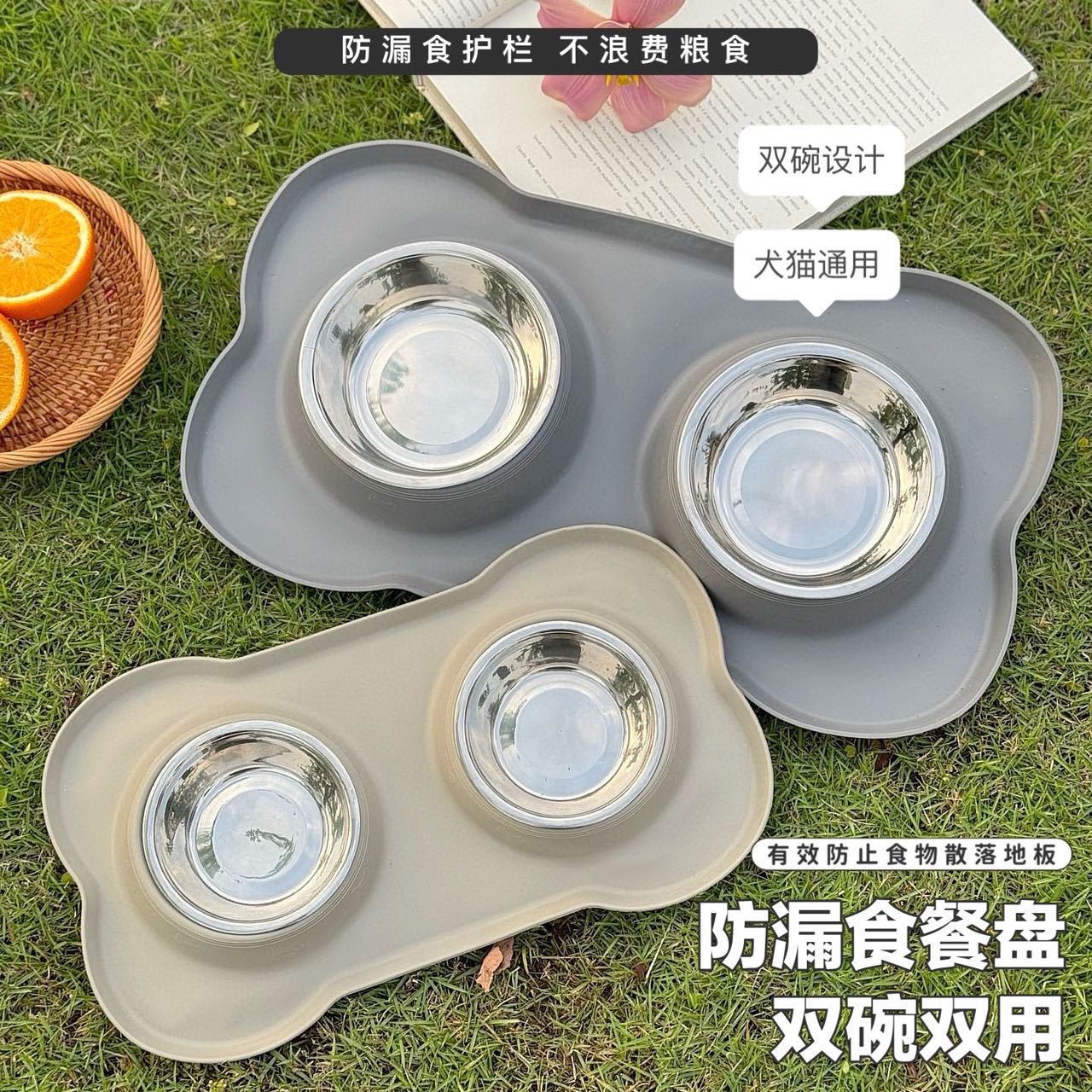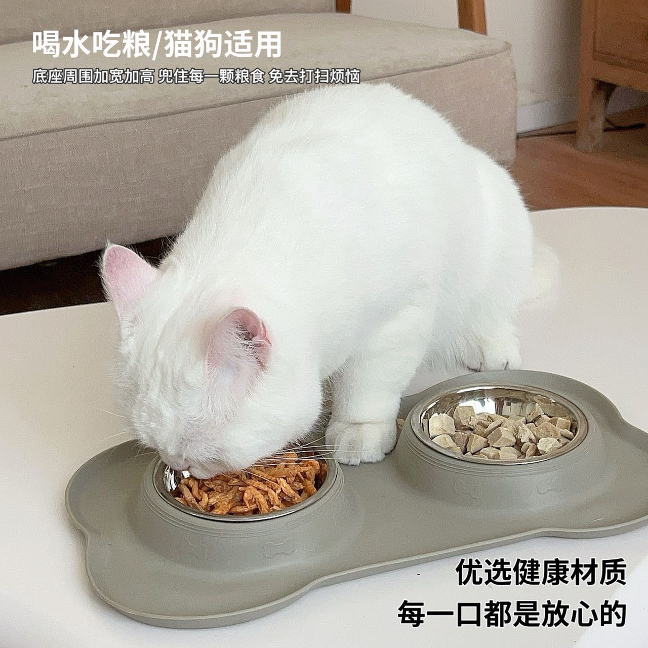 分离式的双碗设计,犬猫通用。底部的防漏食护栏可以防止食物溅出