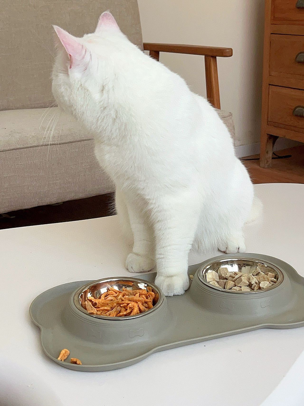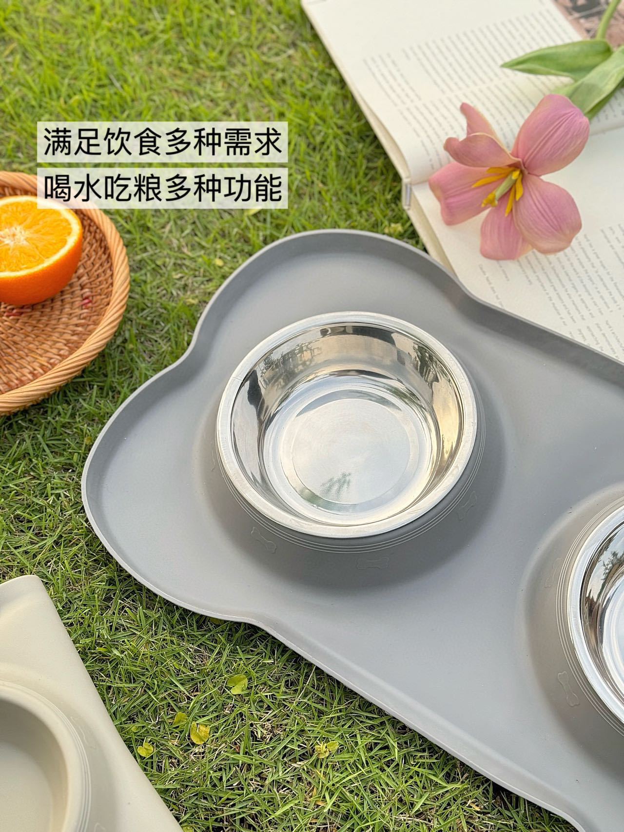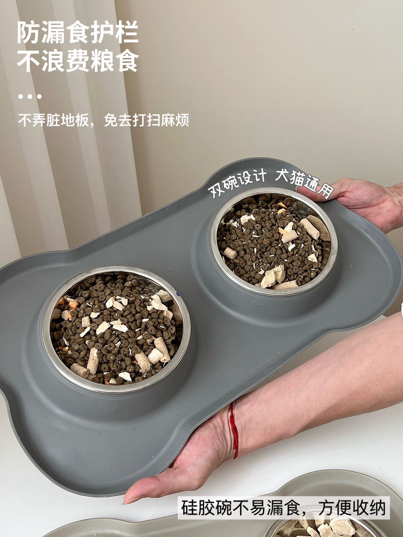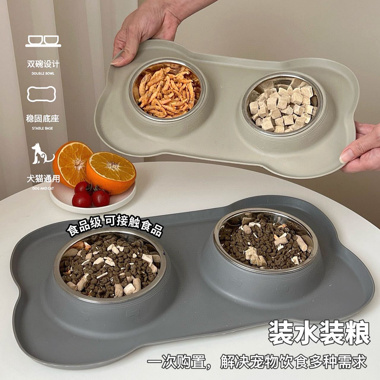 分离式的双碗设计,犬猫通用。底部的防漏食护栏可以防止食物溅出