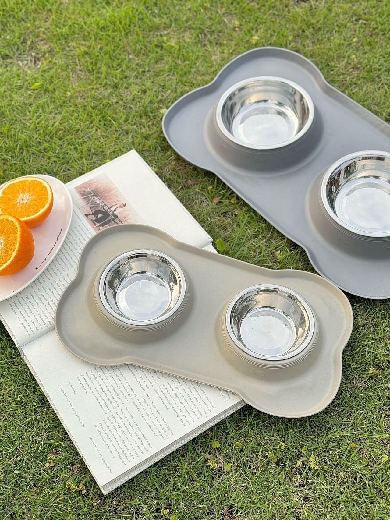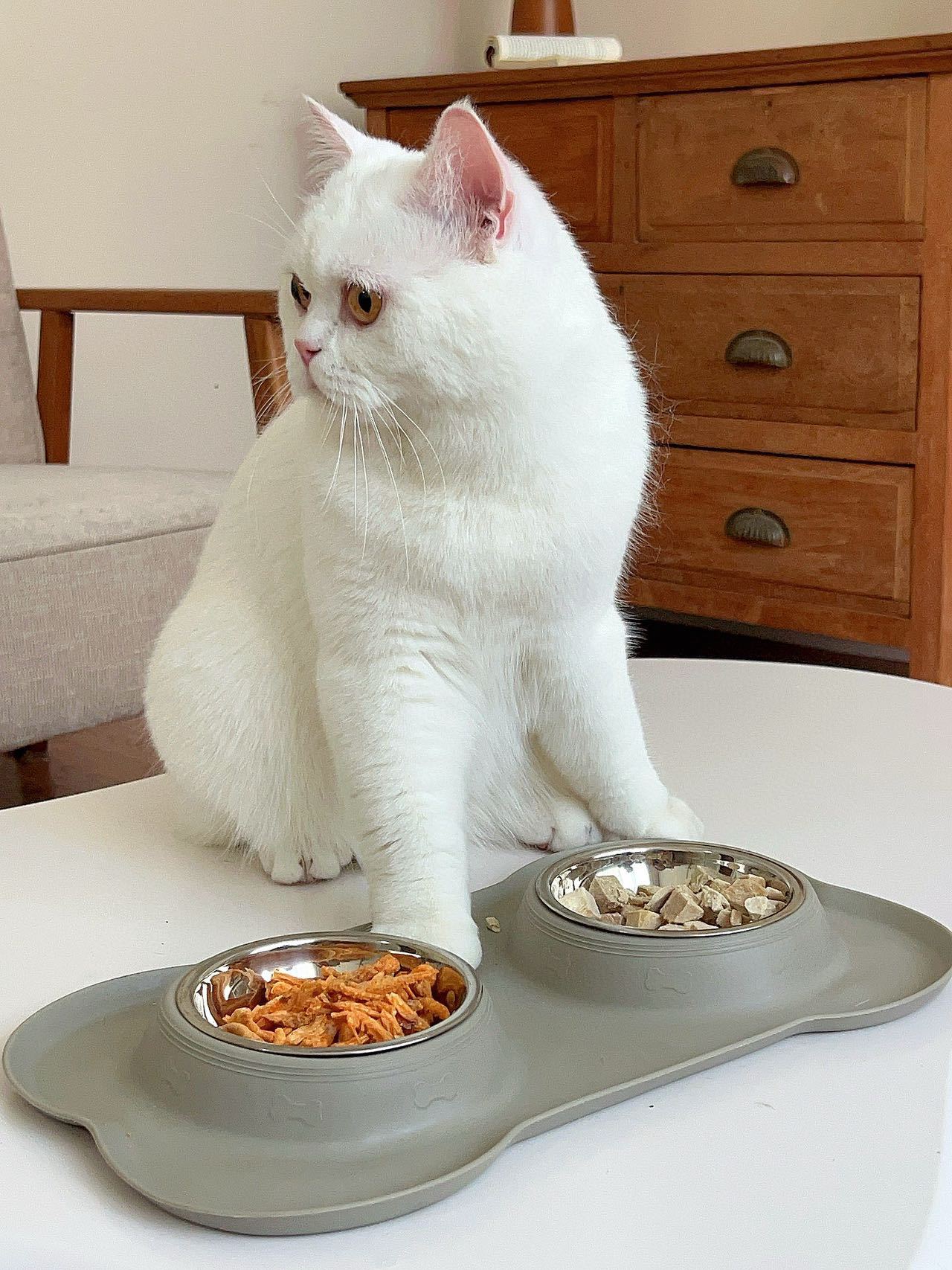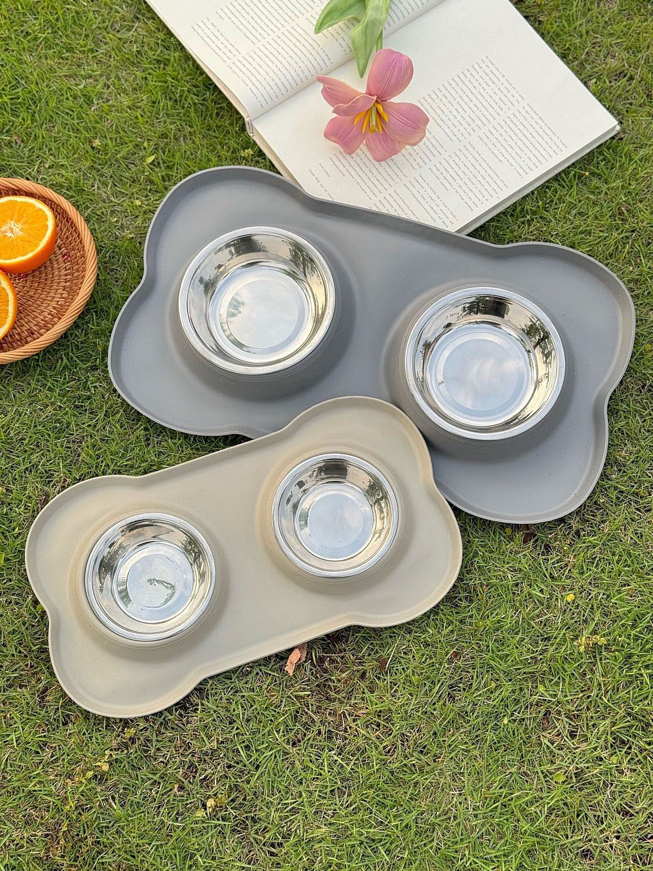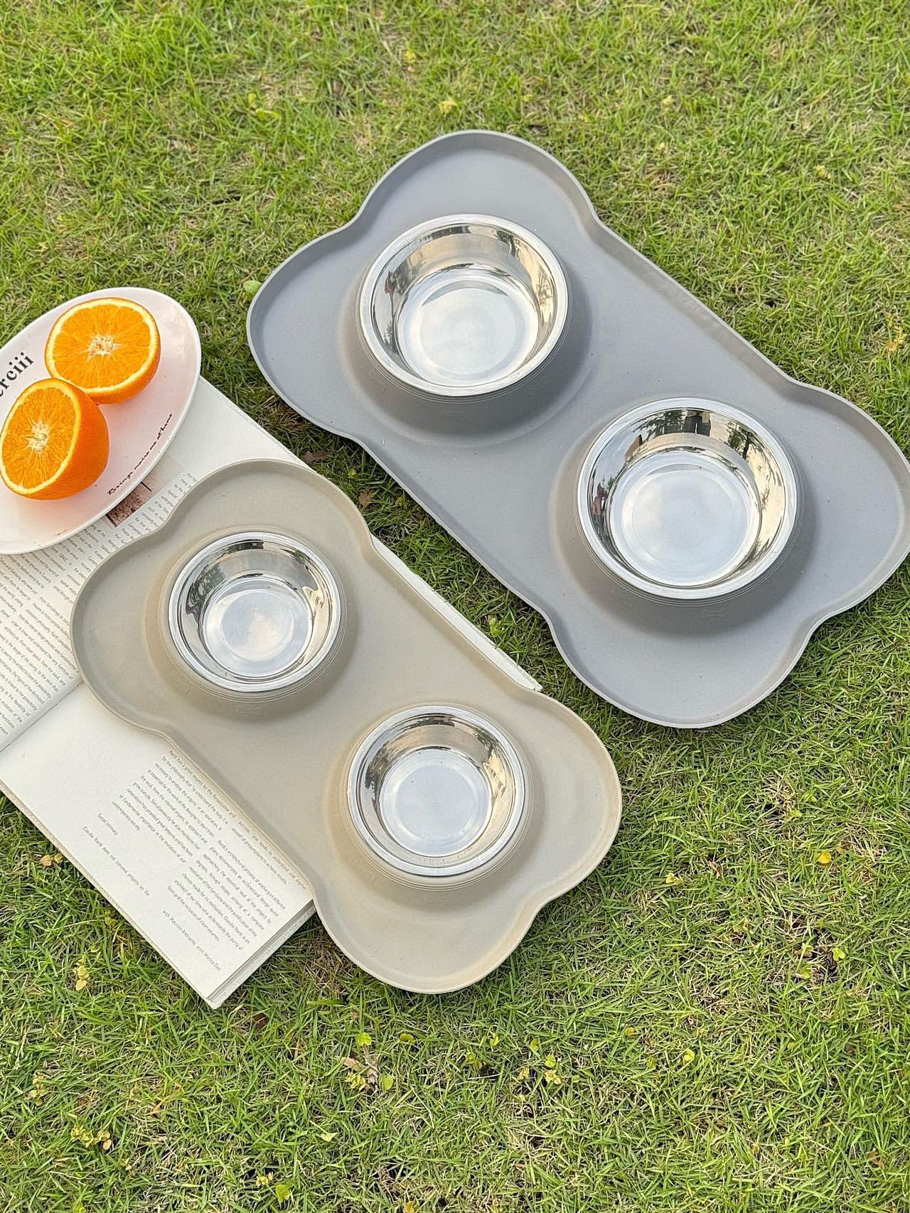 分离式的双碗设计,犬猫通用。底部的防漏食护栏可以防止食物溅出
